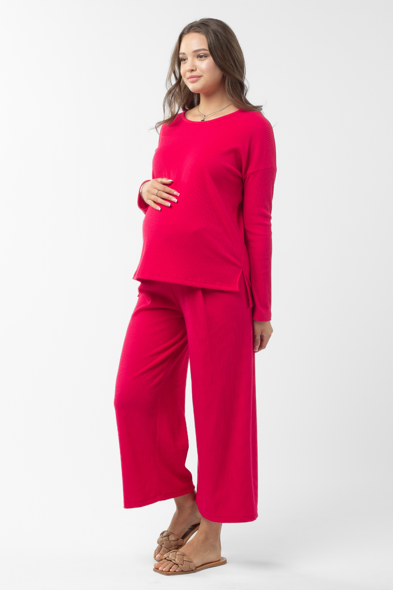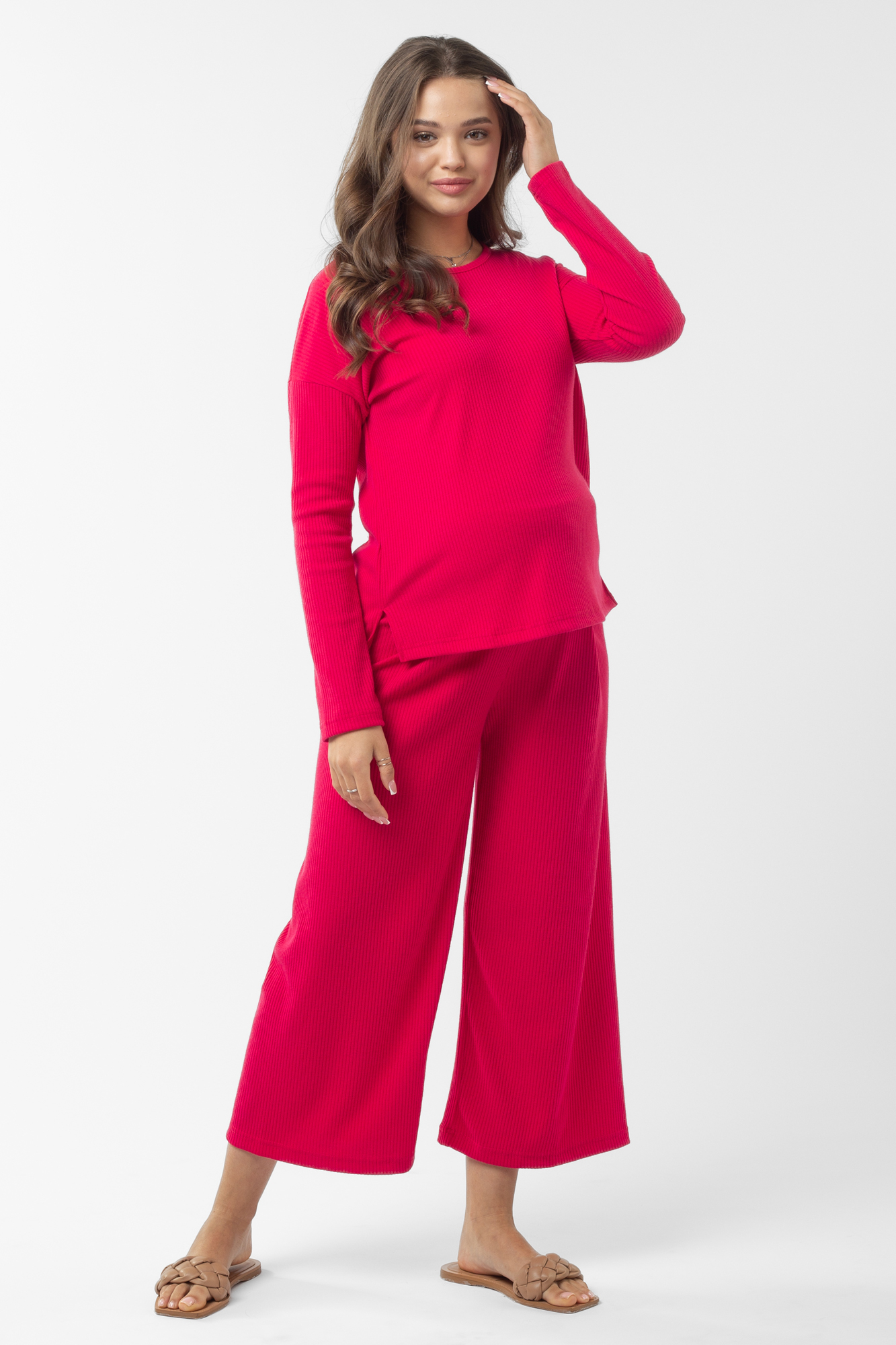 Оригинальный костюм в рубчик для беременных. Костюм состоит из джемпера и брюк. Джемпер с округлым вырезом горловины, длинным рукавом, заниженной линией плеча, разрезами по бокам изделия. Брюки-кюлоты с эластичной высокой вставкой-бандажом рассчитаны на весь период беременности. Идеальное сочетание стиля и комфорта!