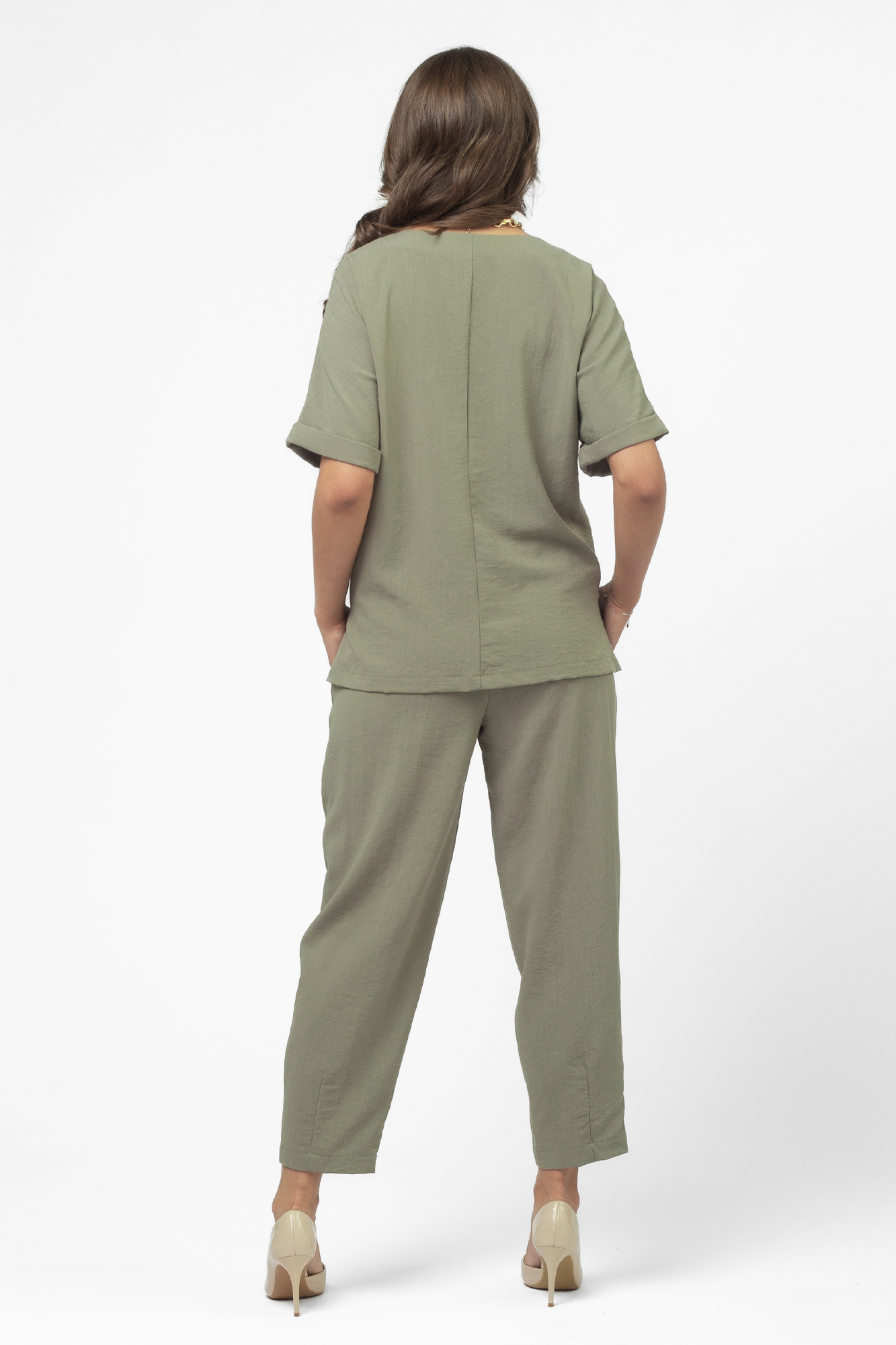 Стильный костюм для беременных выполнен из смешанного материала с добавлением вискозы. Комплект состоит из двух вещей: футболки и брюк. Футболка свободного кроя, что позволяет носить ее с особым комфортом на любом сроке беременности и после родов. Футболка имеет удлиненный рукав, декоративные разрезы по бокам и немного удлиненный крой. Брюки слоучи с защипами имеют свободную посадку и прямой крой. Для особого удобства добавлен эластичный бандаж с регулировкой, перестегивающейся на пуговицу, что позволяет носить брюки на любом сроке беременности. Костюм отлично сочетается с туфлями босоножками или кроссовками, подходит для офиса или просто для прогулок на каждый день.