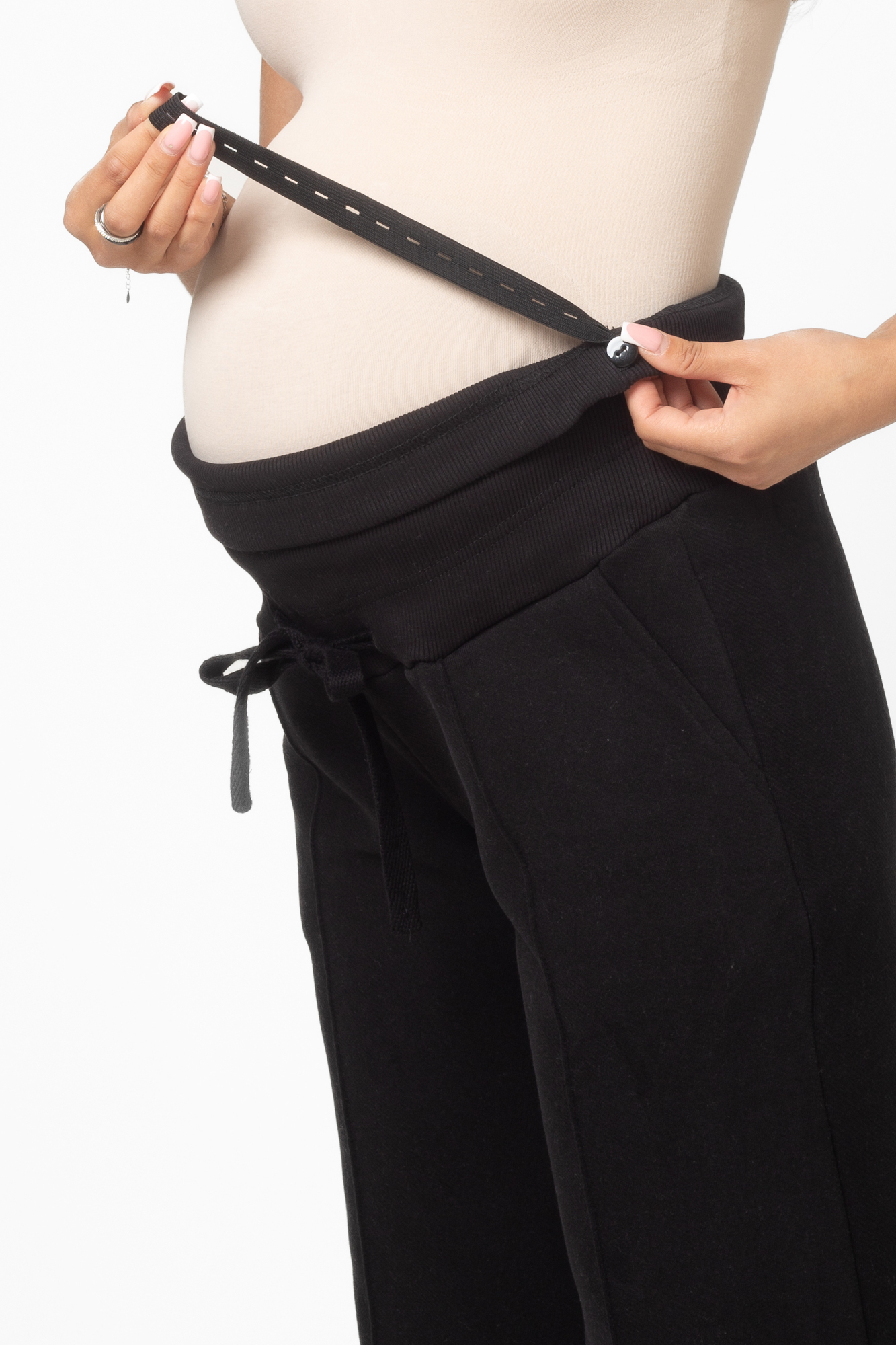 Стильные повседневные брюки для беременных из футера велюра c начесом. Высокий эластичный бандаж мягко и деликатно поддерживает растущий животик. Объем регулируется шнурками в поясе и перфорированной резинкой, перестегивающейся на пуговицу, что позволяет носить брюки от начала до конца беременности и после родов. Невероятно комфортная модель для прогулок, занятий спортом и просто на каждый день.