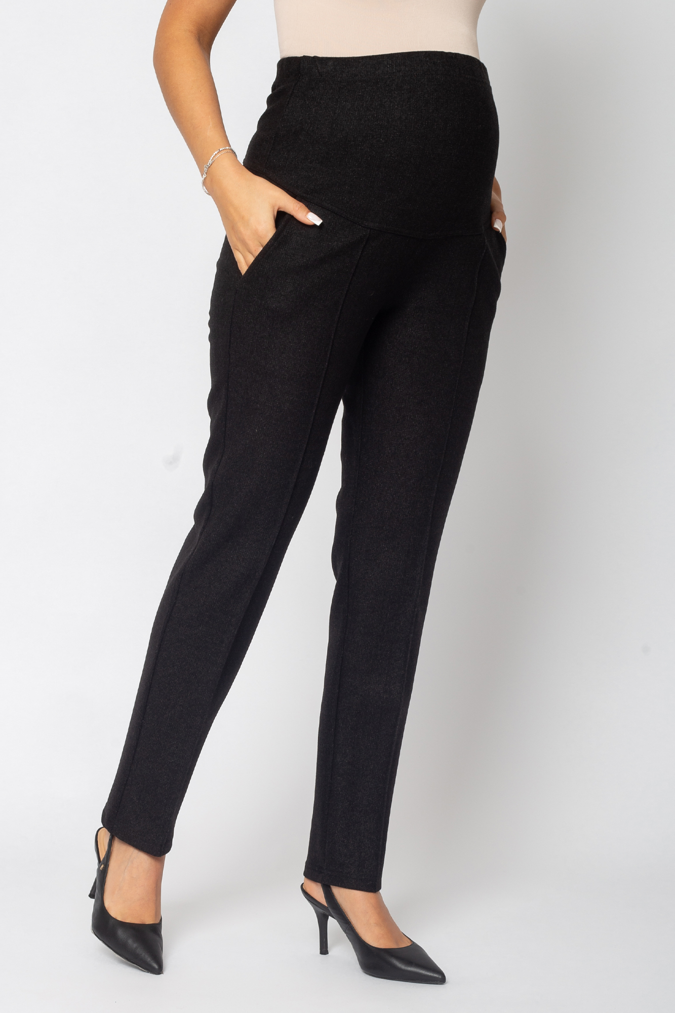 Зауженные брюки для беременных сшиты из теплого трикотажа джерси с начесом. Состав: 65% Вискоза 30% Полиэстер 5% Лайкра. Стильная трикотажная модель для повседневного гардероба будущей мамы. Женские зимние брюки с завышенной талией оснащены поясом, выполняющим функцию бандажа. Пояс можно регулировать по мере роста животика с помощью скрытой резинки на пуговице. Такие штаны подойдут на любой срок беременности, а также и после нее. Крой брюк зауженный, спереди - отстроченные стрелки, высокая посадка. Предусмотрены карманы. Классические брюки отлично подходят для повседневных прогулок холодной осенью или зимой. В них будет комфортно в любую погоду или для офиса. Модель подойдет в качестве одежды женщинам больших размеров.