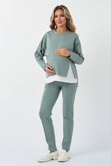 Утепленный костюм для беременных и кормящих с начесом сшит из плотного трехниточного футера с начесом. Материал мягкий и дышащий, поддерживает нормальную терморегуляцию и согревает. Спортивный костюм с брюками - идеальный демисезонный и зимний вариант повседневного образа для будущей мамы. В комплект включено две вещи: штаны и свитшот. Штаны - джоггеры оснащены высокой эластичной вставкой для живота с возможностью регулировки объема (за счет резинки на пуговице). Свитшот прямого кроя, рукава и низ дополнены манжетами на резинке, а также небольшими боковыми разрезами. Для комфортного кормления предусмотрены скрытые горизонтальные молнии. Теплый брючный костюм подойдет для прогулок с коляской, поездок за город, тренировок и пробежек. Модель представлена в укомплектованной размерной линейке и нескольких однотонных расцветках.