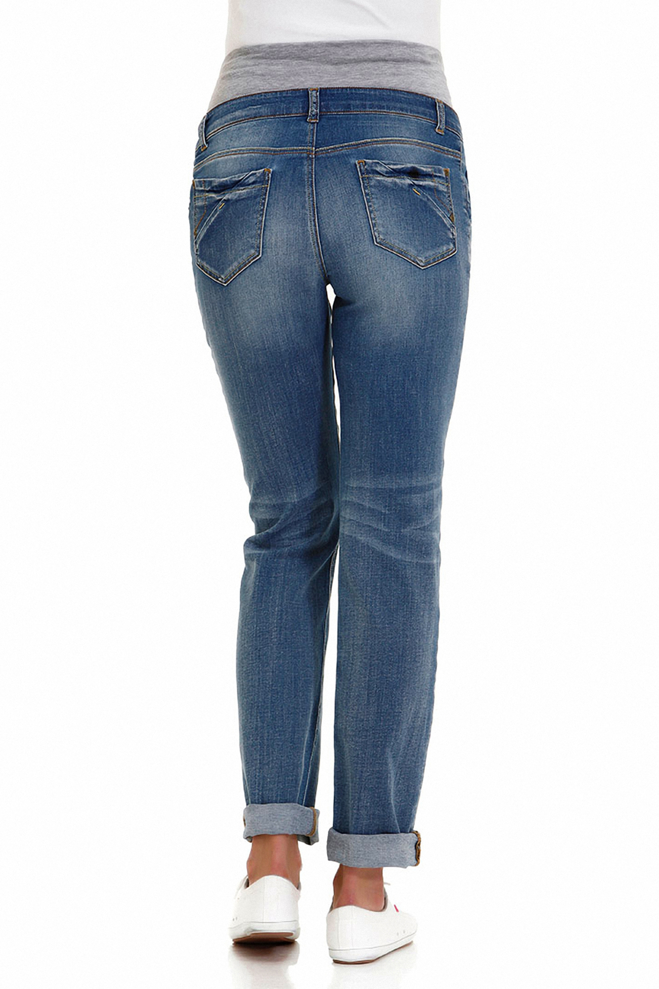Модель прямого кроя, средняя посадка без застёжки. Джинсы выполнены из мягкого эластичного денима. Детали: высокая трикотажная вставка для животика, три кармана спереди и два накладных кармана сзади, шлевки для ремня.