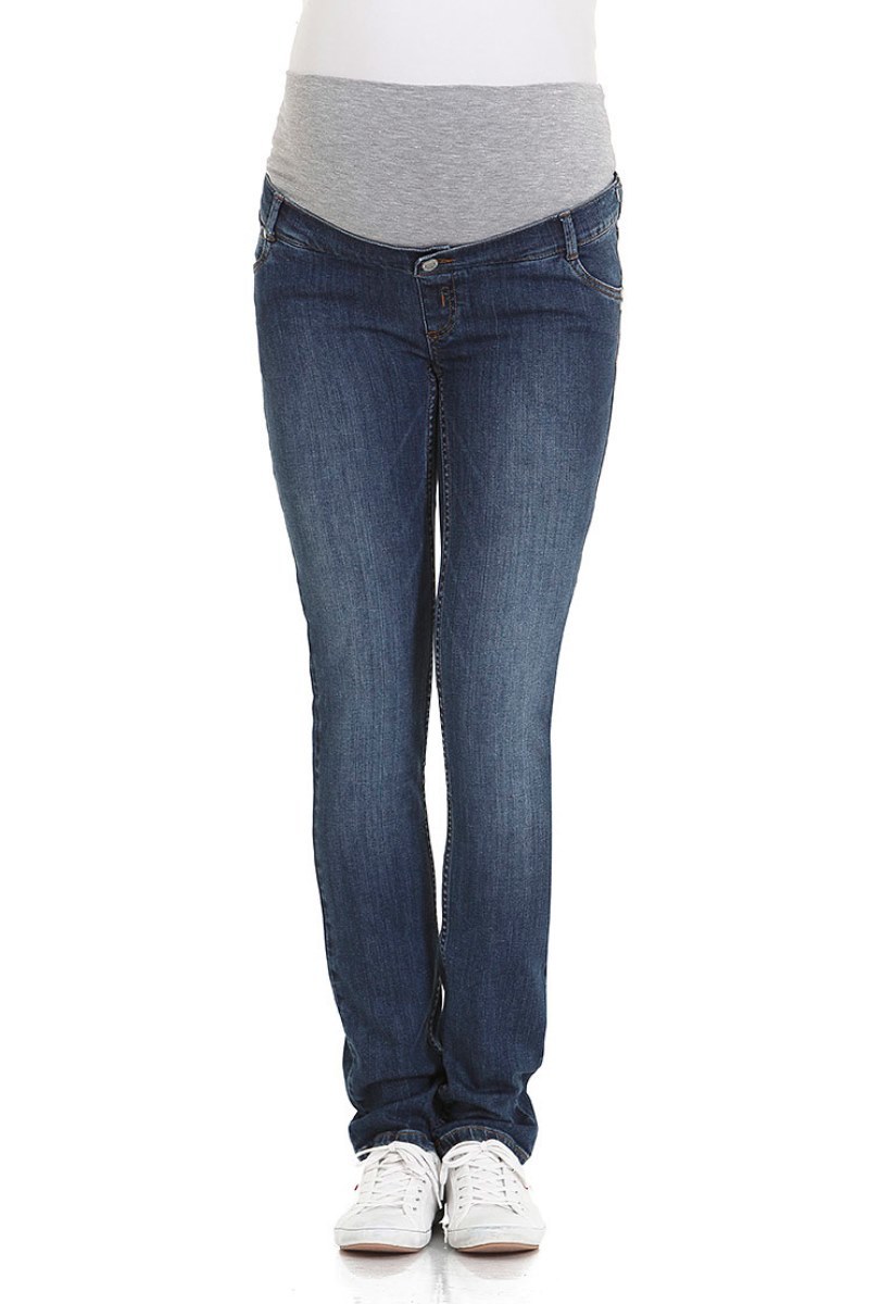 Джинсы для будущих мам. Средняя посадка, имитация застежки на пуговицу. Трикотажный бандаж поддерживает и растягивается по мере увеличения объема живота. Детали: три кармана спереди, два накладных кармана сзади, шлевки для ремня.