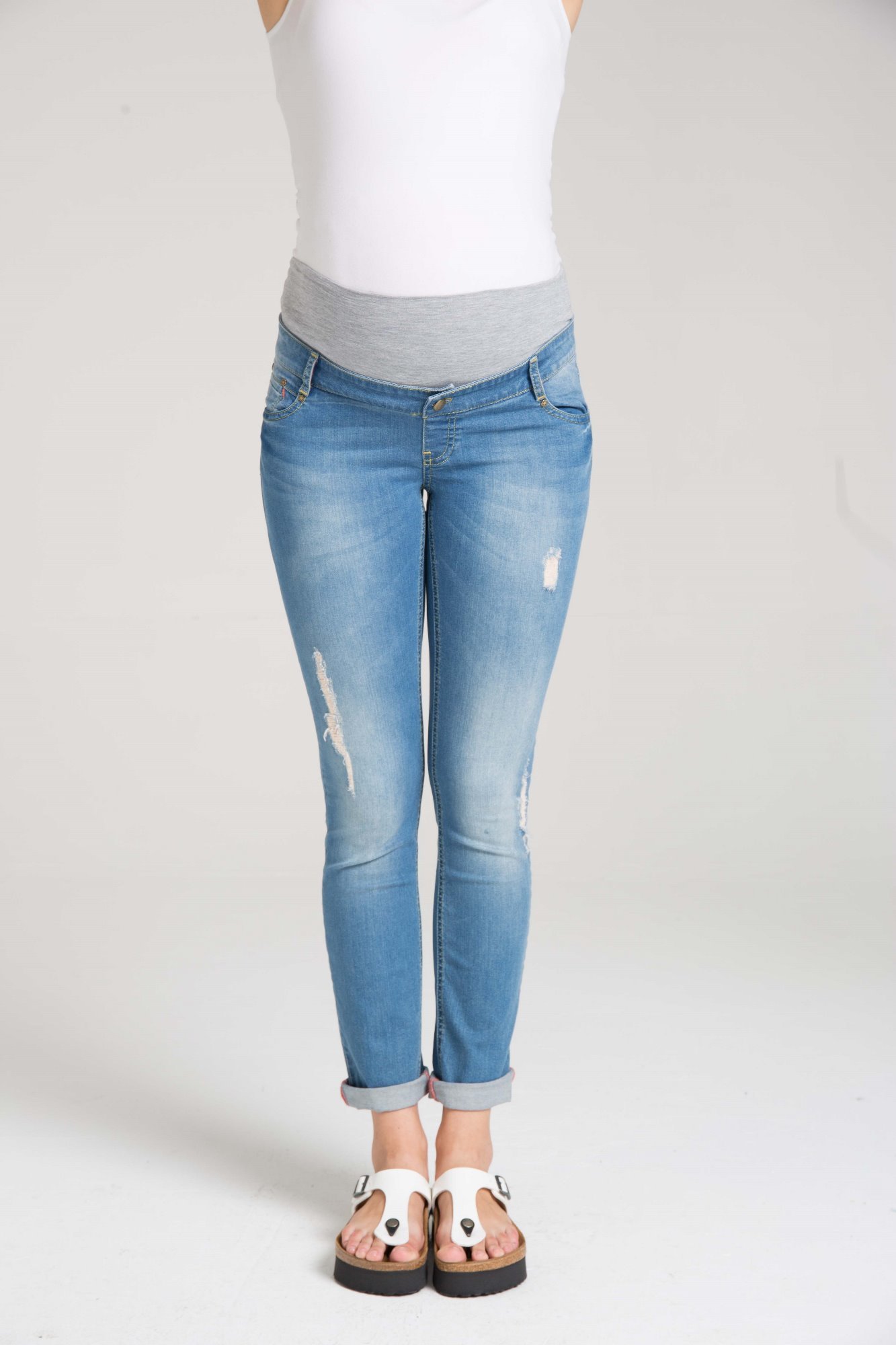 Джинсы для беременных выполнены из стрейчевого денима. Укороченная модель зауженного кроя c эффектом потёртости и рваными элементами, средняя посадка без застёжки. Детали: трикотажная вставка для животика, три кармана спереди и два накладных кармана сзади, шлевки для ремня, отвороты на брючинах.