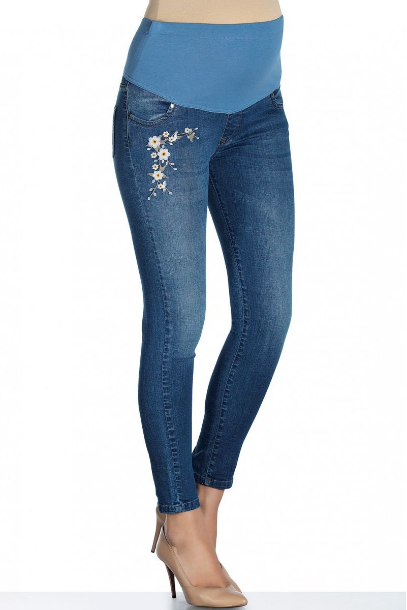 Джинсы выполнены из стрейчевого денима средней плотности. Модель зауженного и укороченного кроя декорирована вышивкой, средняя посадка без застёжки. Детали: высокая трикотажная вставка для животика, три кармана спереди и два накладных кармана сзади.
