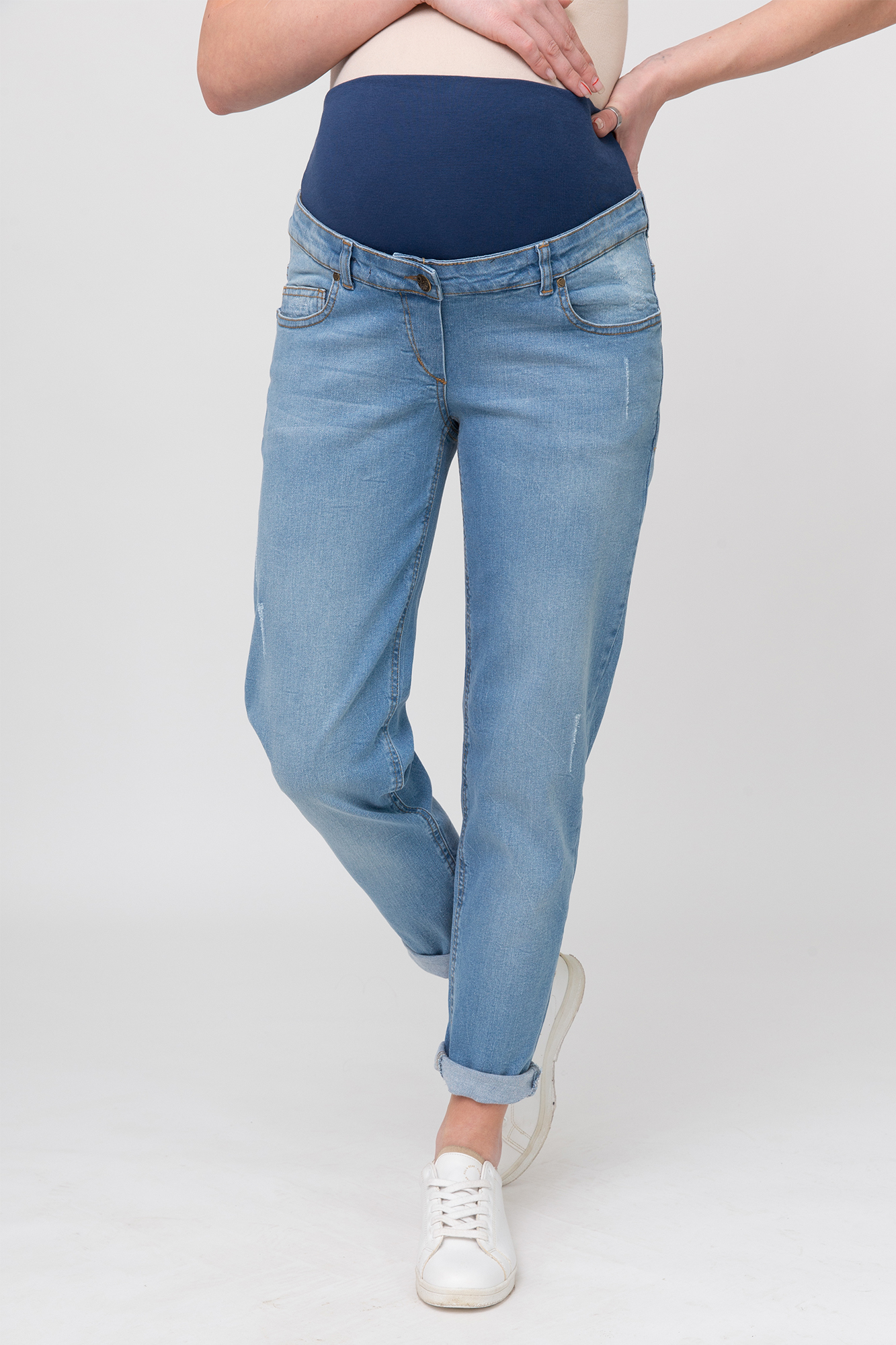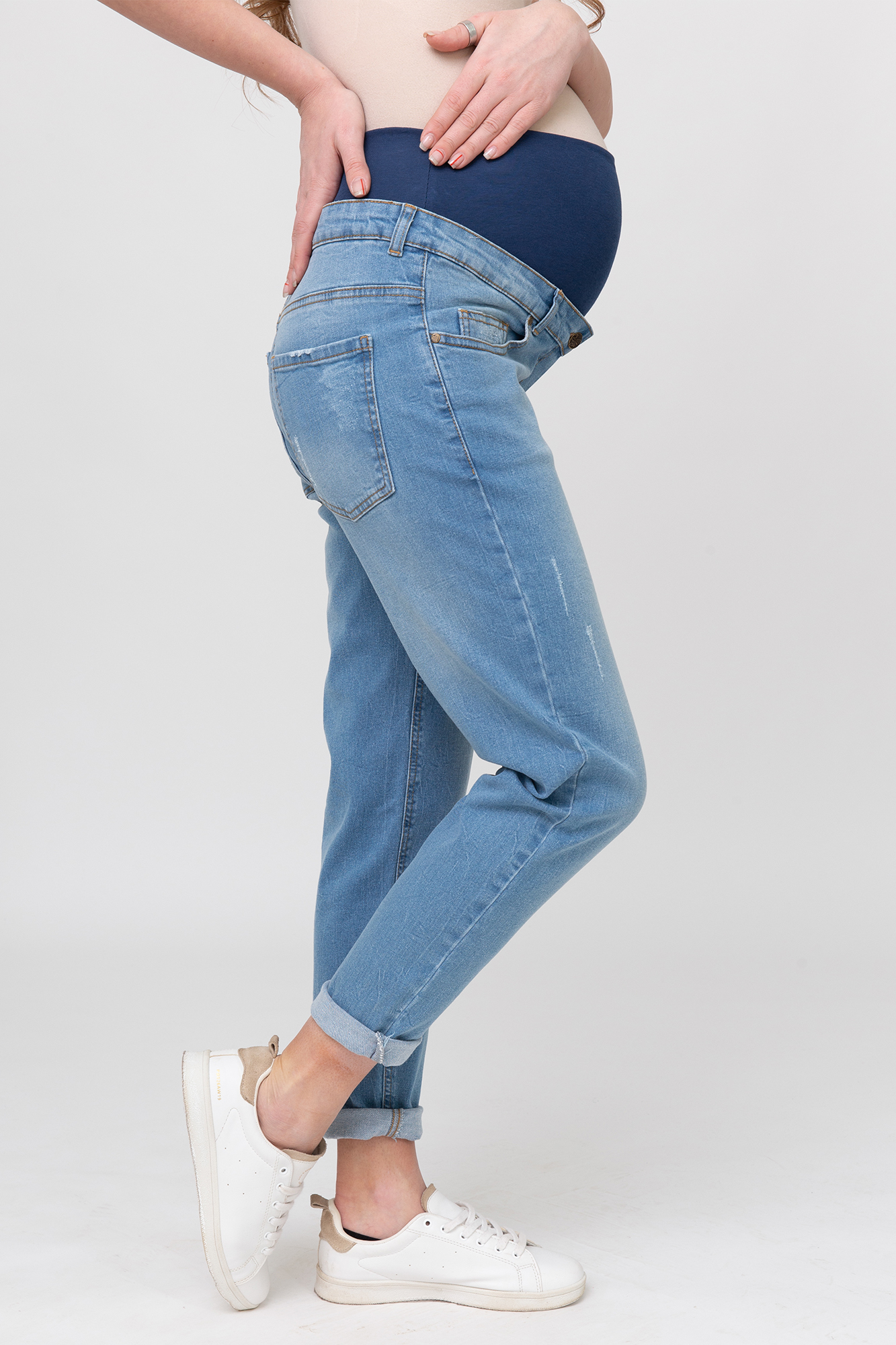 Джинсы-бойфренды для беременных выполнены из высококачественного стрейчевого денима. Особый вар ручной работы делает данную модель уникальной и оригинальной. На модели высокая трикотажная вставка с эффектом бандажа мягко и деликатно поддерживает растущий животик, объем регулируется за счет резинки, которая перестегивается на пуговицу. Детали: три кармана спереди и два накладных кармана сзади, шлевки для ремня.