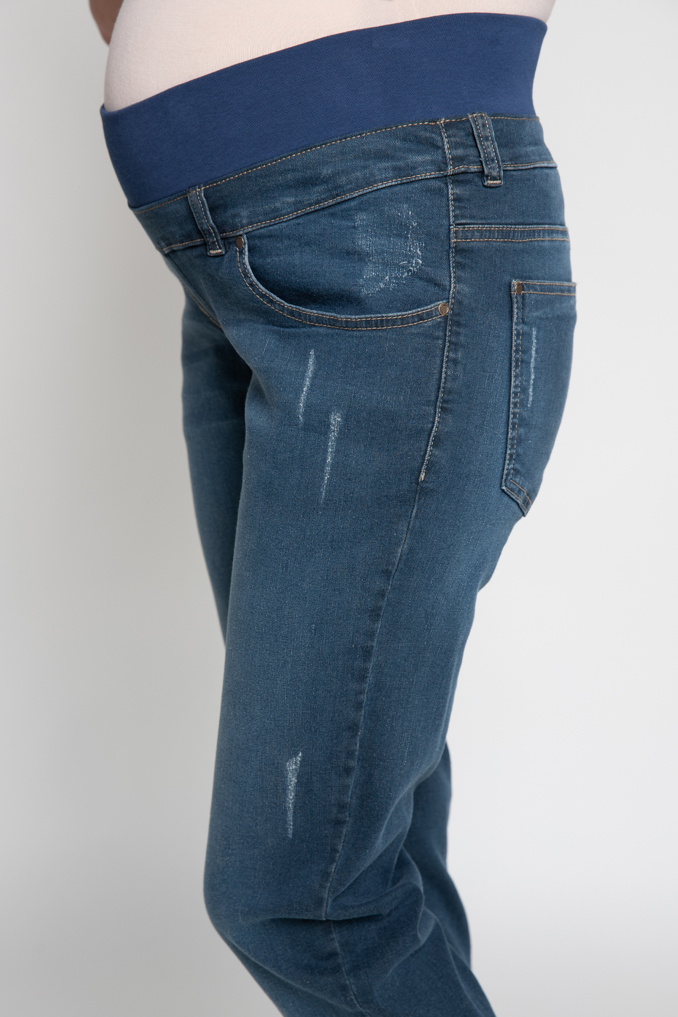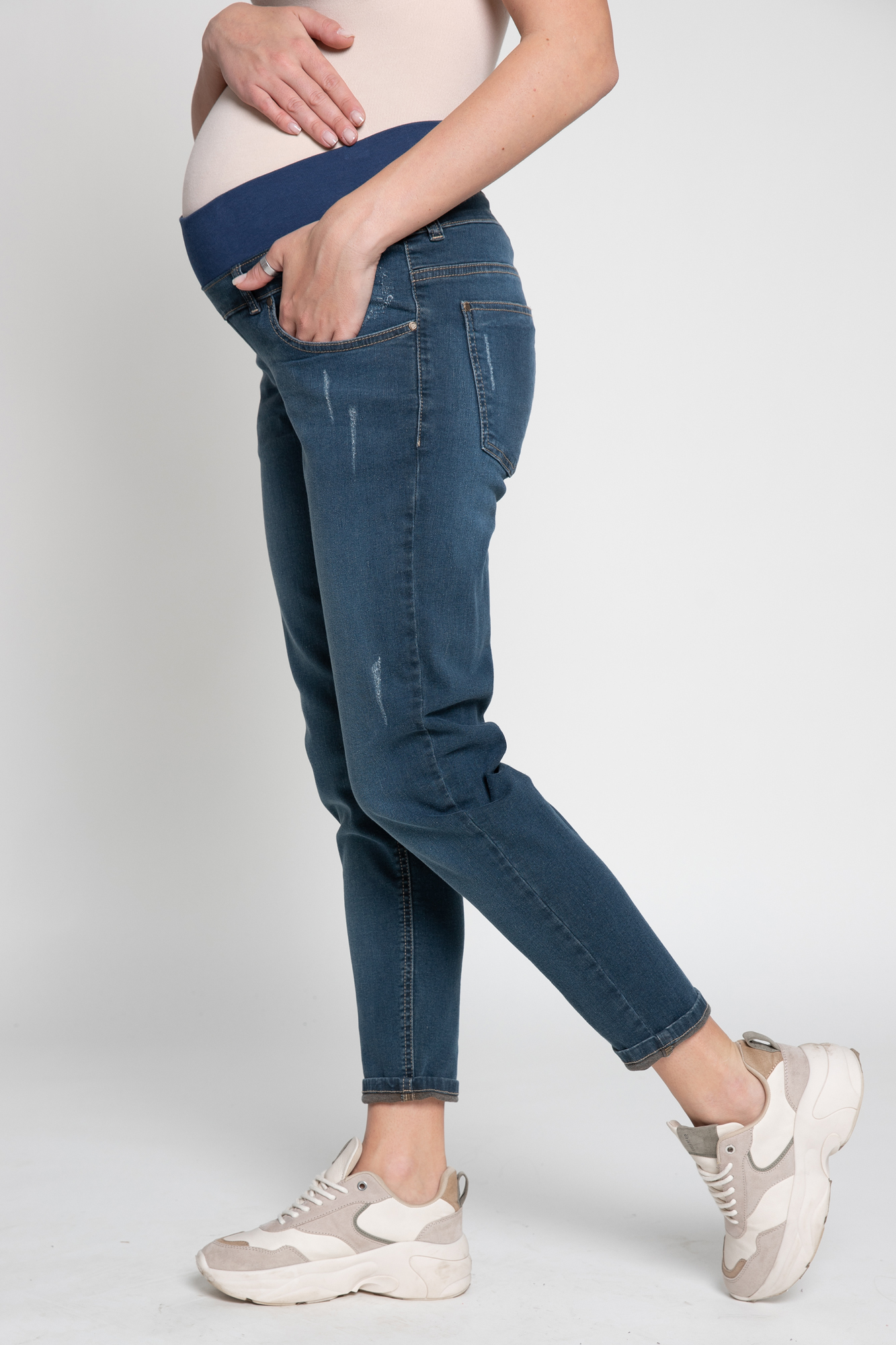 Джинсы-бойфренды для будущих мам выполнены из высококачественного денима с добавлением эластана. Мягкая бандажная резинка под живот не сдавливает и поддерживает. На джинсах два кармана спереди, два накладных кармана сзади, шлевки для ремня, легкие потертости. Идеальная посадка на любом сроке беременности и после нее.