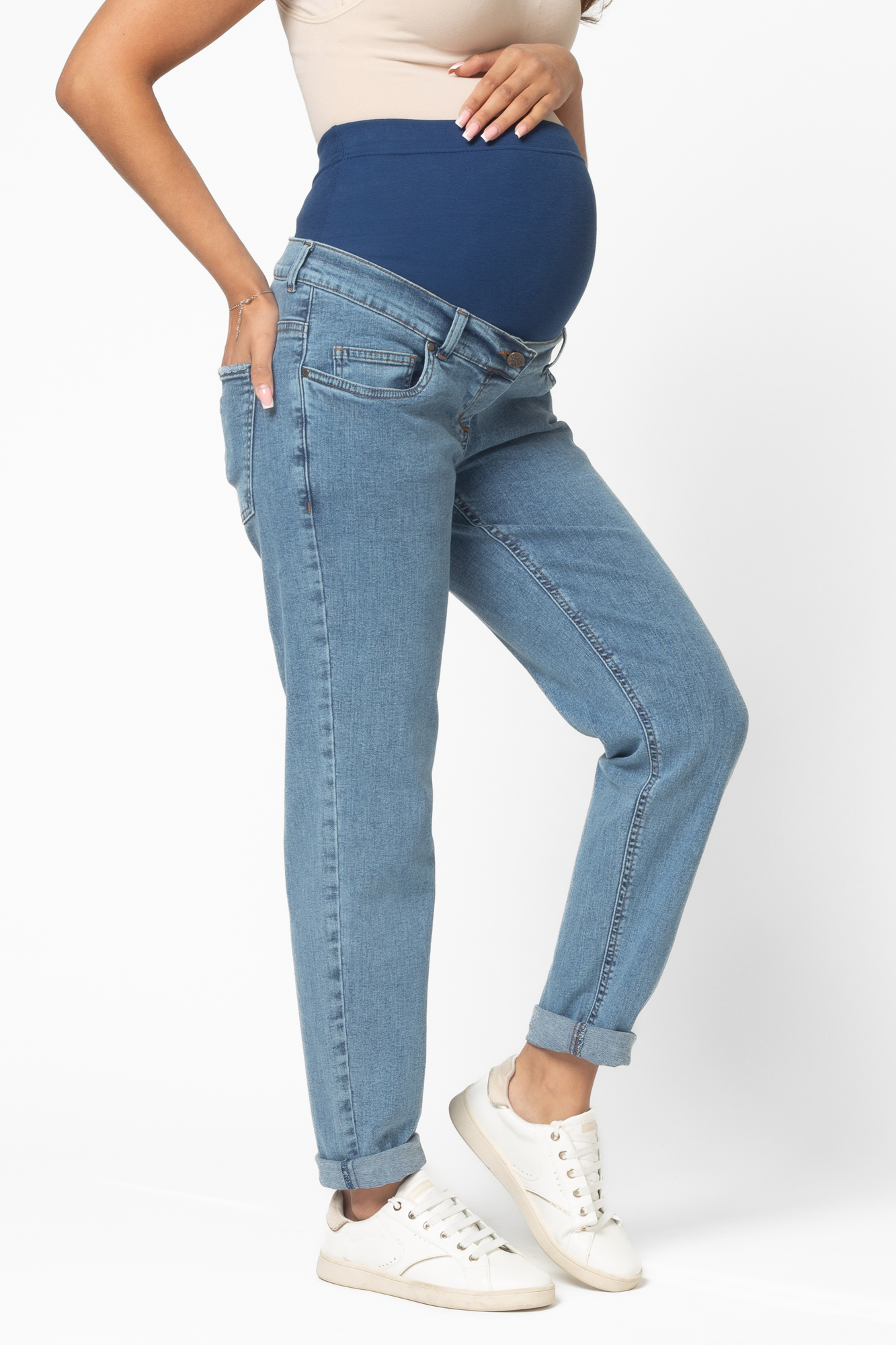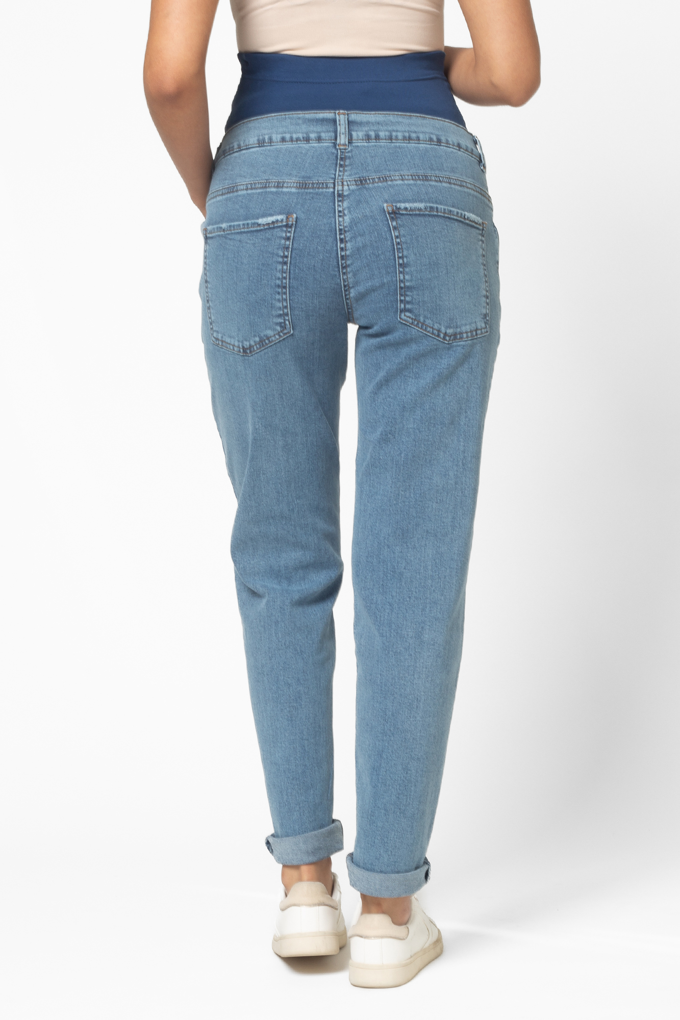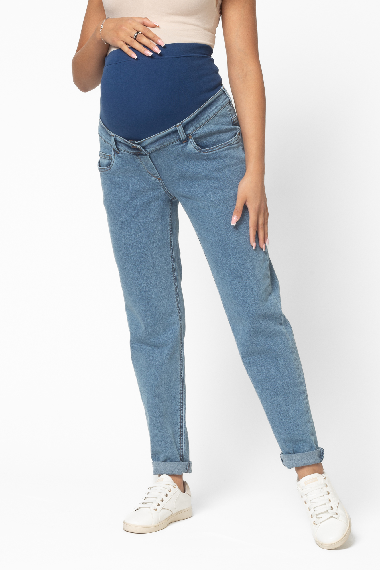 Стильные джинсы-бойфренды для беременных выполнены из высококачественного стрейчевого денима, не стесняющего движений. На модели высокая трикотажная вставка с эффектом бандажа мягко и деликатно поддерживает растущий животик. Объем регулируется за счет перфорированной резинки, продетой в пояс изделия, которая перестегивается на пуговицу. Детали модели: три кармана спереди, два накладных кармана сзади, шлевки для ремня, застежка на пуговицу. Специальный крой с учетом анатомических особенностей позволяет носить изделие от начала до конца беременности, а также после родов.