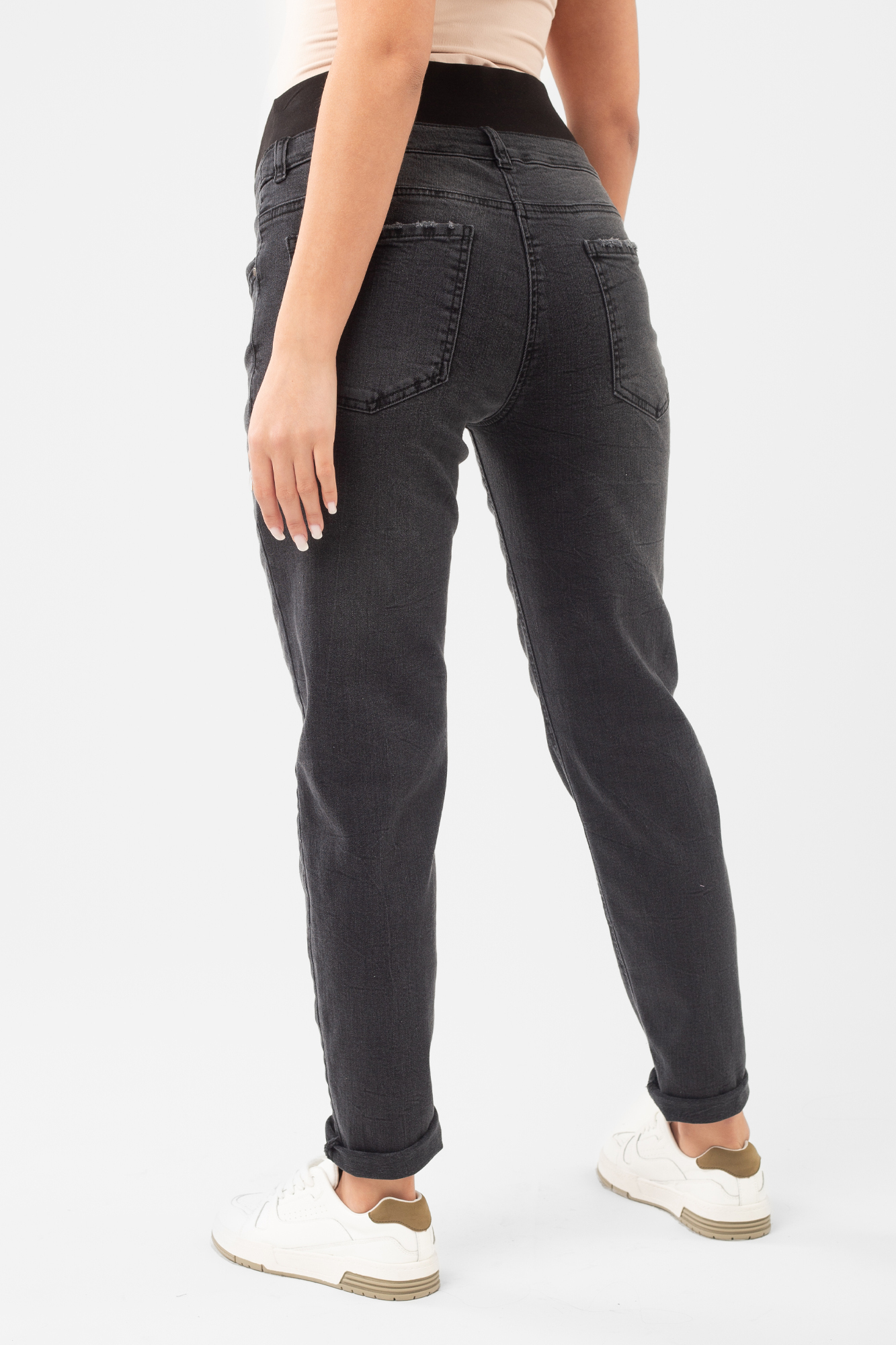 Плотные джинсы обладают особым кроем и станут находкой для беременных девушек. В штанах из денима премиум качества обеспечен полный комфорт даже женщинам с животиком большого размера. Стрейчевые джинсы момс идеально садятся по фигуре, не сковывают движения и обеспечивают будущей маме свободу. Светлые укороченные штаны с высокой талией, но низкой посадкой оснащены молнией, двумя карманами спереди. Наличие двух накладных карманов также отмечается на модели сзади. Джинсы с подворотами красиво облегают бедра. Они станут базовой одеждой в гардеробе будущих мам. Ведь крутые варенки оверсайз не только выглядят стильно, модно и оригинально, но и очень удобны в носке. На них предусмотрен эластичный бандажный пояс, обеспечивающий полноценную поддержку увеличивающегося в размерах животика.