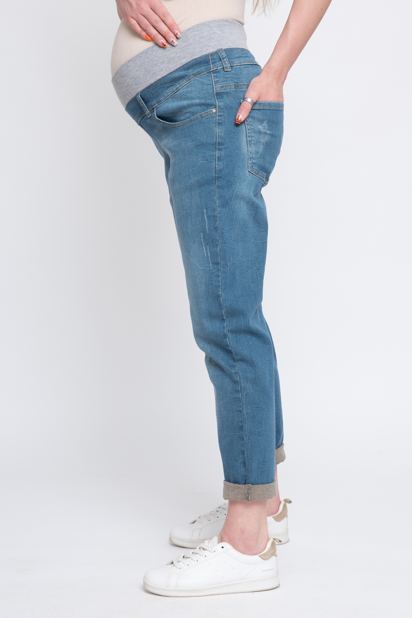 Джинсы-бойфренды для будущих мам выполнены из высококачественного денима с добавлением эластана. Мягкая бандажная резинка под живот не сдавливает и поддерживает. На джинсах два кармана спереди, два накладных кармана сзади, шлевки для ремня, легкие потертости. Идеальная посадка на любом сроке беременности и после нее.