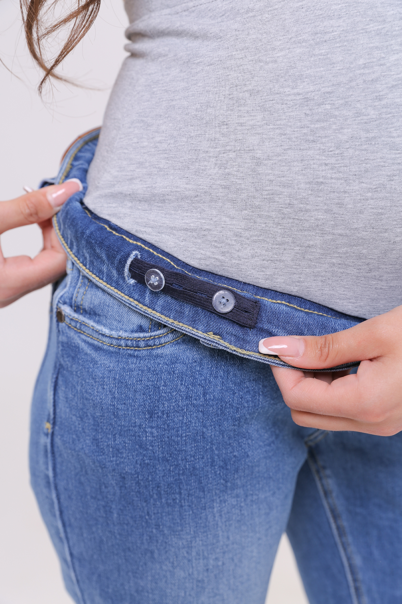 Джинсы для беременных выполнены из высококачественного стрейчевого денима. На модели трикотажная вставка с эффектом бандажа не сдавливает, мягко и деликатно поддерживает растущий животик. Объем регулируется за счет резинок, перестегиваеющихся на пуговицу, продетых в пояс и трикотажную часть изделия. Детали: три кармана спереди и два накладных кармана сзади, шлевки для ремня. Джинсы мом женские можно носить на всем протяжении беременности и после родов.