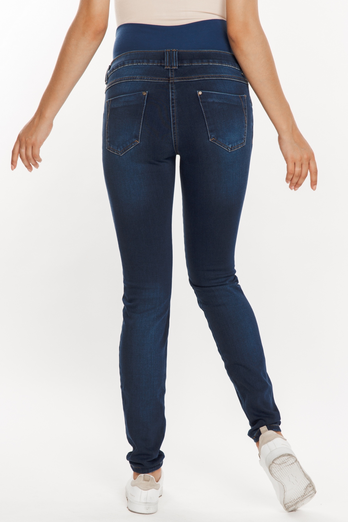 Утепленные джинсы для беременных выполнены из плотного денима. Модель зауженного кроя и, средняя посадка, имитация застежки на пуговицу. Детали: высокая трикотажная вставка для животика, три кармана спереди и два накладных кармана сзади, шлевки для ремня.