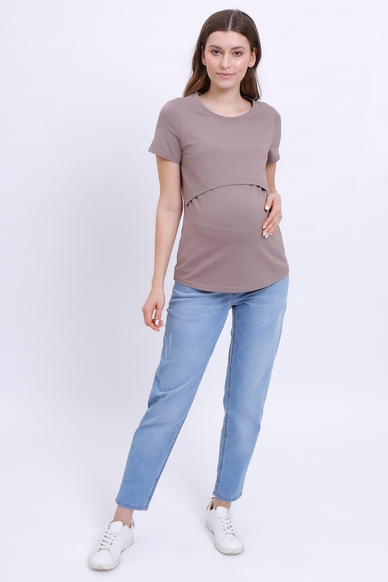 Приталенная футболка из хлопка для беременных и кормящих. Благодаря сборкам по бокам, можно носить футболку на любом сроке беременности и после нее. Секрет кормления позволяет комфортно покормить малыша в любой ситуации.