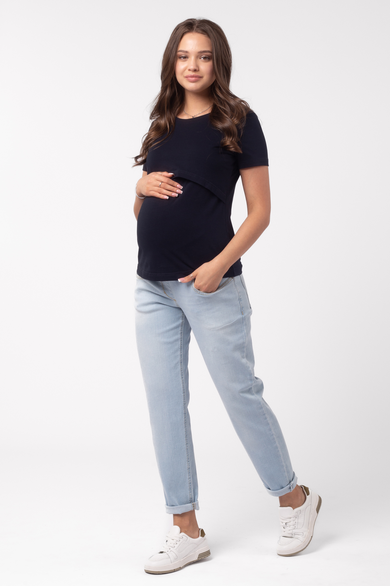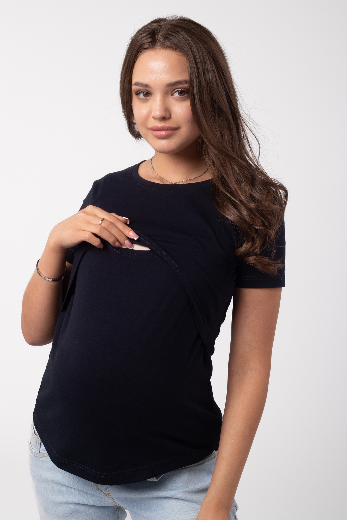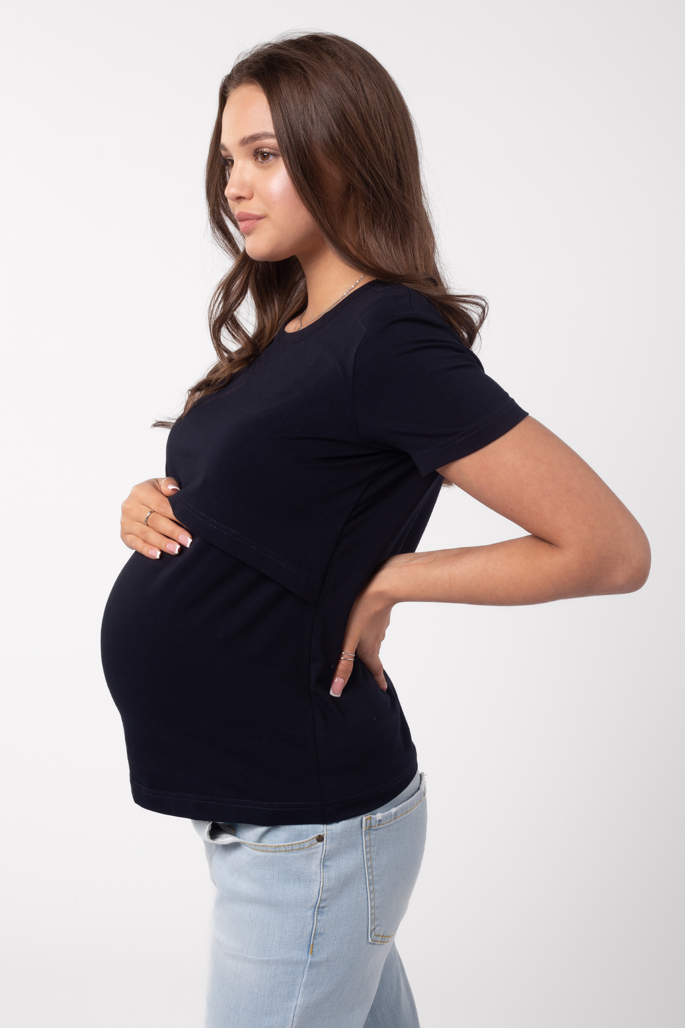 Приталенная футболка из хлопка для беременных и кормящих. Благодаря сборкам по бокам, можно носить футболку на любом сроке беременности и после нее. Секрет кормления позволяет комфортно покормить малыша в любой ситуации.