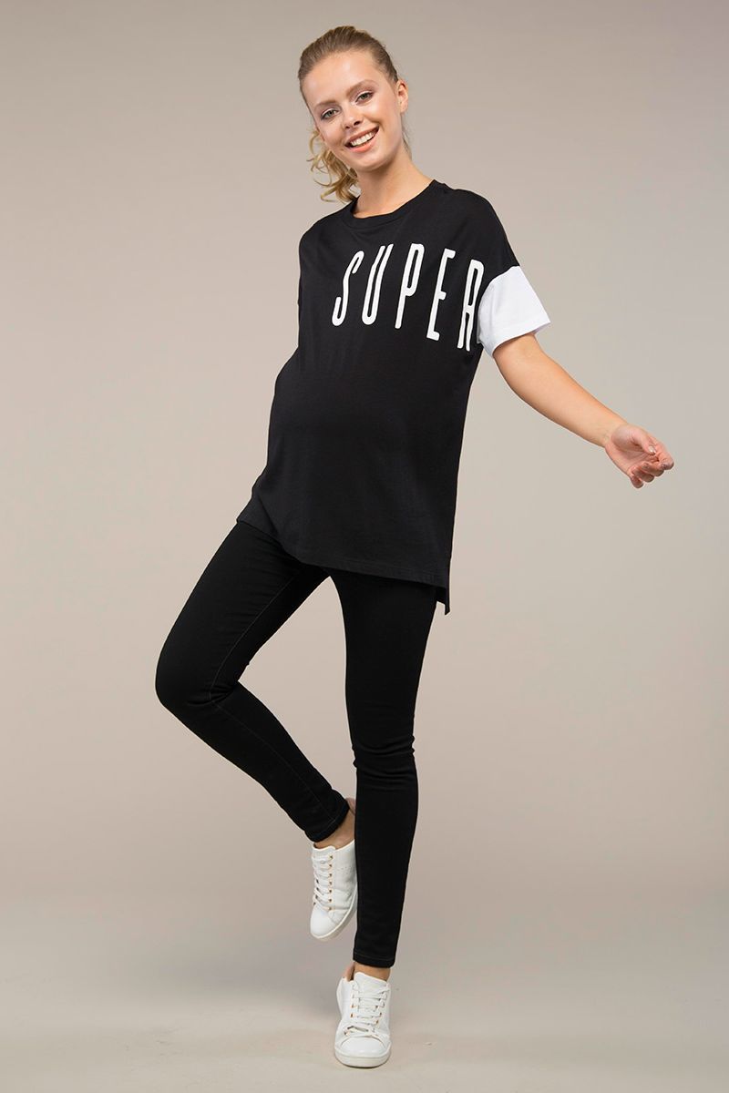 Стильная футболка для беременных из хлопкового трикотажа. Модель свободного плана, снизу по бокам разрезы, принт с двух сторон, круглый вырез горловины.