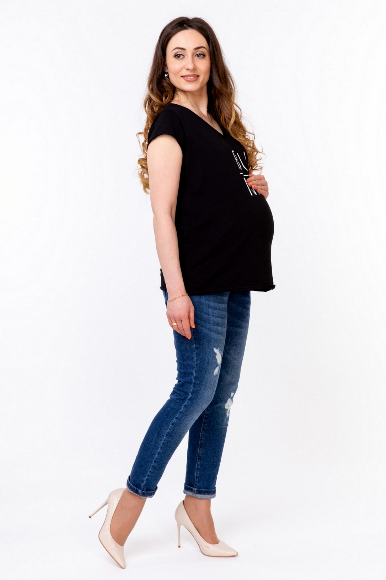 Футболка для будущих мам. Благодаря особенностям кроя не стесняет движений и замечательно подходит для ежедневных прогулок. Отличная посадка на любом сроке беременности и после нее.