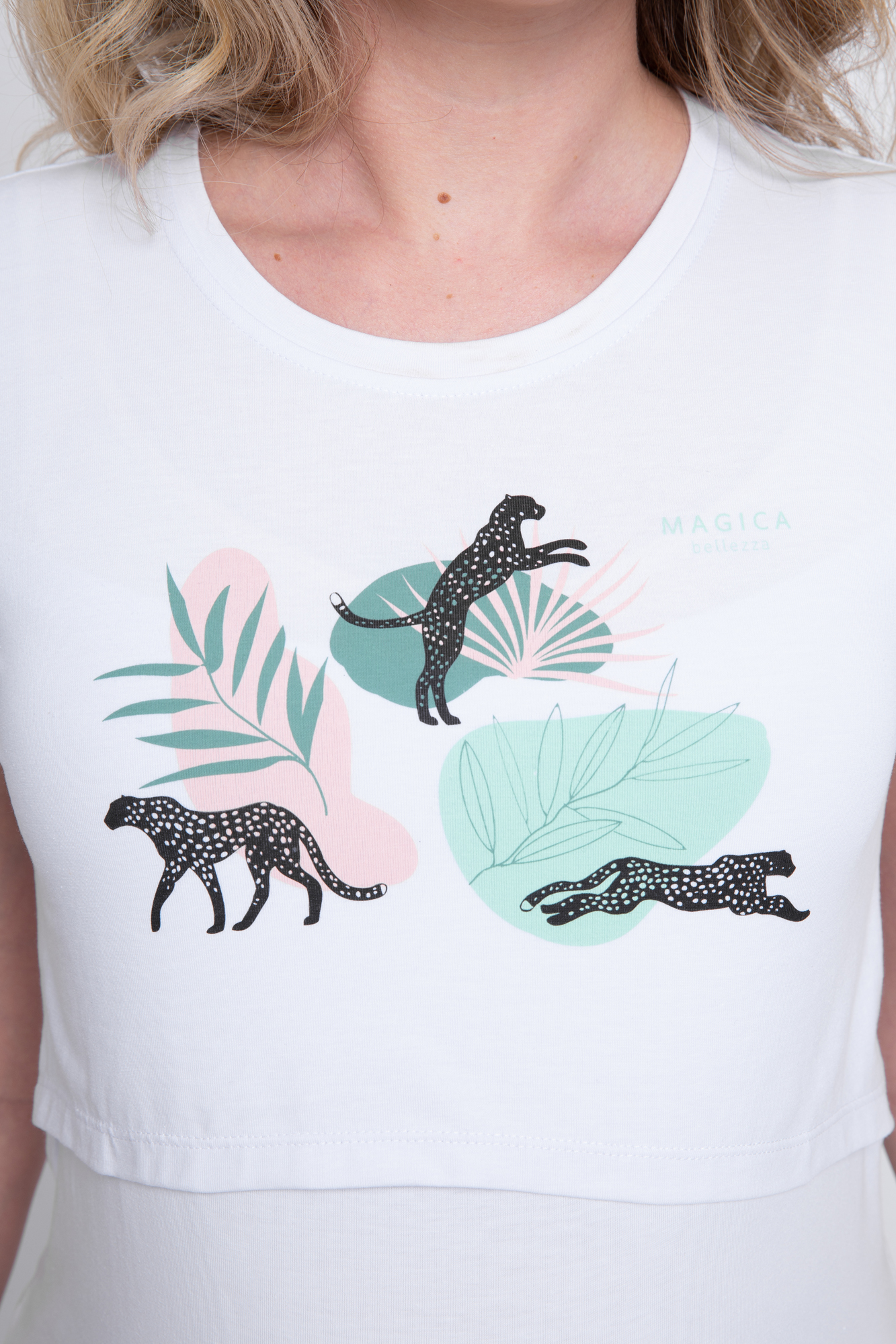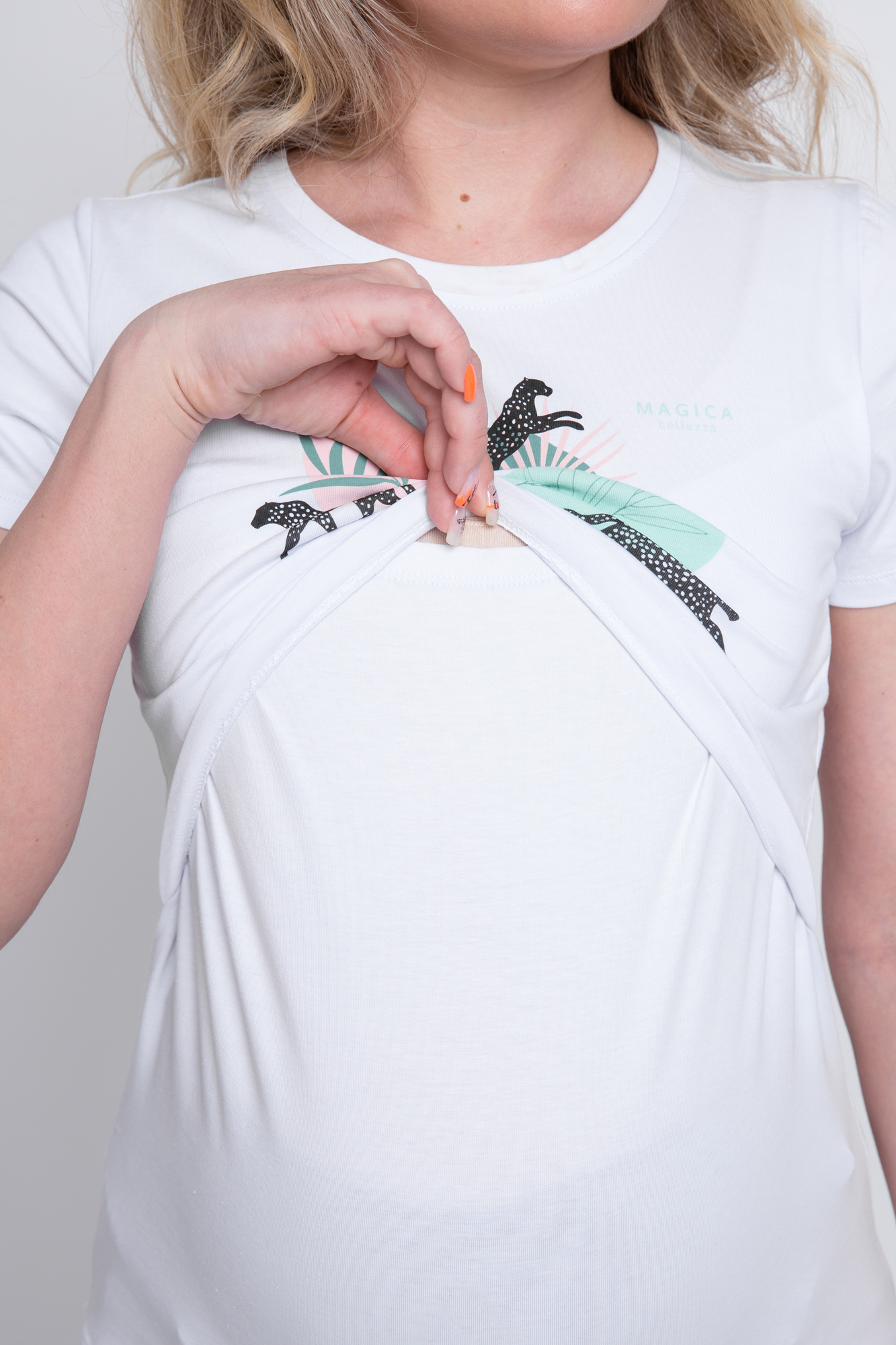 Приталенная футболка из хлопка для беременных и кормящих. Благодаря сборкам по бокам, можно носить футболку на любом сроке беременности и после нее. Изящный принт не смывается при стирке. Секрет кормления позволяет комфортно покормить малыша в любой ситуации.