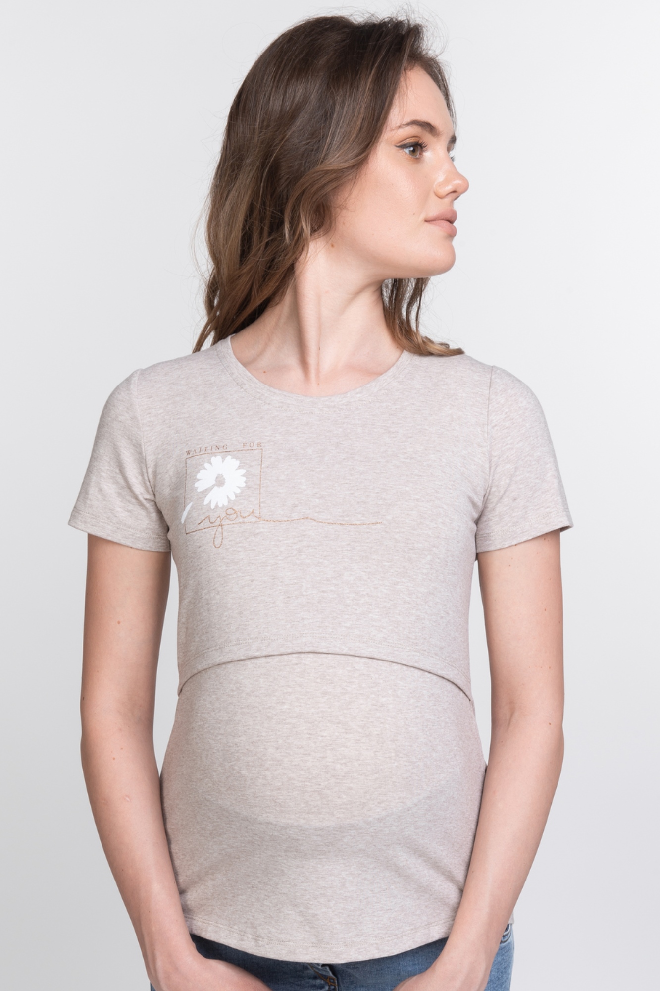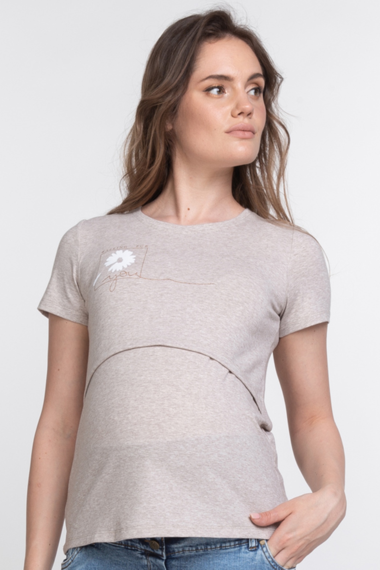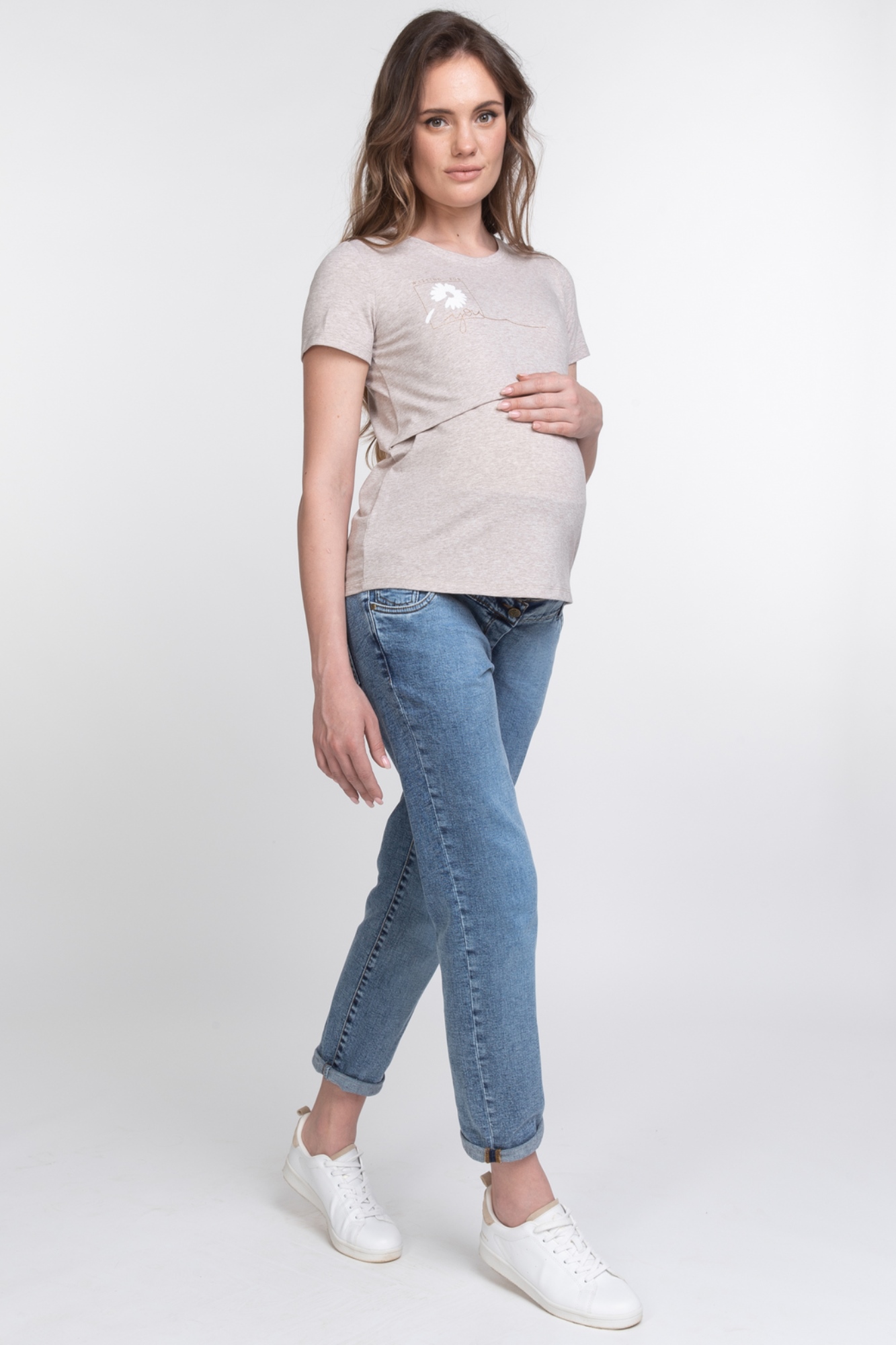 Приталенная футболка из хлопка для беременных и кормящих. Благодаря сборкам по бокам, можно носить футболку на любом сроке беременности и после нее. Изящный принт не смывается при стирке. Секрет кормления позволяет комфортно покормить малыша в любой ситуации.