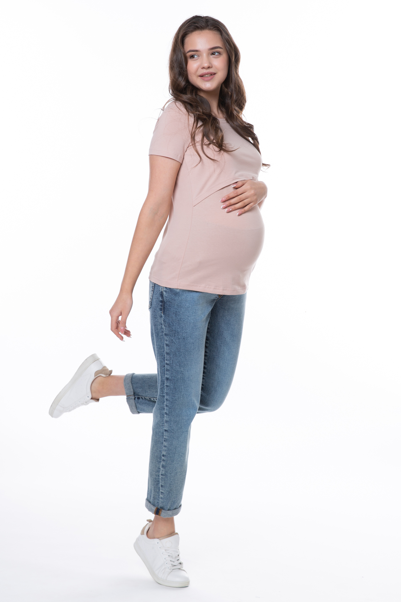 Приталенная футболка из хлопка для беременных и кормящих. Благодаря сборкам по бокам, можно носить футболку на любом сроке беременности и после нее. Изящный принт не смывается при стирке. Секрет кормления позволяет комфортно покормить малыша в любой ситуации.