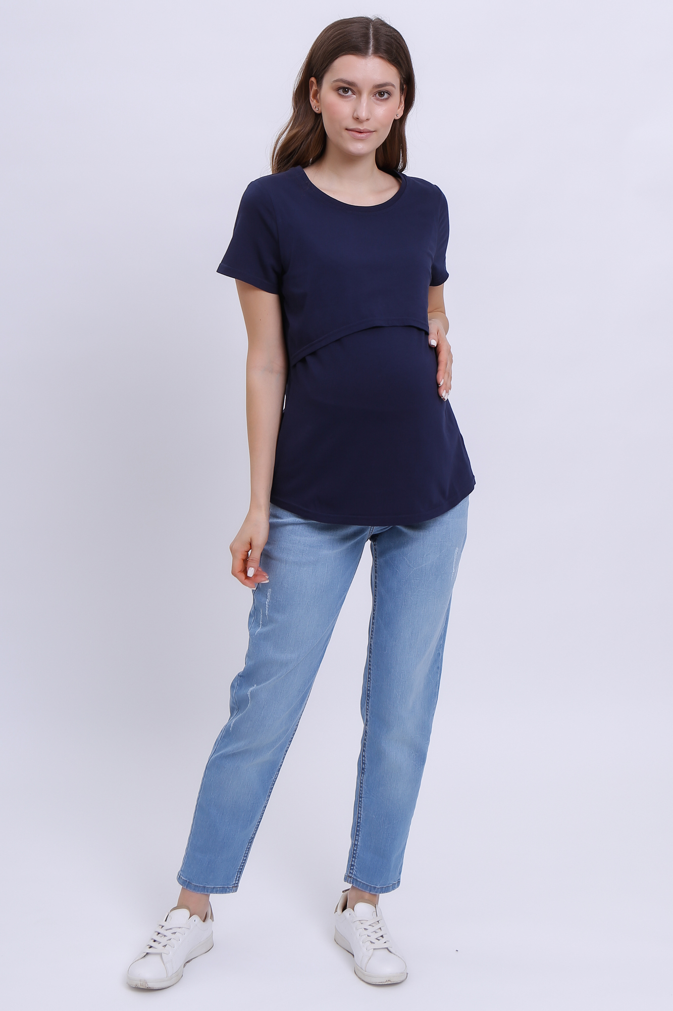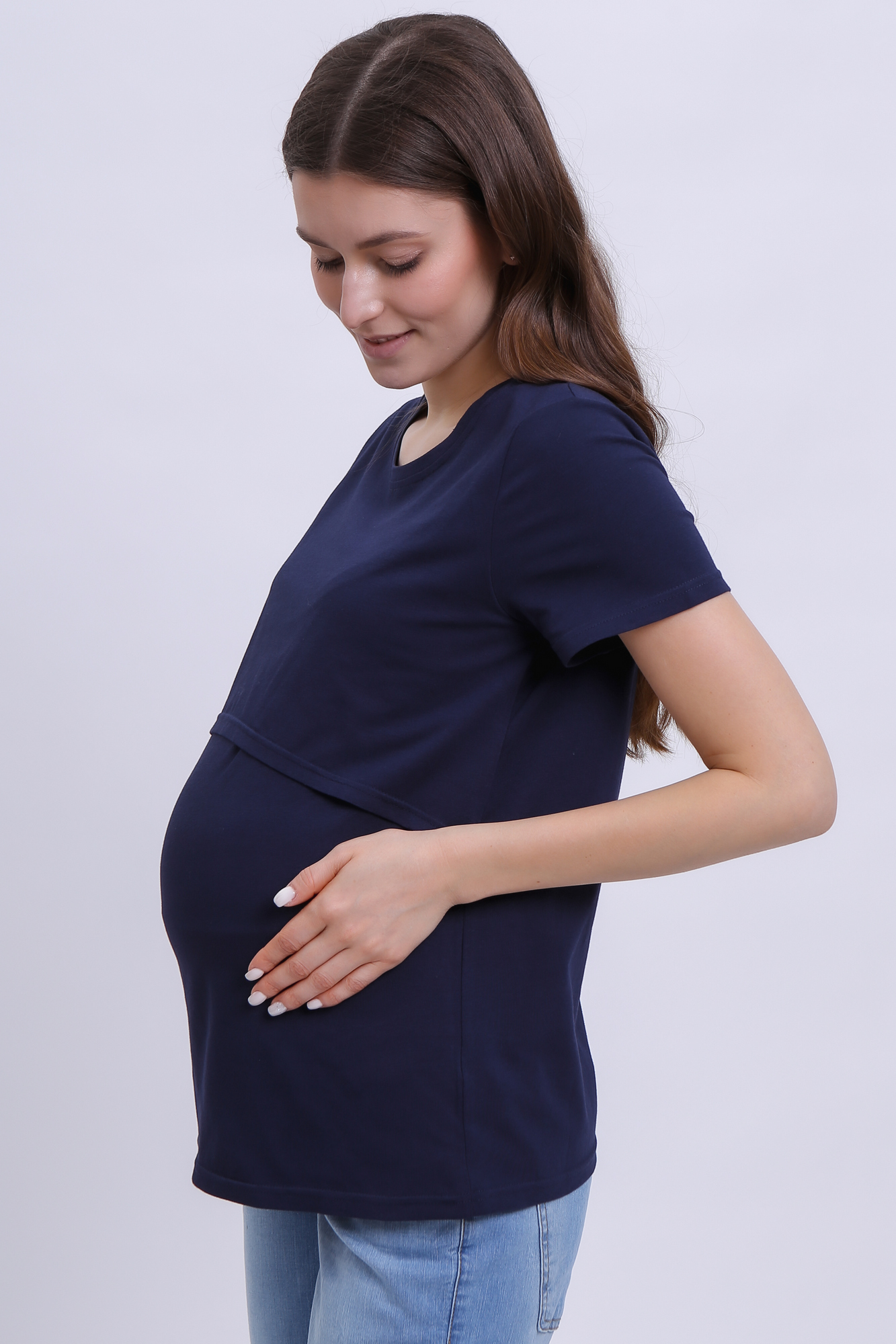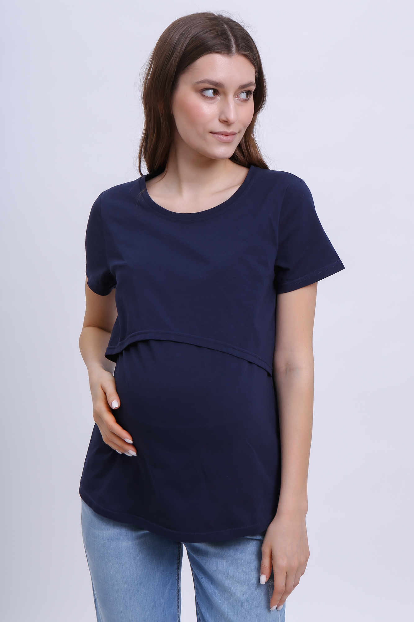 Приталенная футболка из хлопка для беременных и кормящих. Благодаря сборкам по бокам, можно носить футболку на любом сроке беременности и после нее. Секрет кормления позволяет комфортно покормить малыша в любой ситуации.