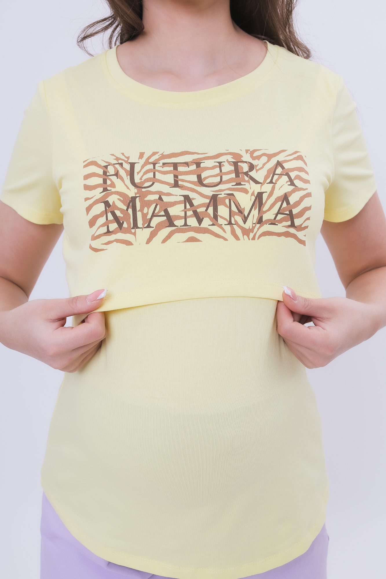 Приталенная футболка из хлопка для беременных и кормящих. Благодаря сборкам по бокам, можно носить футболку на любом сроке беременности и после нее. Изящный принт не смывается при стирке. Секрет кормления позволяет комфортно покормить малыша в любой ситуации.