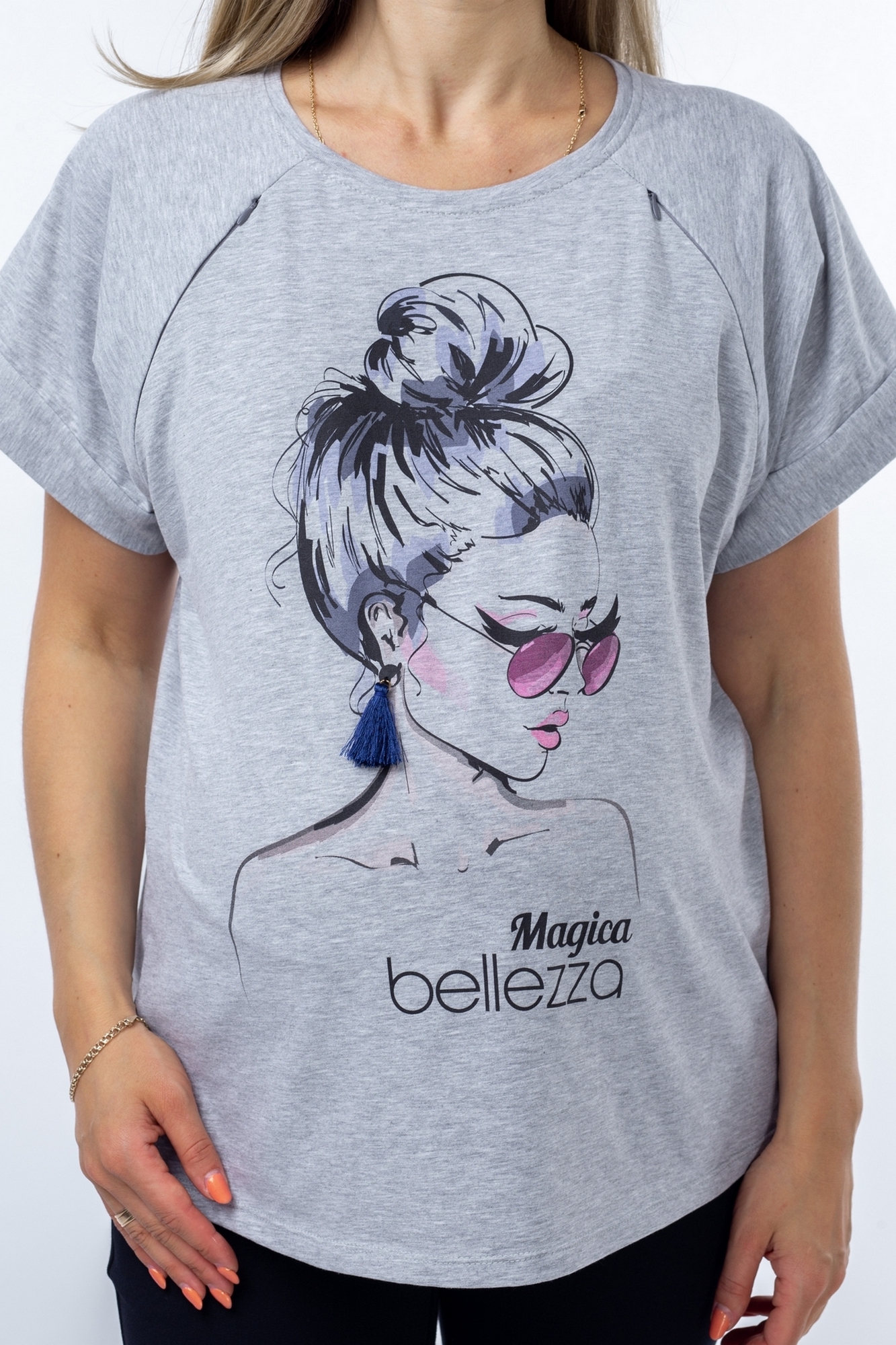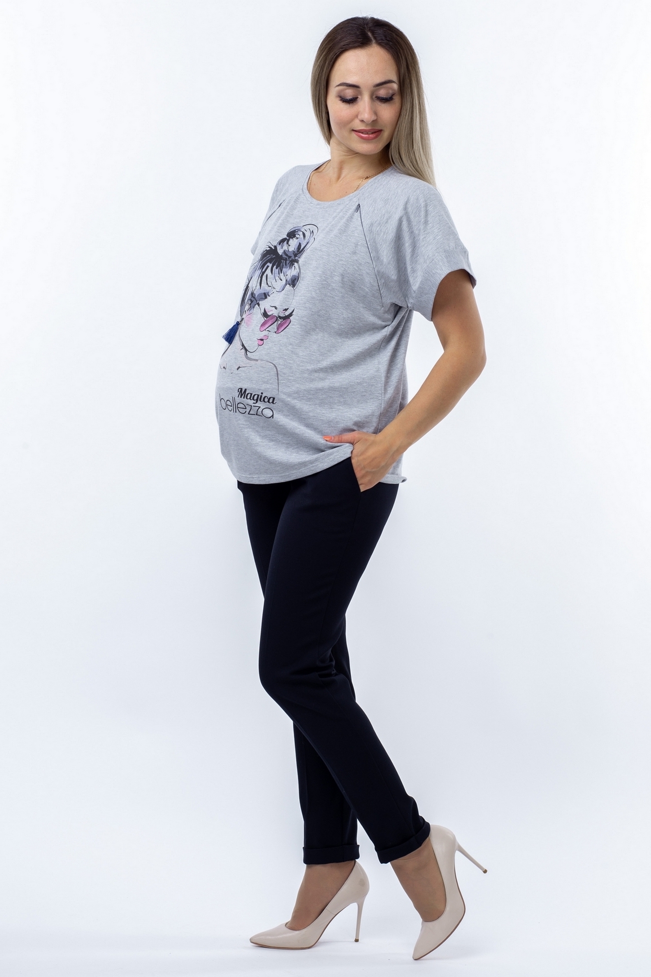 Футболка свободного кроя – такой фасон можно носить на любом сроке беременности, после родов скроет временные несовершенства фигуры. «Секрет» кормления – диагональные потайные молнии – позволит покормить малыша с комфортом в любой ситуации. Стильный принт не тускнеет после стирки.