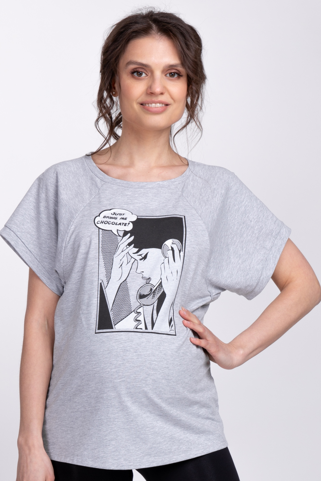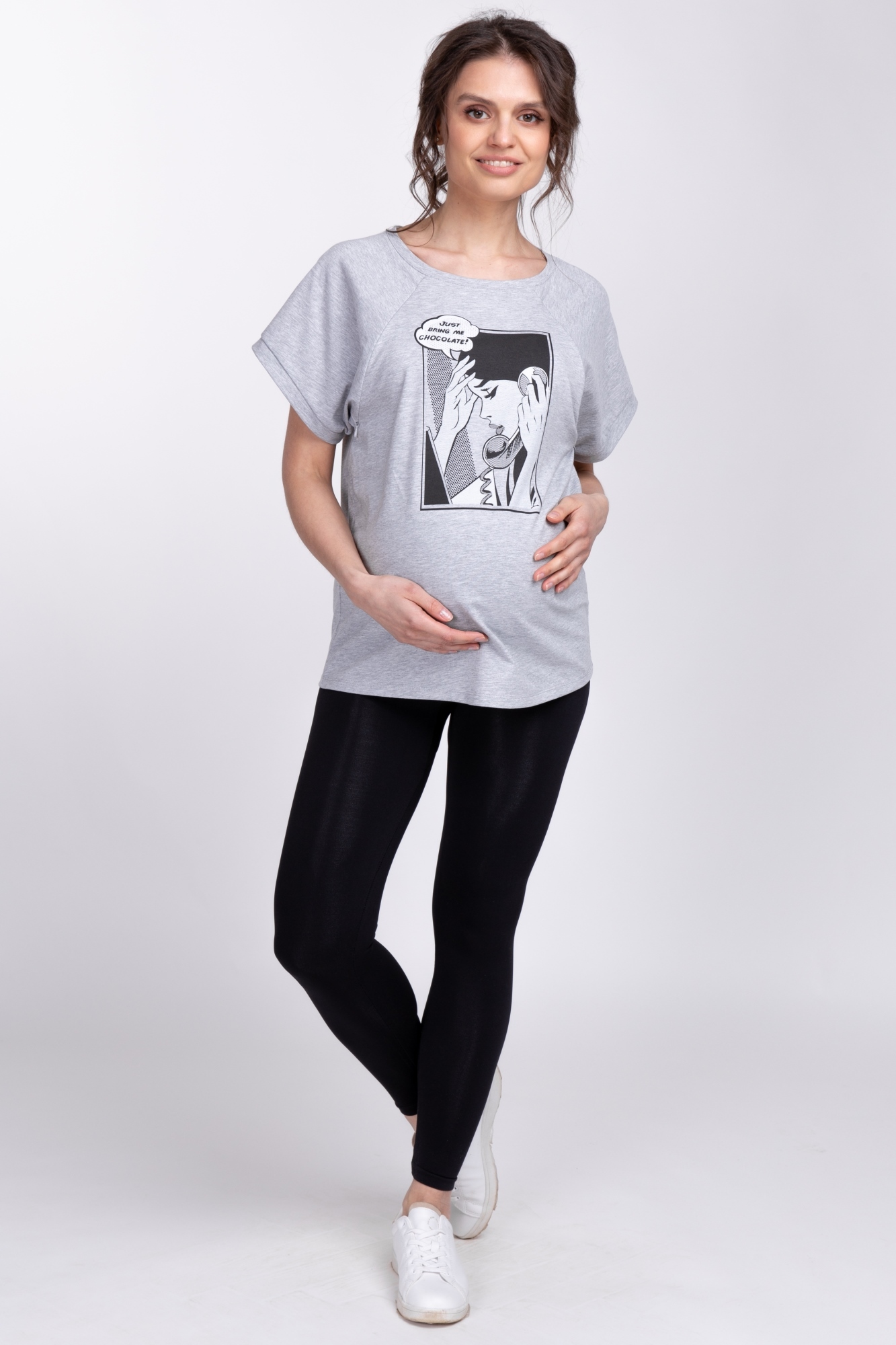Футболка свободного кроя – такой фасон можно носить на любом сроке беременности, после родов скроет временные несовершенства фигуры. «Секрет» кормления – диагональные потайные молнии – позволит покормить малыша с комфортом в любой ситуации. Стильный принт не тускнеет после стирки.