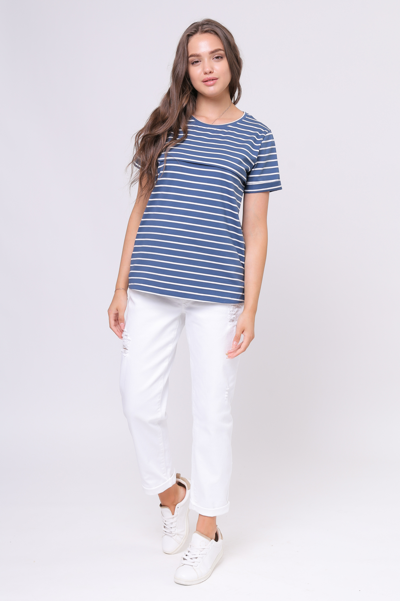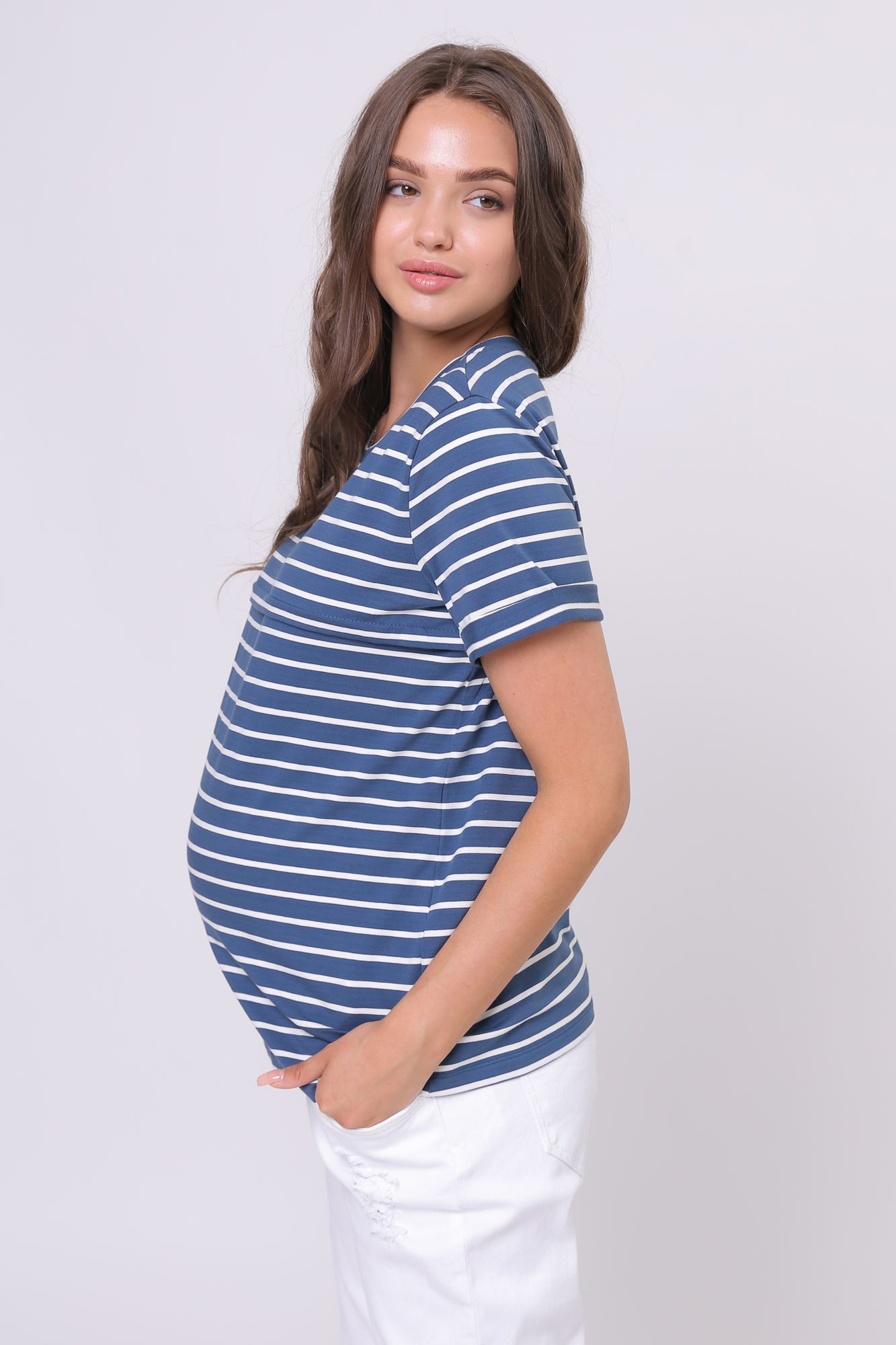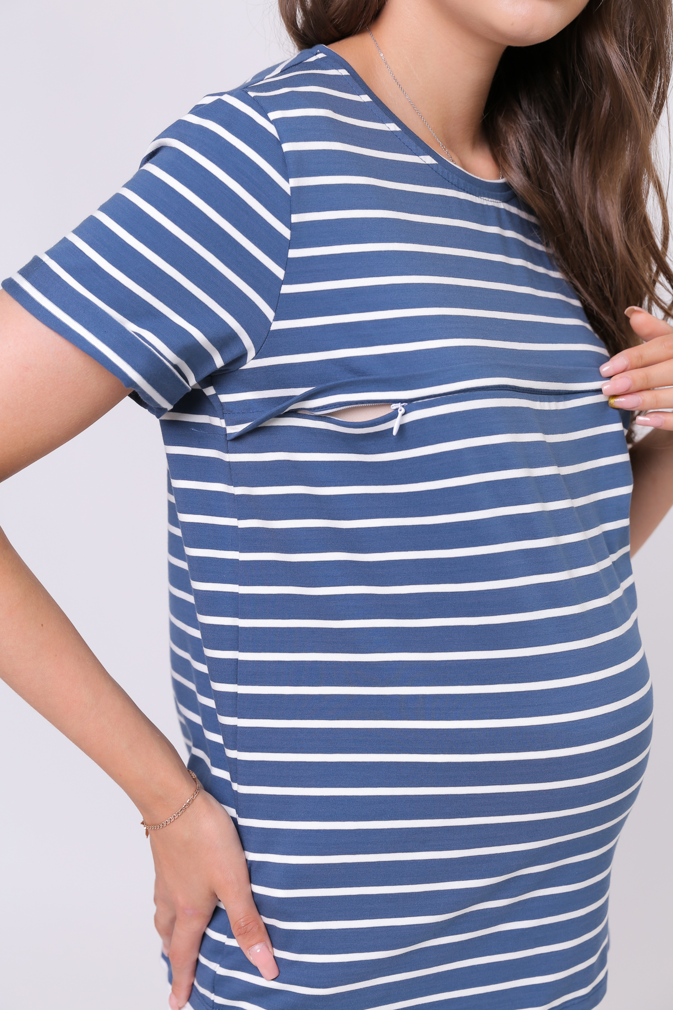 Футболка для беременных и кормящих из высококачественного хлопкового трикотажа. Особый крой обеспечивает идеальную посадку на всем протяжении беременности и после родов. Благодаря горизонтальным потайным молниям можно покормить малыша с комфортом в любой ситуации.