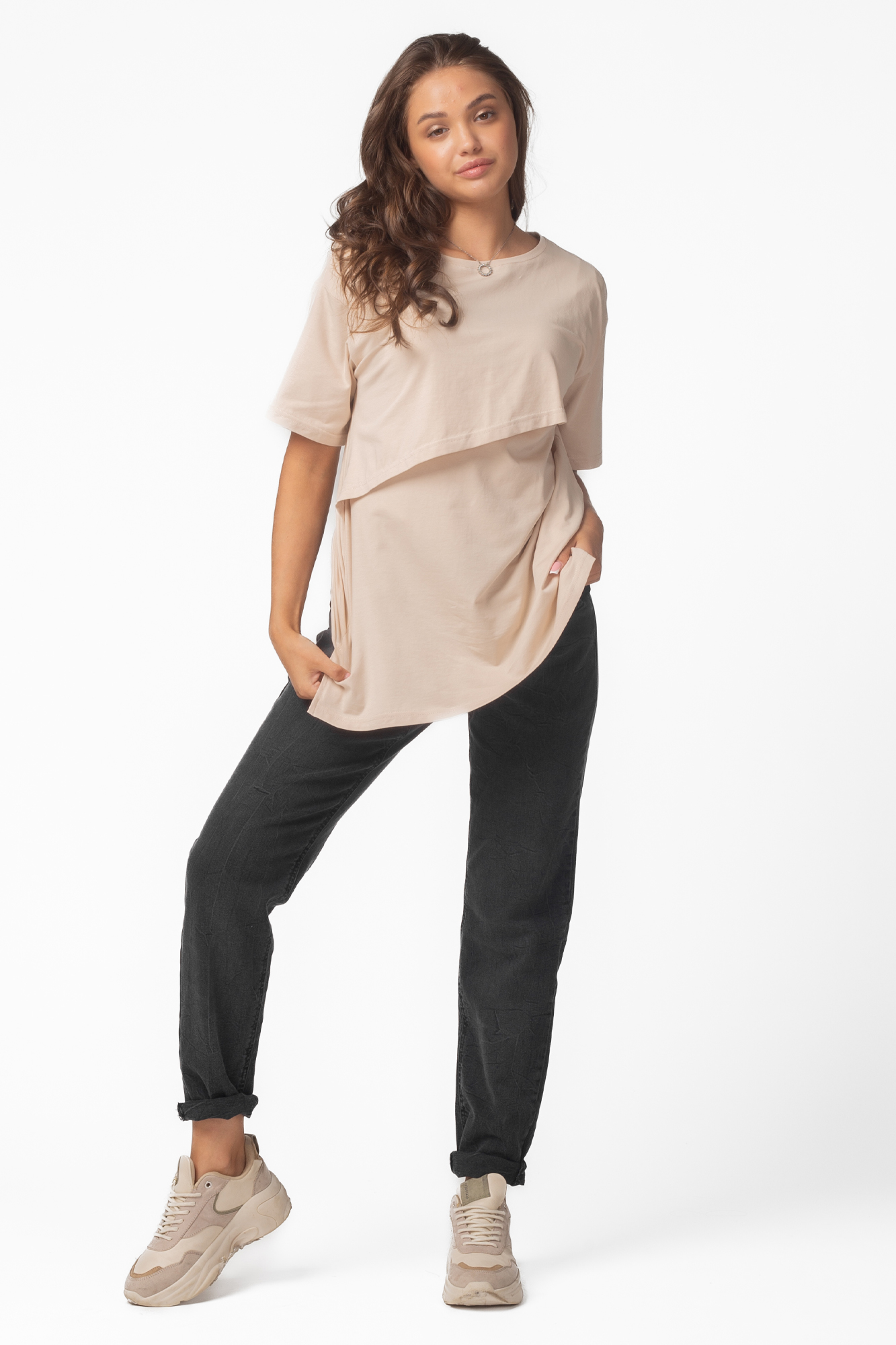 Футболка свободного кроя для беременных и кормящих выполнена из хлопкового трикотажа. Благодаря фасону оверсайз футболку можно носить на любом сроке беременности и после нее. Специальная конструкция позволяет комфортно покормить малыша в любой ситуации.