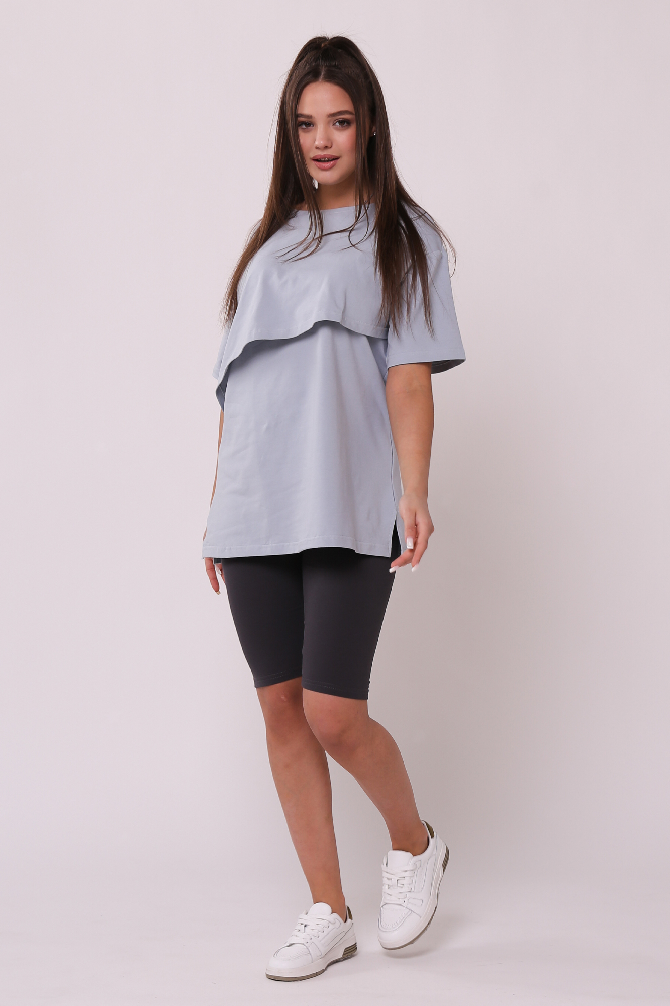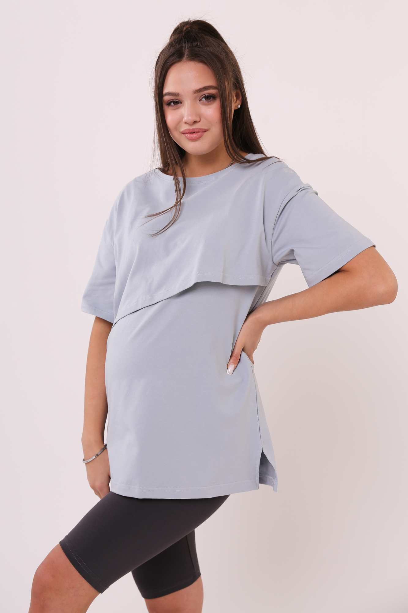 Футболка свободного кроя для беременных и кормящих выполнена из хлопкового трикотажа. Благодаря фасону оверсайз футболку можно носить на любом сроке беременности и после нее. Специальная конструкция позволяет комфортно покормить малыша в любой ситуации.