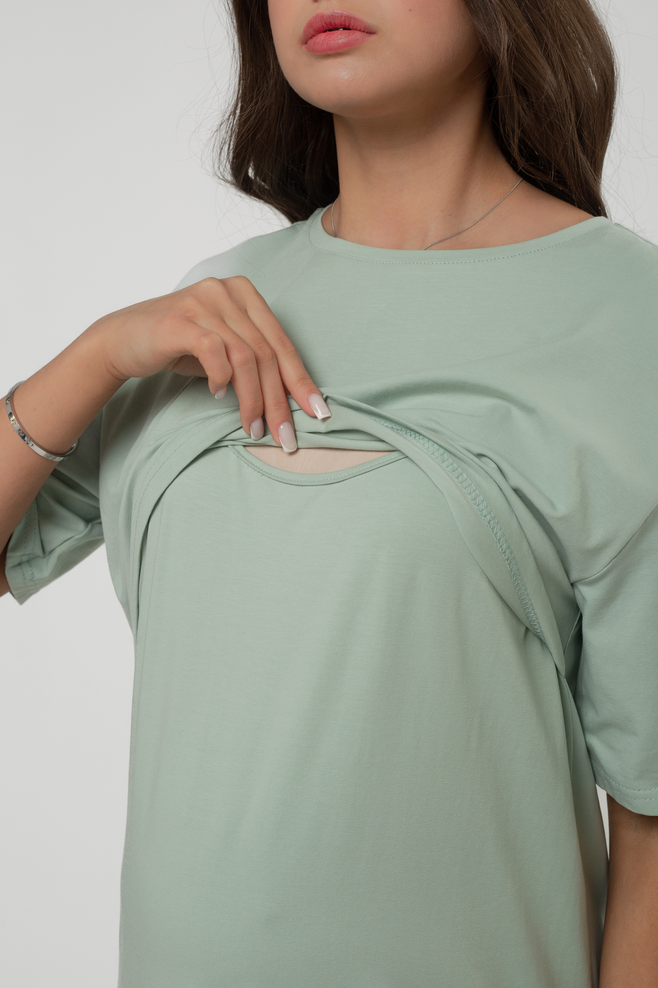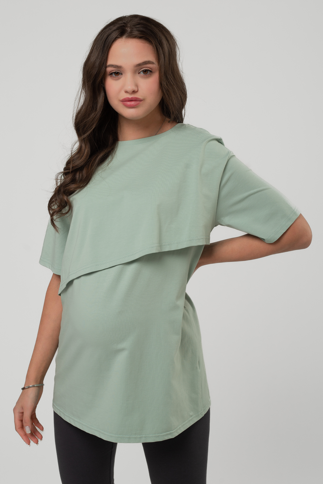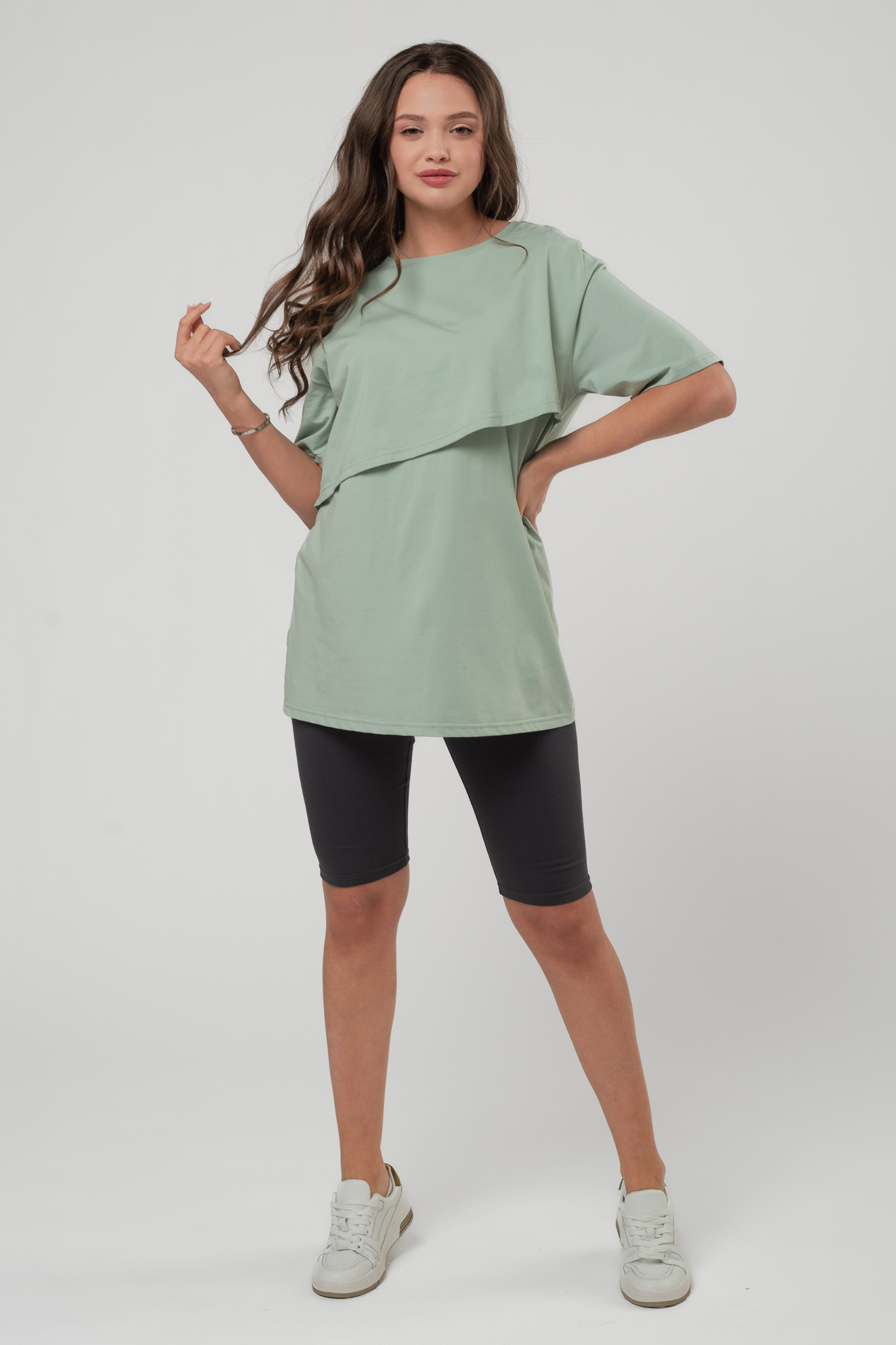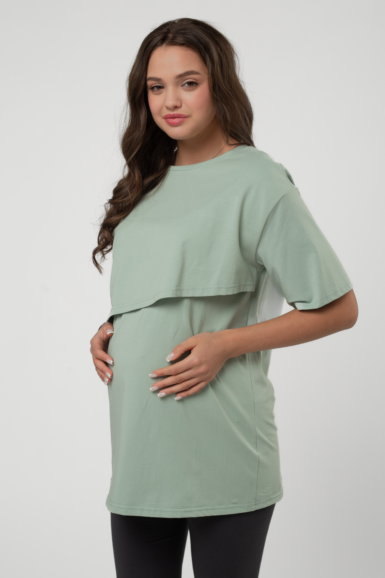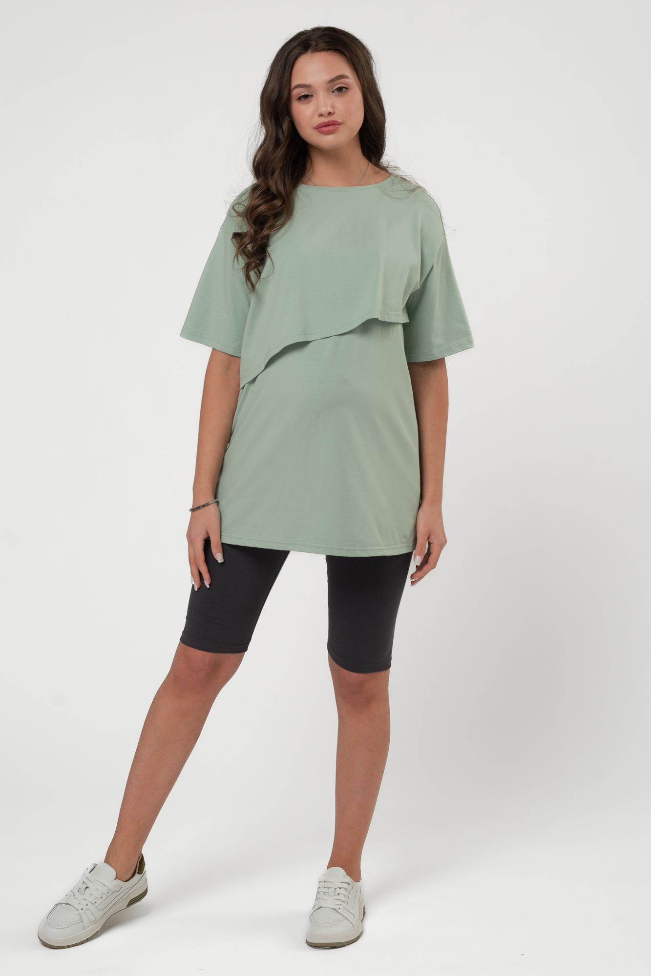 Футболка свободного кроя для беременных и кормящих выполнена из хлопкового трикотажа. Благодаря фасону оверсайз футболку можно носить на любом сроке беременности и после нее. Специальная конструкция позволяет комфортно покормить малыша в любой ситуации.