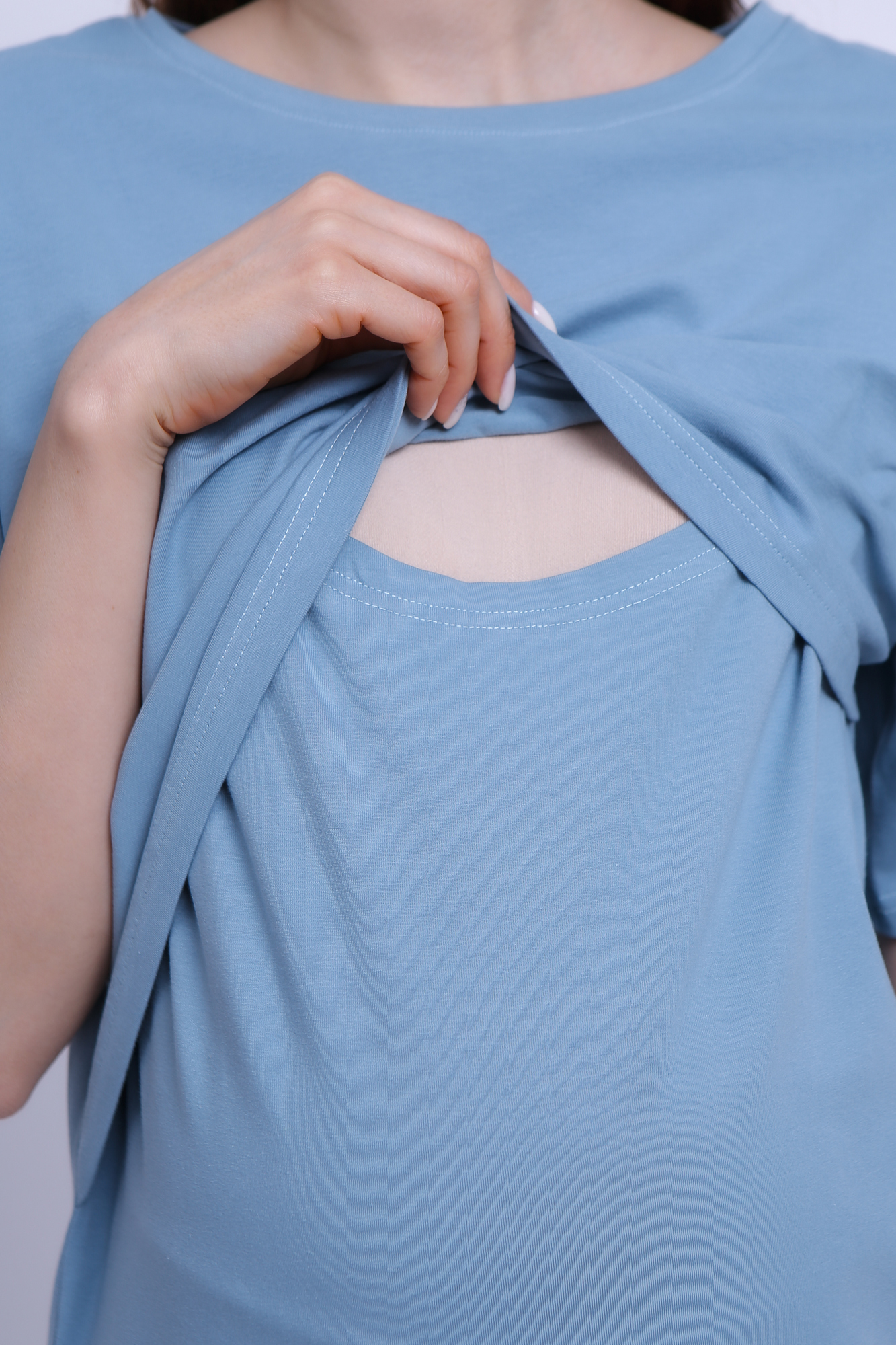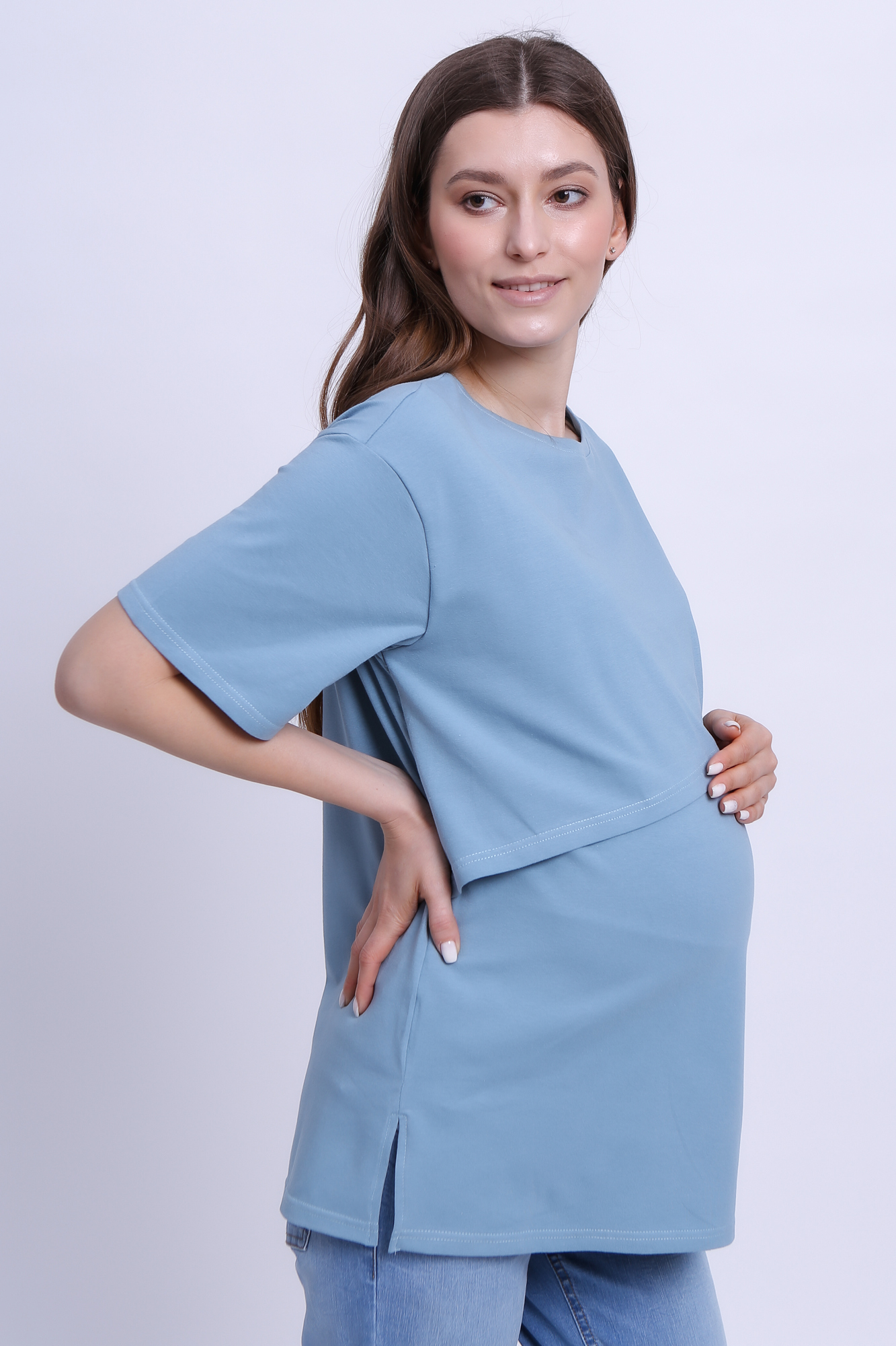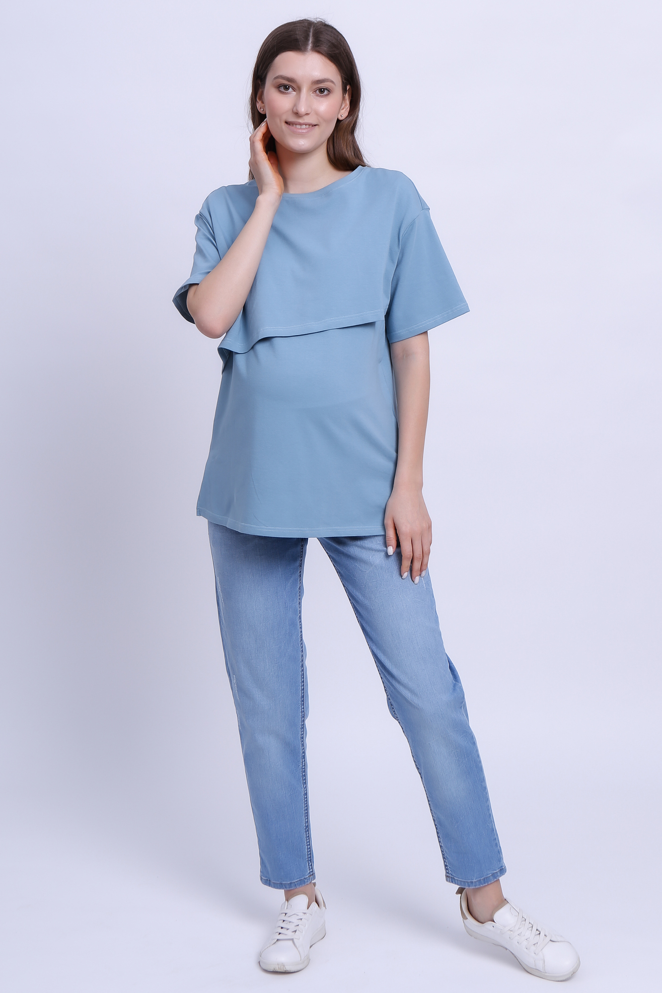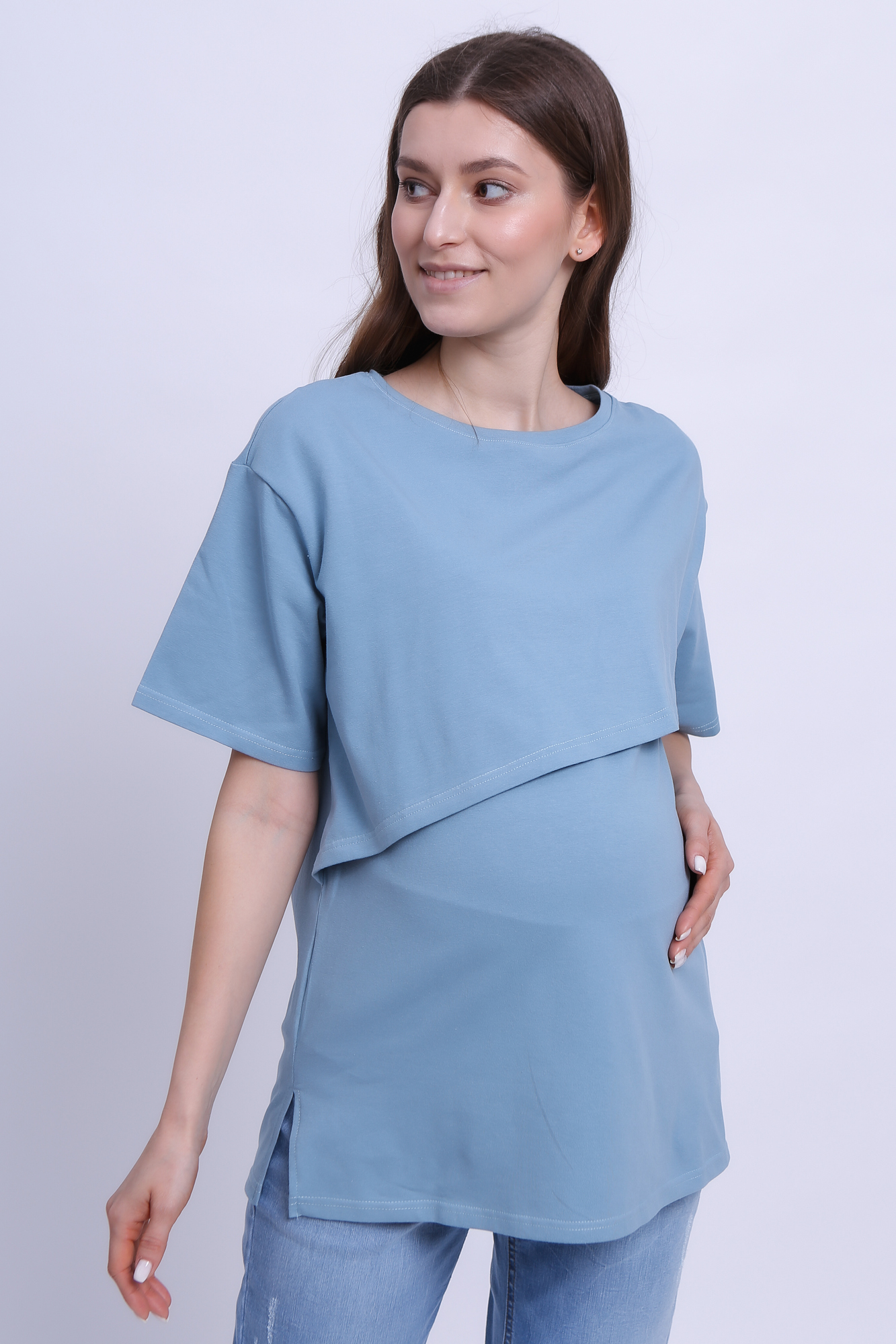 Футболка свободного кроя для беременных и кормящих выполнена из хлопкового трикотажа. Благодаря фасону оверсайз футболку можно носить на любом сроке беременности и после нее. Специальная конструкция позволяет комфортно покормить малыша в любой ситуации.