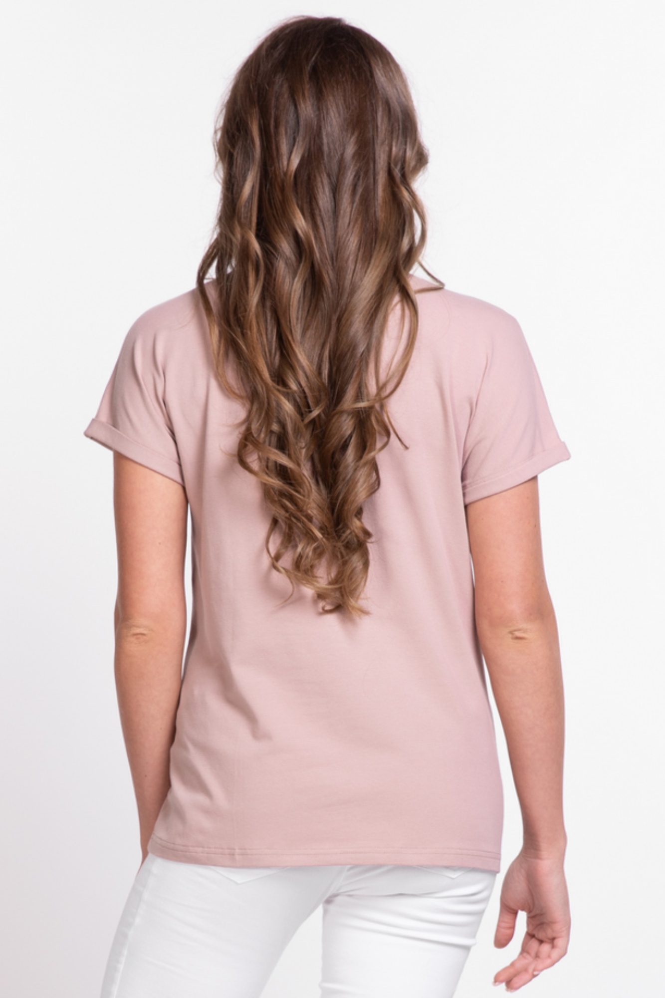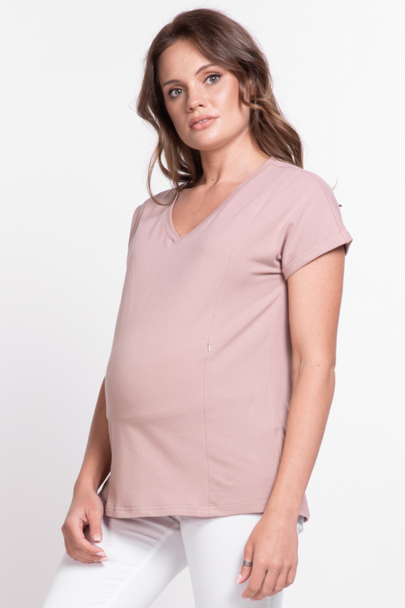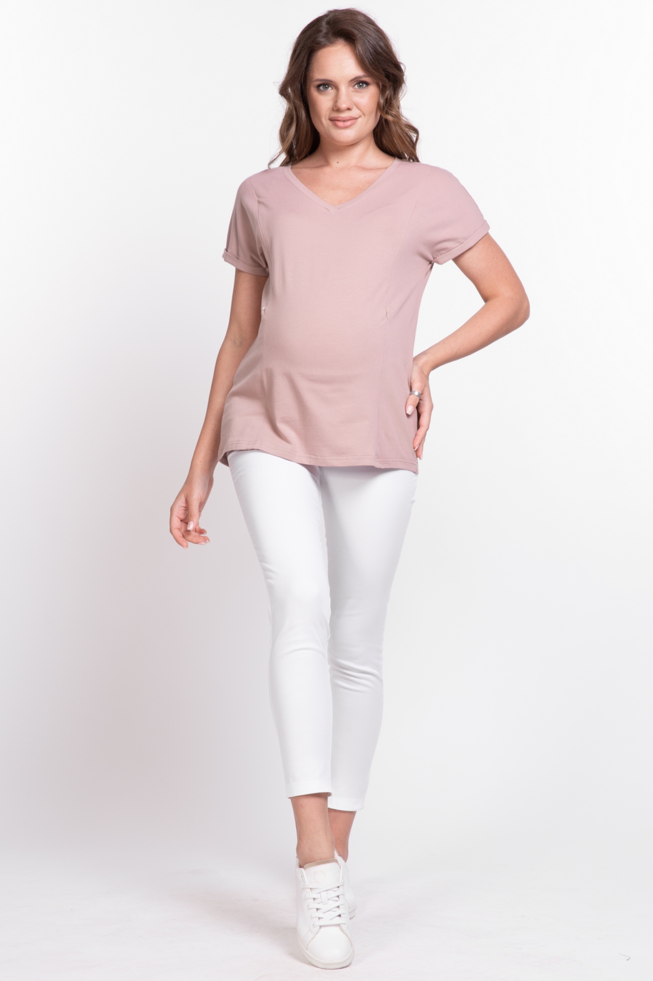 Футболка свободного кроя – такой фасон можно носить на любом сроке беременности, после родов скроет временные несовершенства фигуры. «Секрет» кормления – вертикальные потайные молнии – позволит покормить малыша с комфортом в любой ситуации.