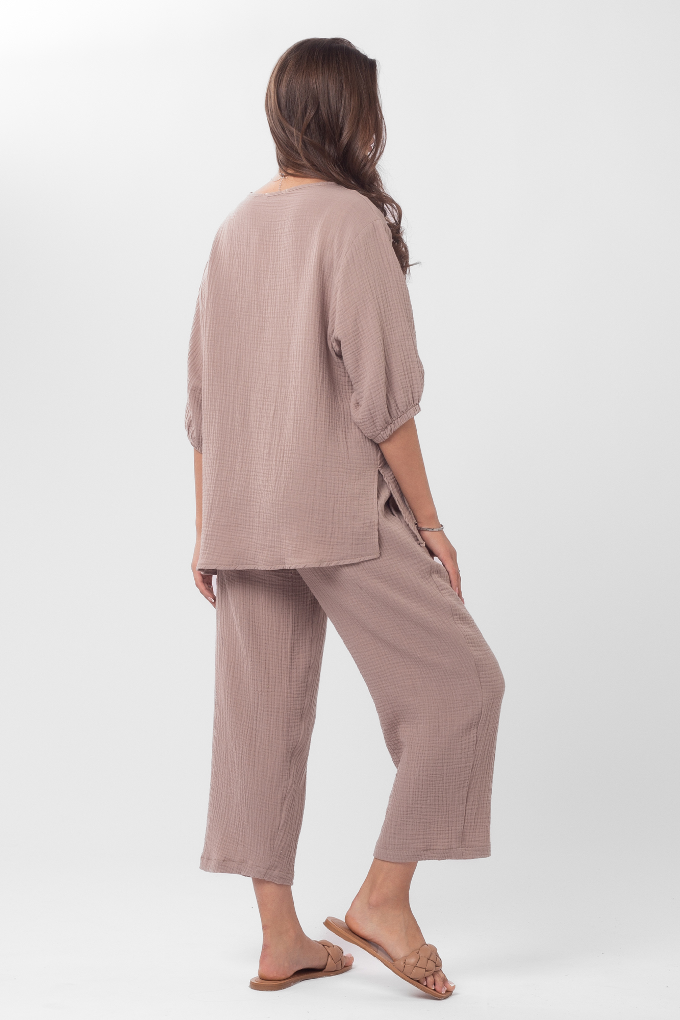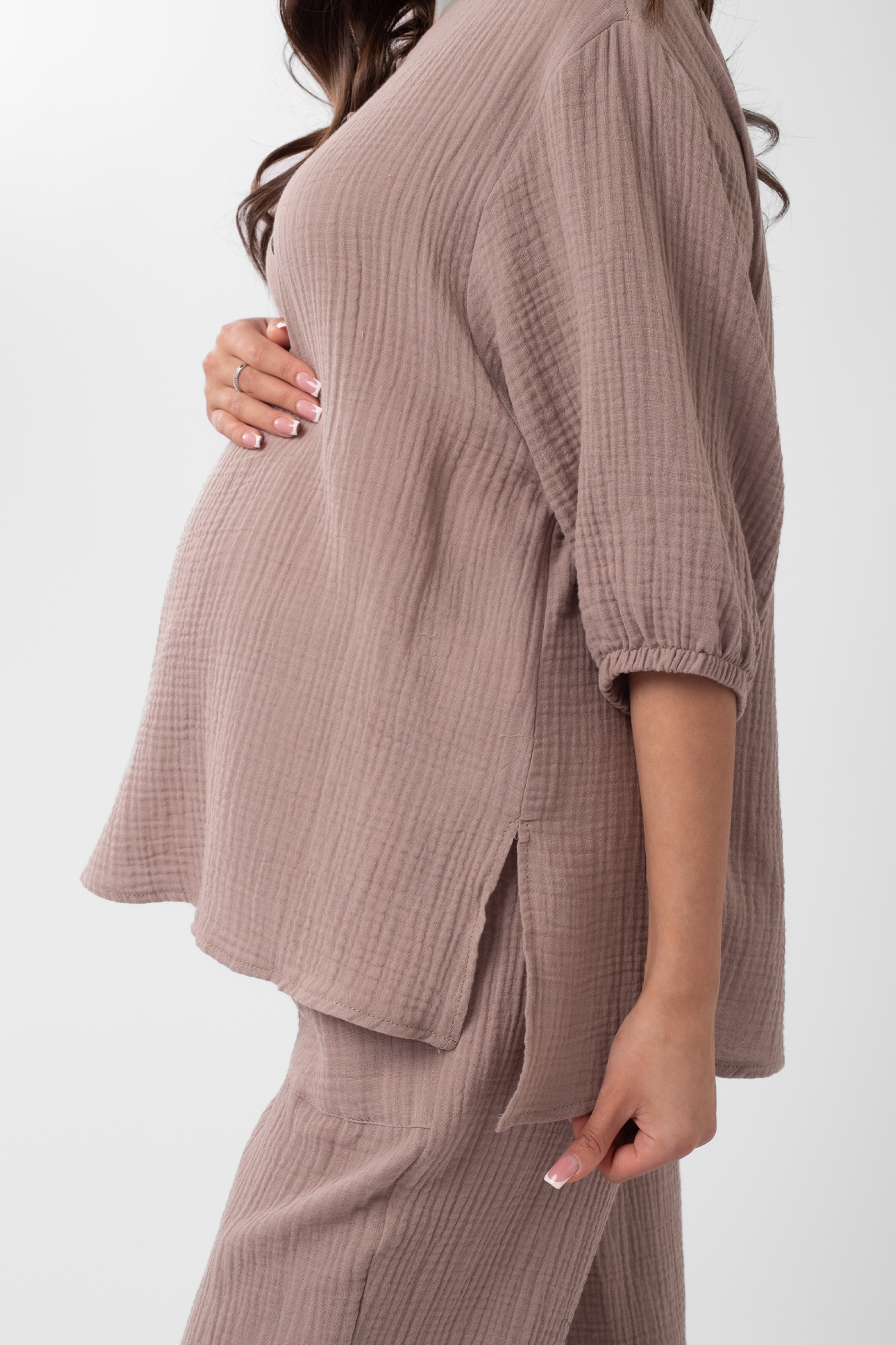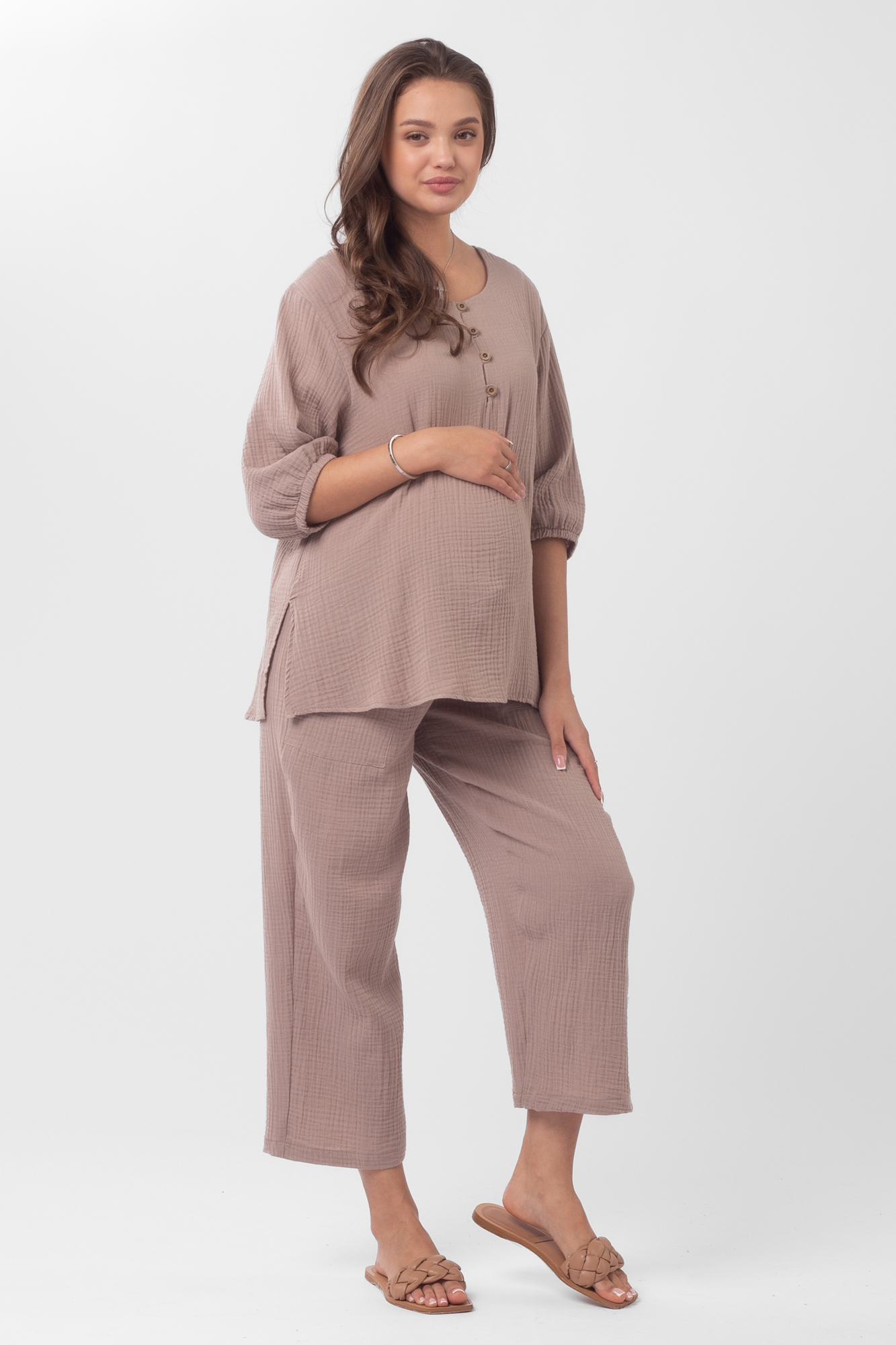 Стильный костюм для беременных из хлопокового муслина идеально подойдет на теплую весну и лето. Фактурная тканьна основе хлопка дышит, не раздражает кожу, легко впитывает влагу. В комплект входит две вещи: блузка с рукавом 3/4 на резинке и брюки кюлоты. Кофта с удлиненной спинкой, небольшими разрезами по бокам, круглой горловиной, украшена пугов. Штаны свободного кроя и укороченной длины оснащены низким поясом с мягкой резинкой и шнуровкой для регулировки объема. Легкий костюм можно носить на любом месяце беременности и после рождения малыша. Летний костюм с широкими укороченными брюками подойдет для повседневной носки, станет удобным нарядом для офиса, встречи с друзьями или на выписку. Костюм в духе oversize выполнен в стандартной размерной линейке и представлен в двух пастельных однотонных расцветках.