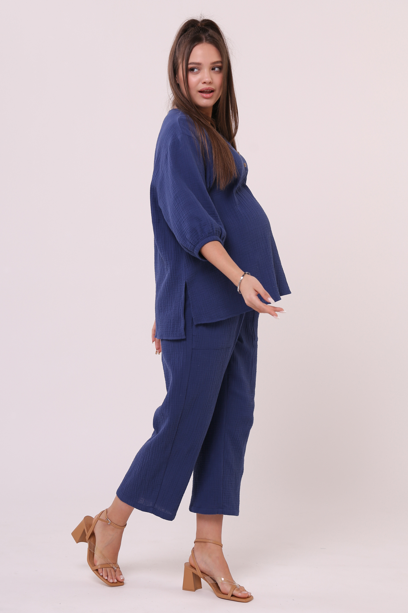 Стильный костюм для беременных из хлопокового муслина идеально подойдет на теплую весну и лето. Фактурная тканьна основе хлопка дышит, не раздражает кожу, легко впитывает влагу. В комплект входит две вещи: блузка с рукавом 3/4 на резинке и брюки кюлоты. Кофта с удлиненной спинкой, небольшими разрезами по бокам, круглой горловиной, украшена пугов. Штаны свободного кроя и укороченной длины оснащены низким поясом с мягкой резинкой и шнуровкой для регулировки объема. Легкий костюм можно носить на любом месяце беременности и после рождения малыша. Летний костюм с широкими укороченными брюками подойдет для повседневной носки, станет удобным нарядом для офиса, встречи с друзьями или на выписку. Костюм в духе oversize выполнен в стандартной размерной линейке и представлен в двух пастельных однотонных расцветках.