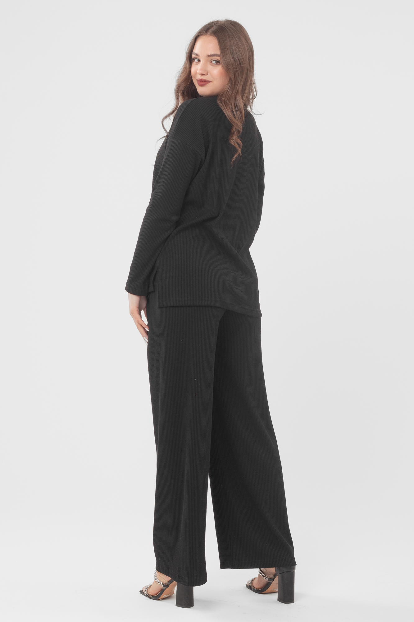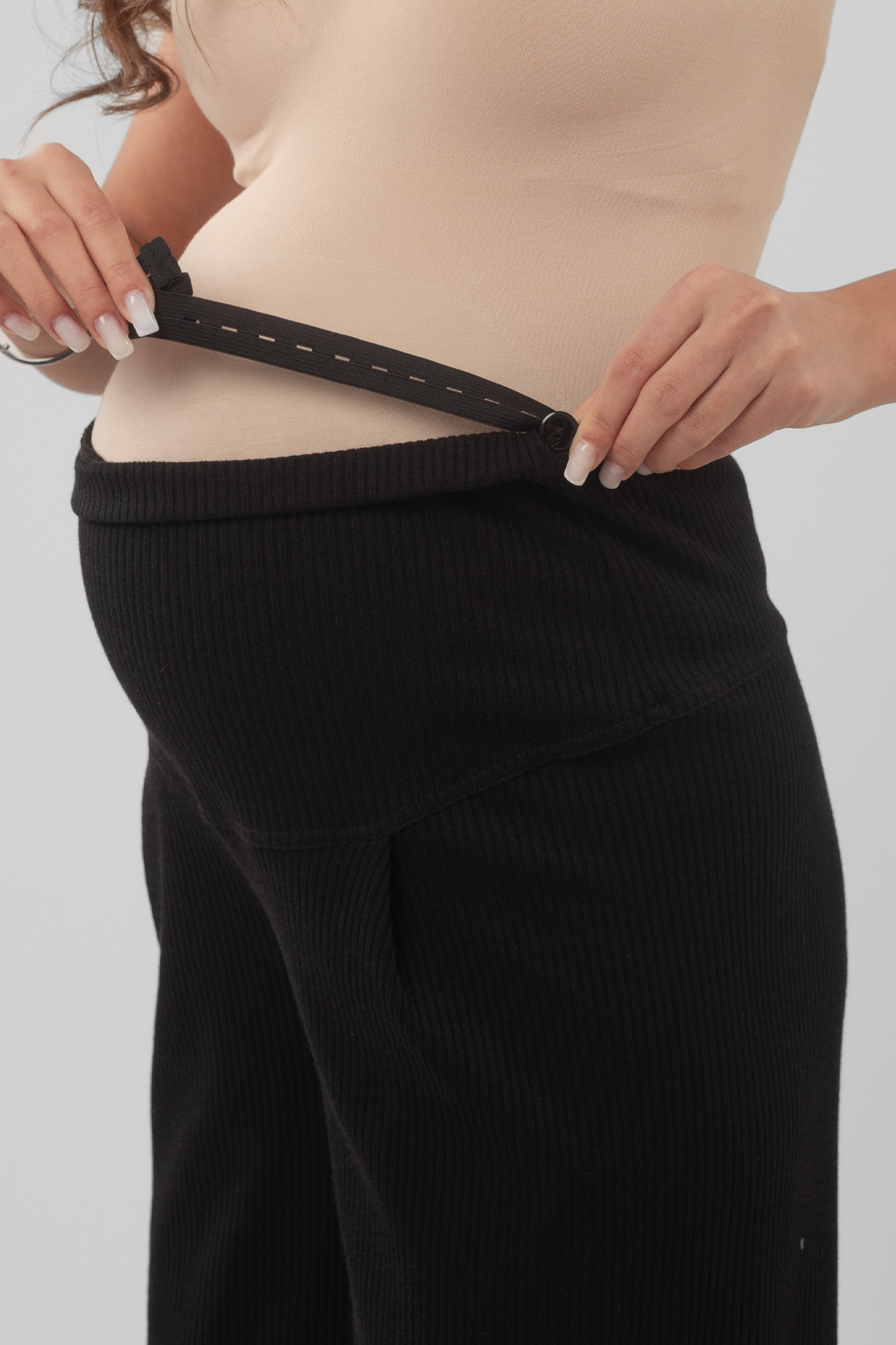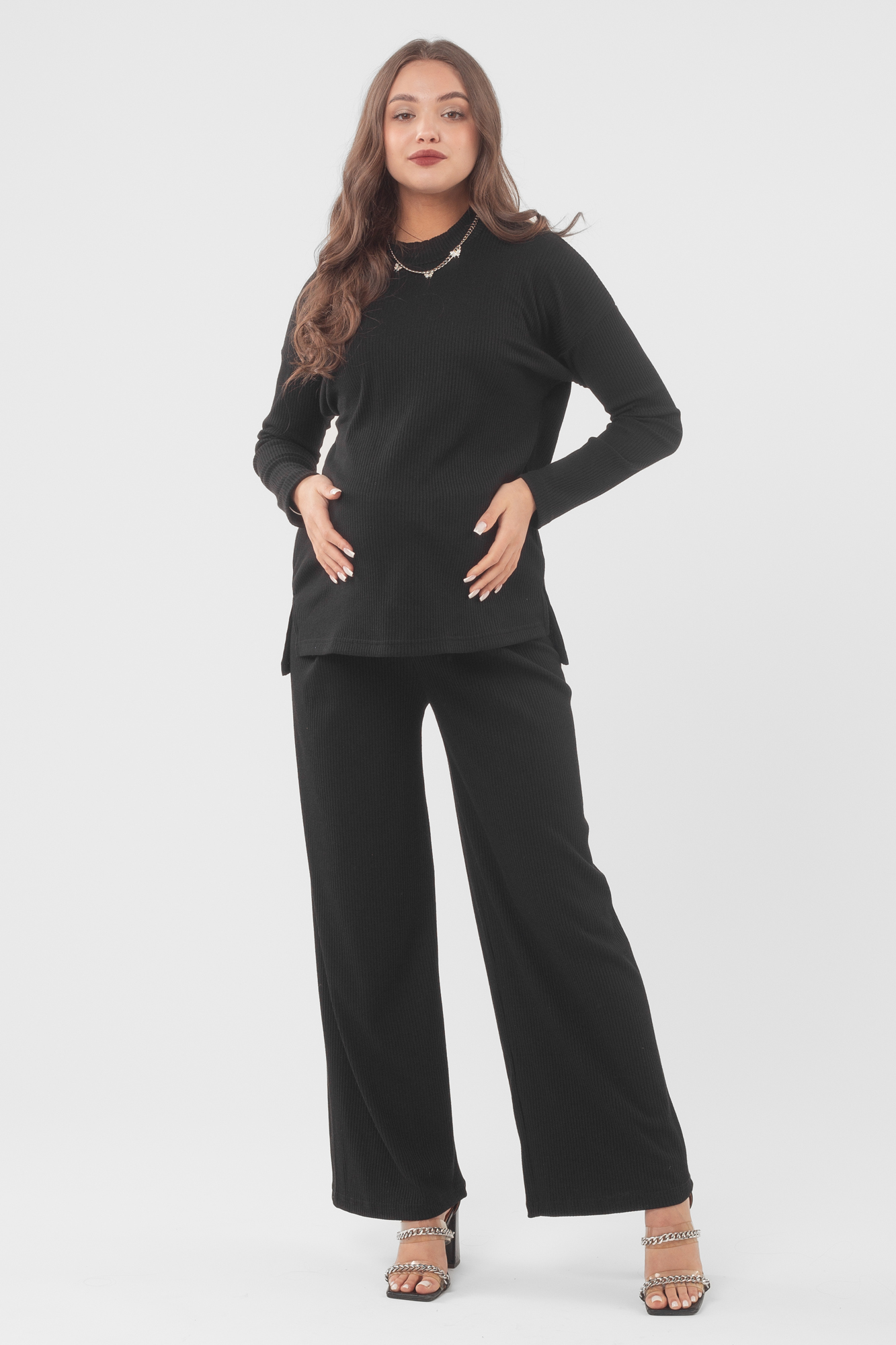 Оригинальный костюм в рубчик для беременных выполнен из высококачественного трикотажа-лапши. Костюм состоит из джемпера и брюк. Джемпер с воротником-стойкой, длинным рукавом, заниженной линией плеча, разрезами по бокам изделия. Брюки широкого кроя с эластичной высокой вставкой-бандажом рассчитаны на весь период беременности. Объем регулируется с помощью перфорированной резинки, перестегивающейся на пуговицу. Идеальное сочетание стиля и комфорта!