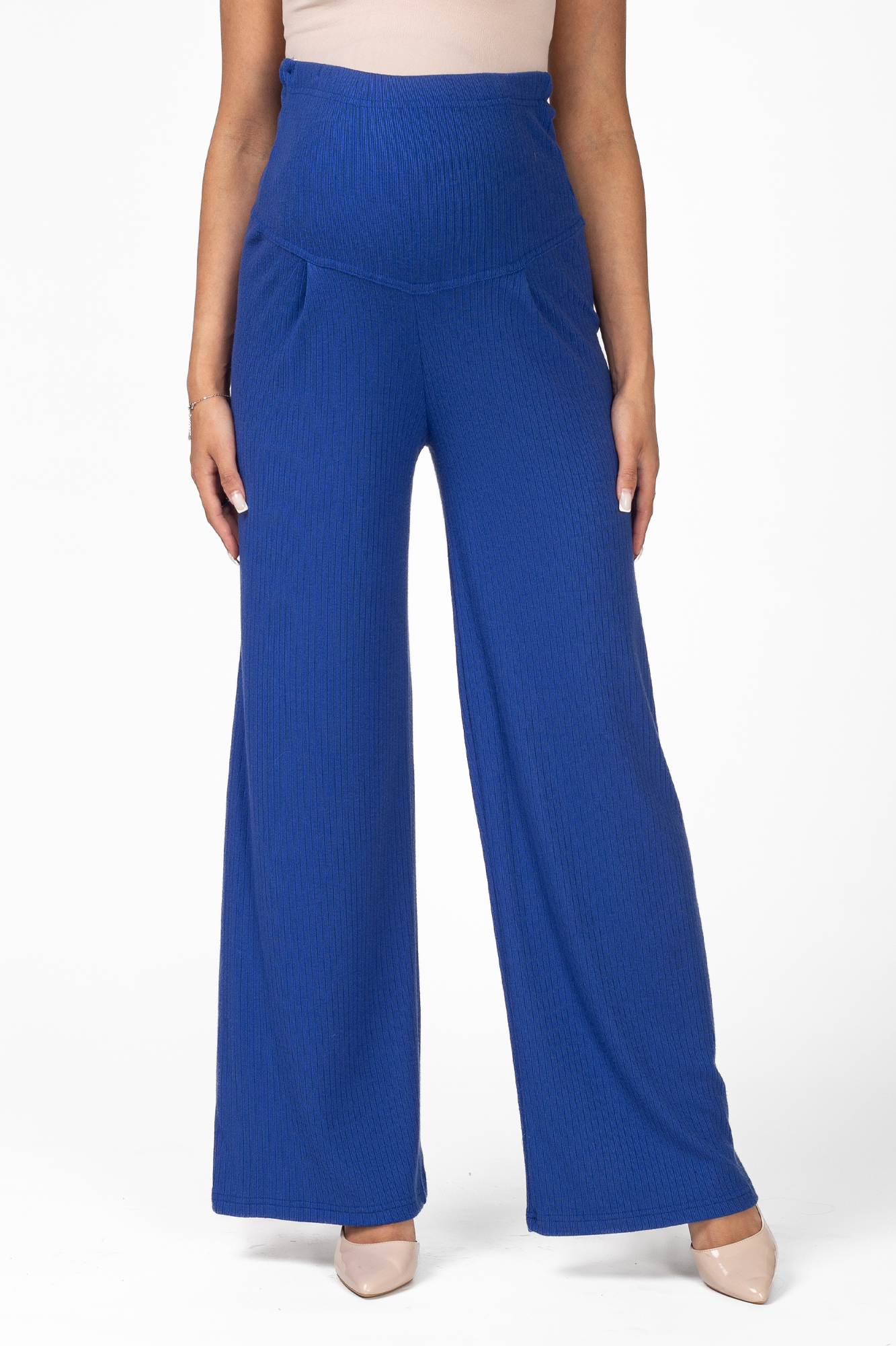 Брючный костюм для беременных сшит из качественного мягкого трикотажного материала. Фактурная ткань лапша в рубчик приятна на ощупь и гипоаллергенна. Женский костюм из трикотажа - удачный выбор для повседневного ношения. В комплект для будущих мам включены кофта и штаны. Джемпер со спущенной линией плеча слегка удлинен сзади, по бокам - небольшие разрезы. Штаны широкие, прямого кроя, с высоким эластичным поясом, который выполняет роль бандажа. Модель рассчитана на весь период беременности: обхват регулируется за счет пуговицы на резинке. Брючный костюм для беременных подойдет для прогулок, офиса или ношения дома.