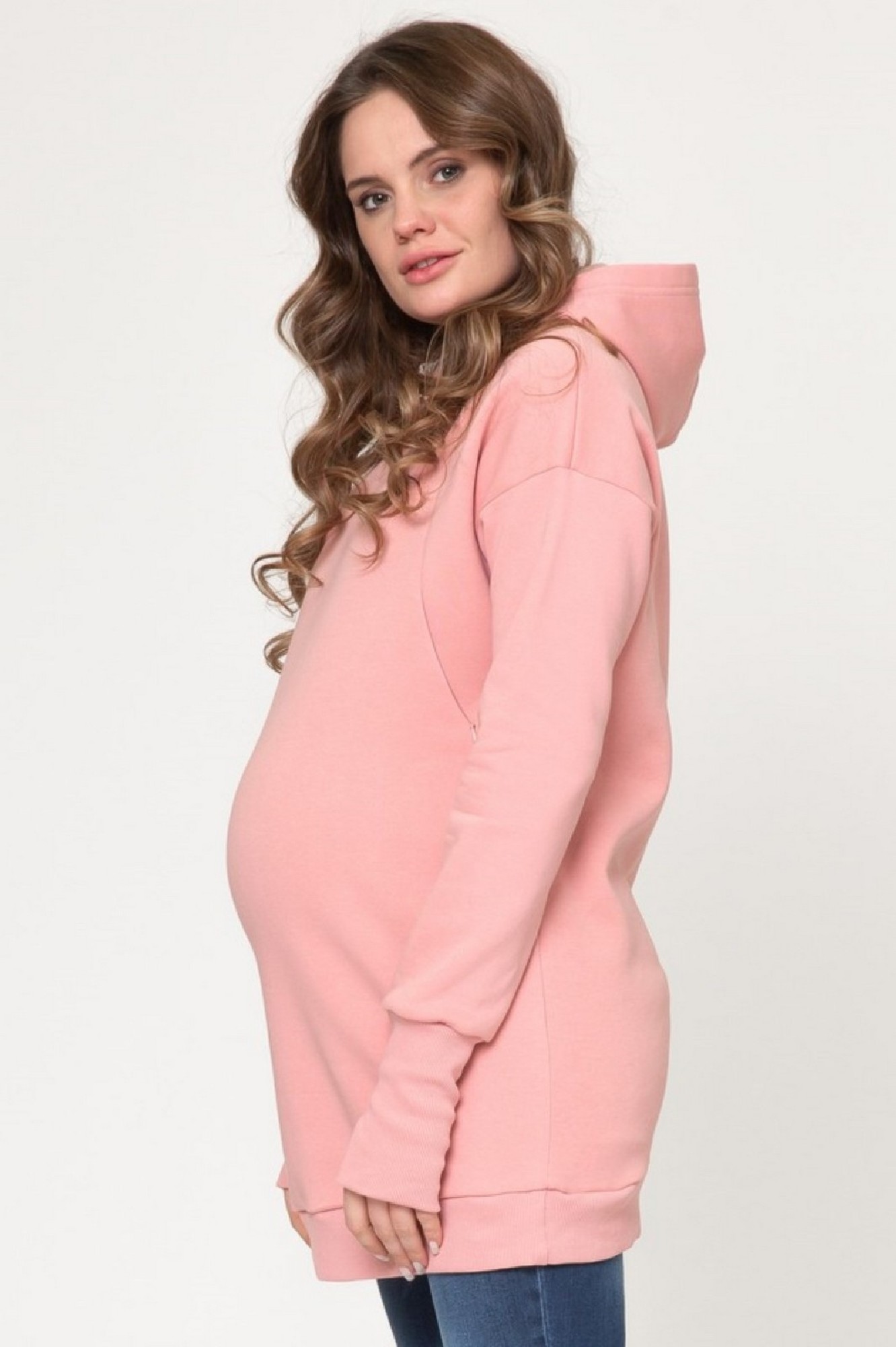 Удлиненное худи для беременных и кормящих выполнено из высококачественного трехниточного футера с начесом. Особый крой позволяет носить изделие на всем протяжении беременности и после нее. Благодаря вертикальным потайным молниям Вы сможете покормить малыша с комфортом в любой ситуации.