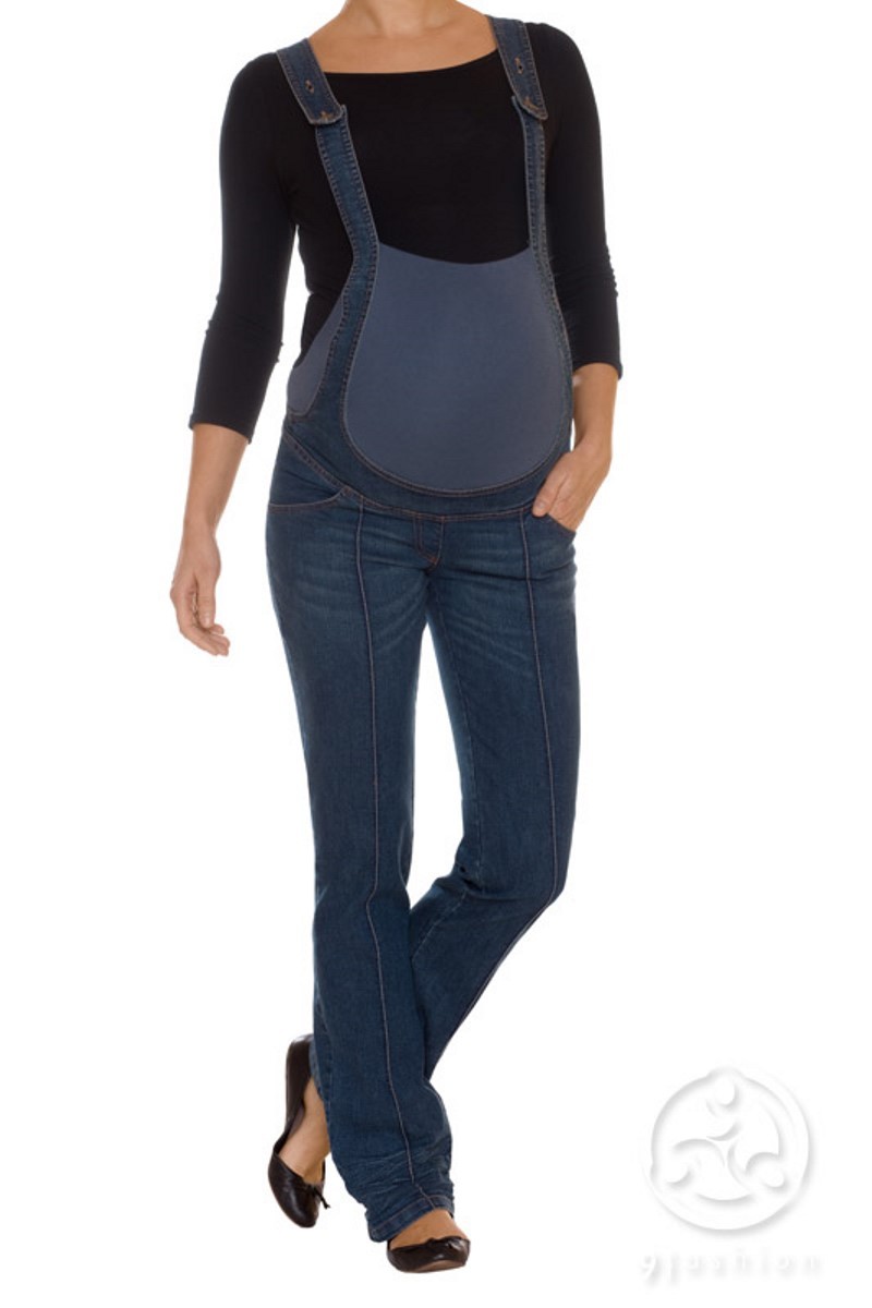 Комбинезон для беременных выполнен из эластичного денима. Детали: регулируемые лямки, трикотажные вставки по бокам и на животике. Прямая модель с застроченными стрелками на брючинах.