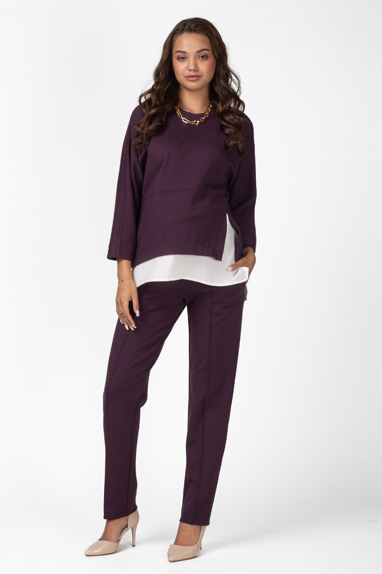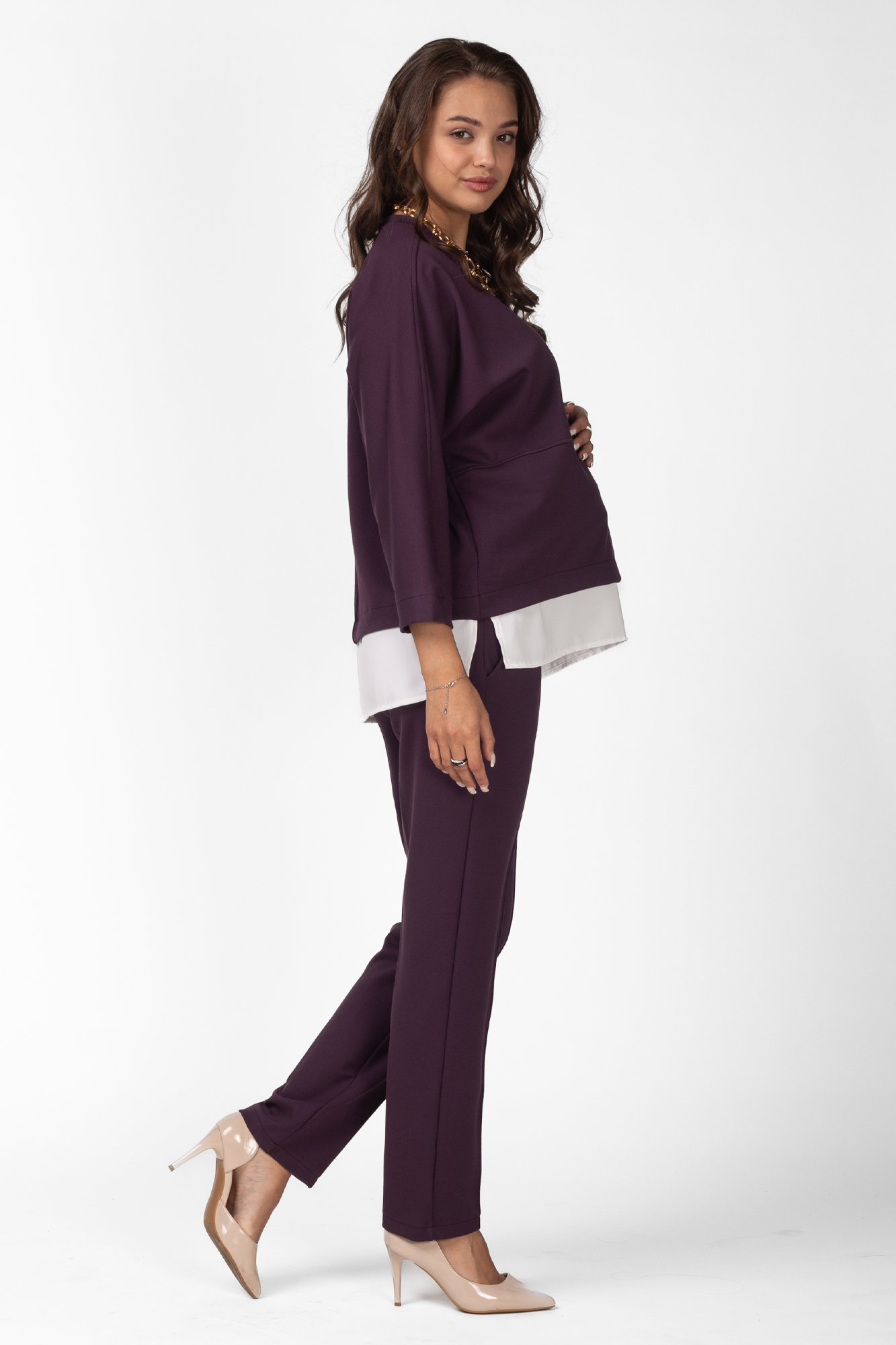 Стильный костюм для беременных выполнен из высококачественного джерси. Костюм состоит из оригинального двуслойного джемпера свободного кроя и брюк с высокой посадкой. Объем регулируется с помощью перфорированной резинки перестегивающейся на пуговицу. Брюки декорированы отстроченными стрпелками. Идеальная посадка на протяжении всей беременности и после родов. Костюм подойдет для офиса, прогулок и просто на каждый день.