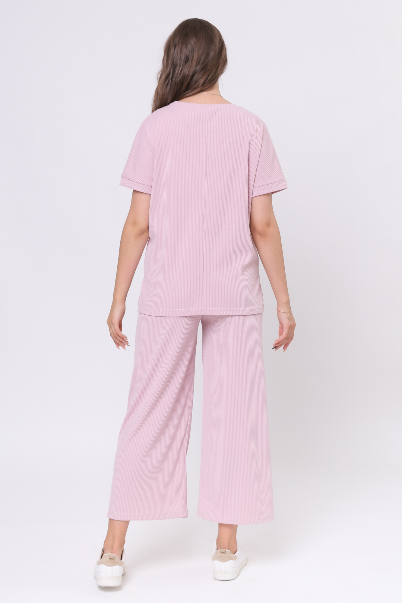 Оригинальный костюм для беременных в рубчик. Костюм состоит из джемпера и брюк. Джемпер с округлым вырезом горловины, коротким рукавом, заниженной линией плеча, разрезами по бокам изделия. Брюки-кюлоты с эластичной высокой вставкой-бандажом рассчитаны на весь период беременности. Идеальное сочетание стиля и комфорта!