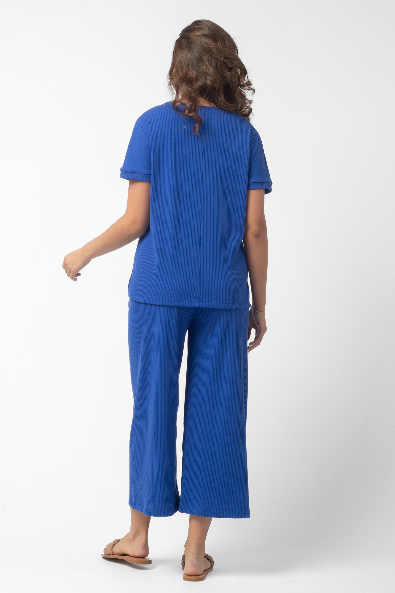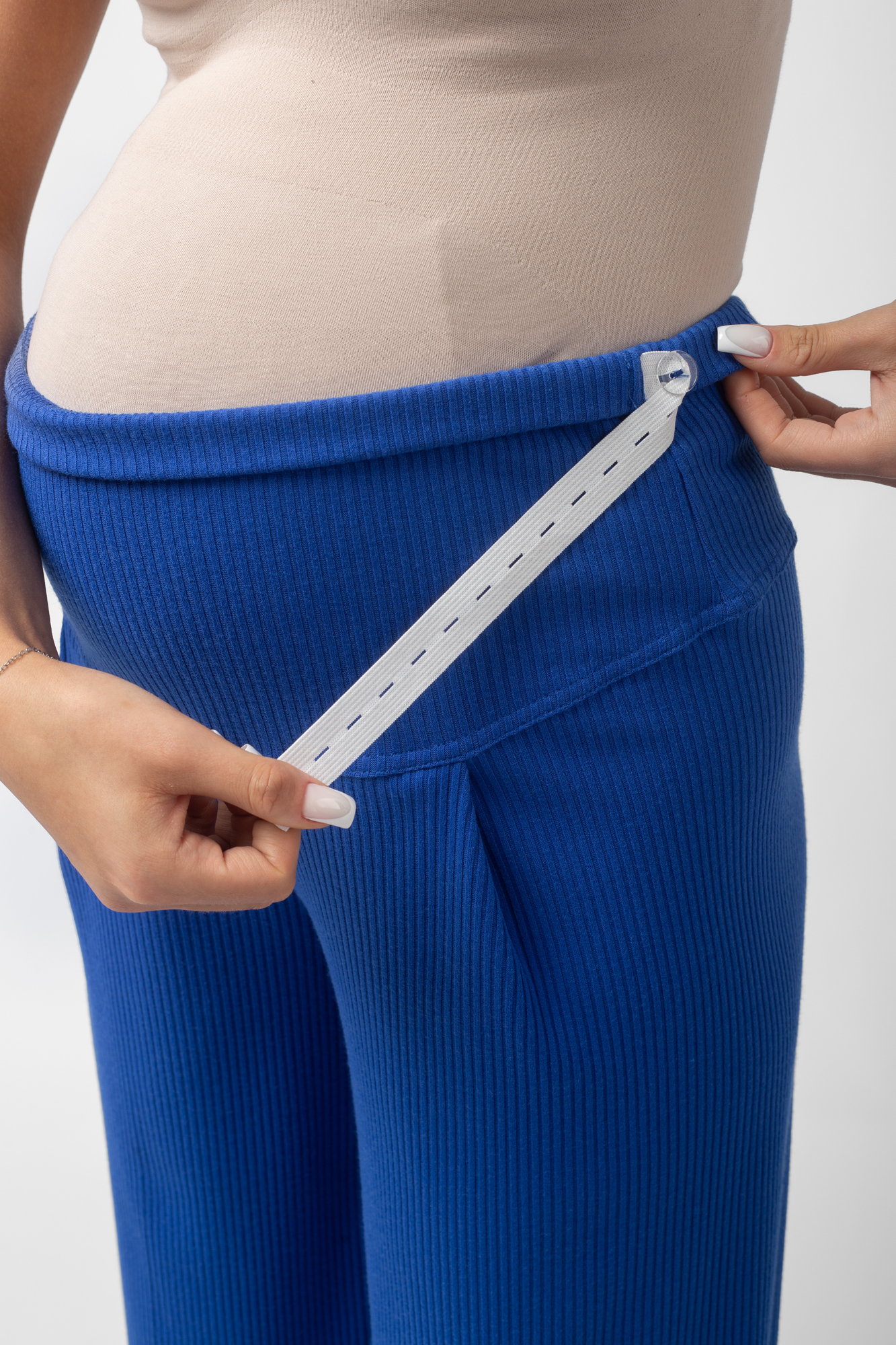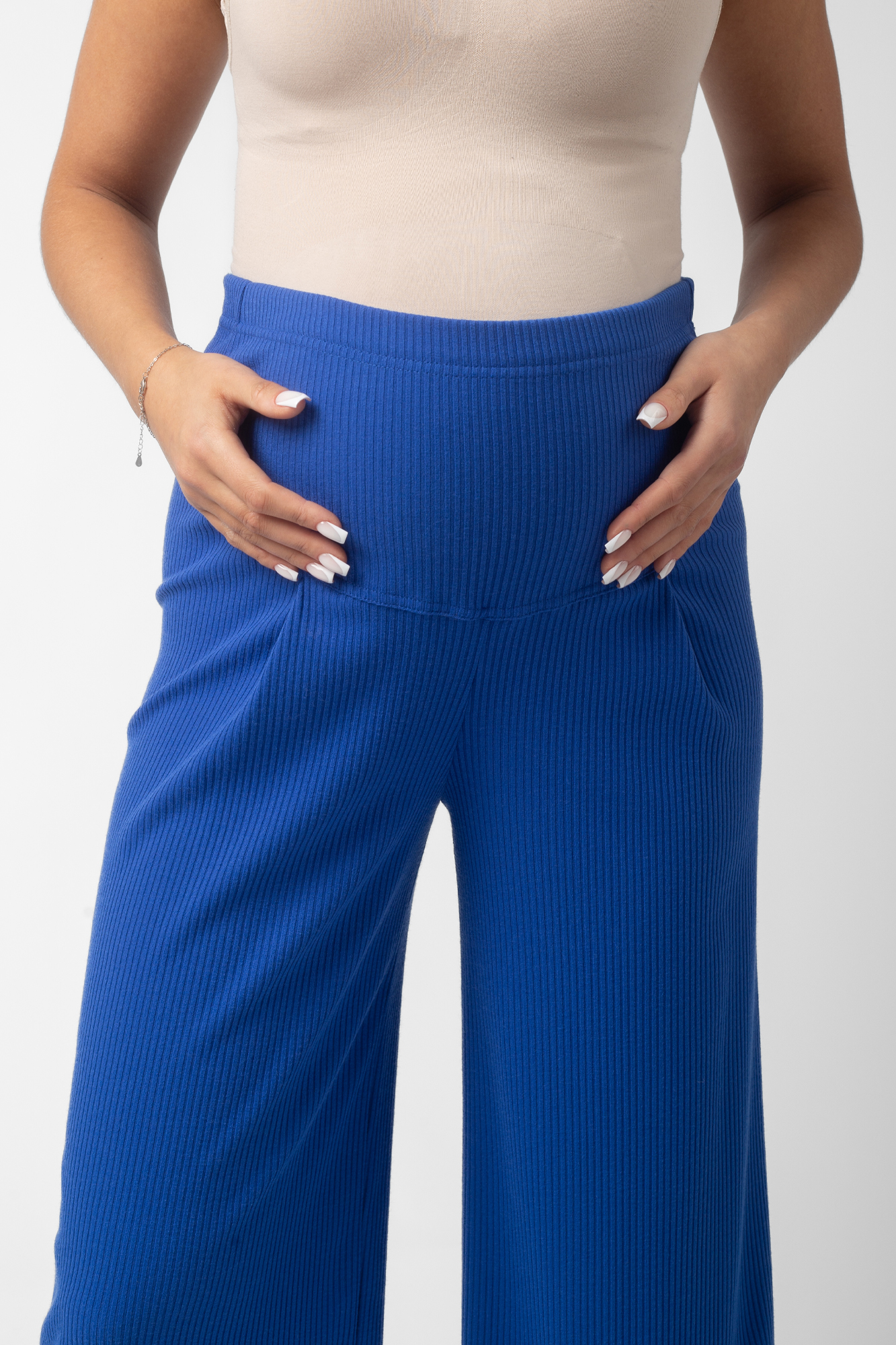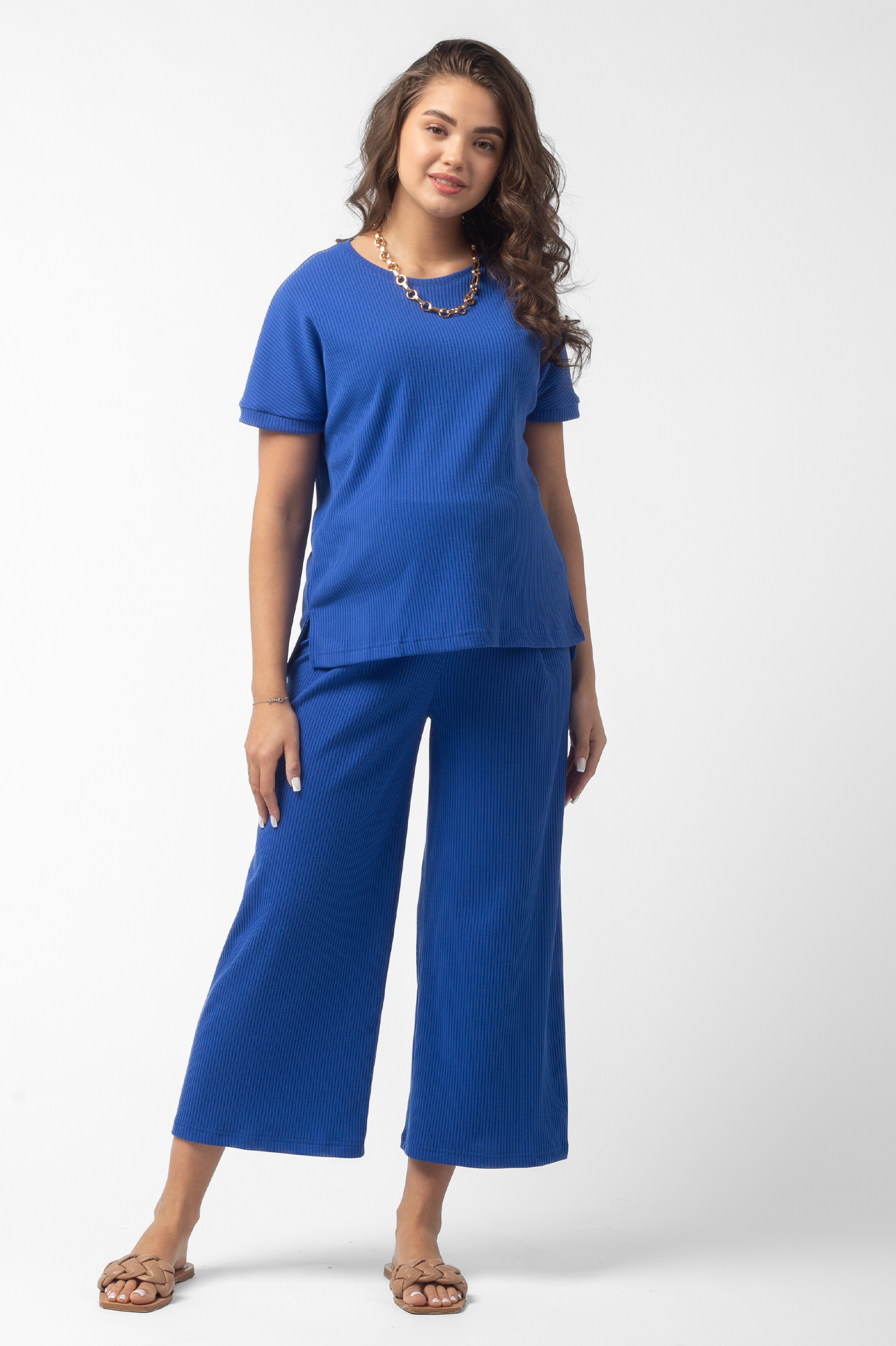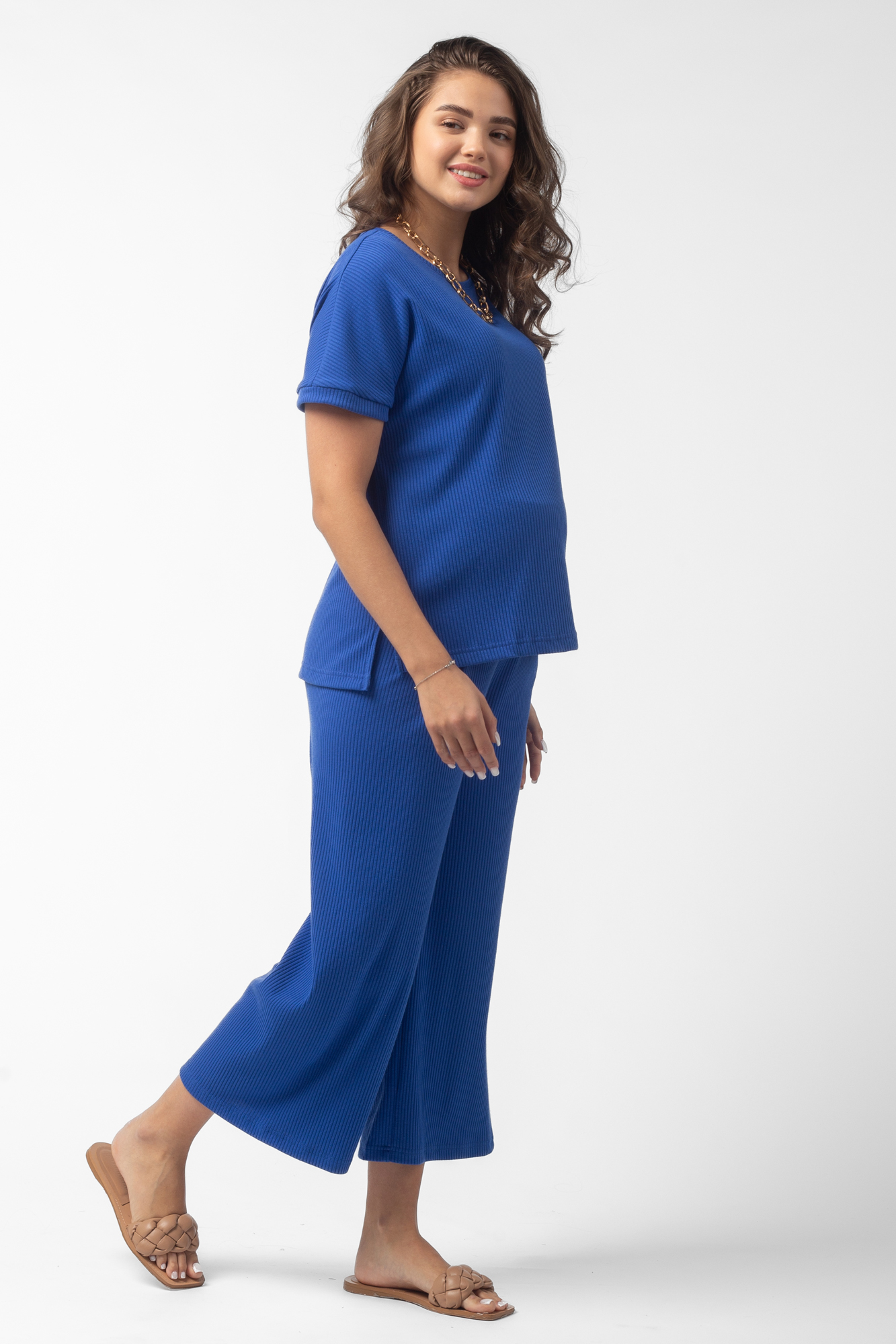 Оригинальный костюм для беременных в рубчик. Костюм состоит из джемпера и брюк. Джемпер с округлым вырезом горловины, коротким рукавом, заниженной линией плеча, разрезами по бокам изделия. Брюки-кюлоты с эластичной высокой вставкой-бандажом рассчитаны на весь период беременности. Идеальное сочетание стиля и комфорта!