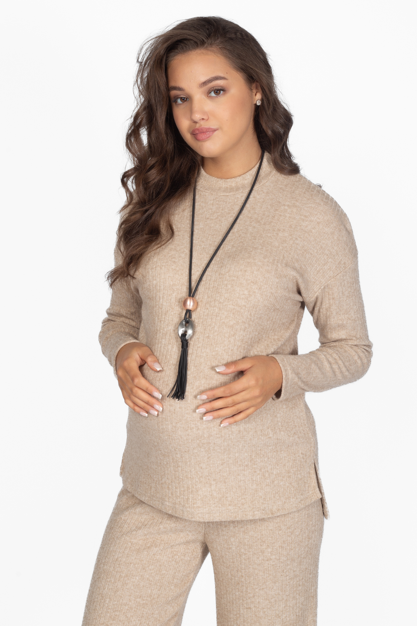 Брючный костюм для беременных сшит из качественного теплого вязанного трикотажного материала. Фактурная ткань лапша в рубчик приятна на ощупь, гипоаллергенна и отлично согревает в непогоду. Женский костюм из трикотажа - удачный выбор для повседневного ношения в холодное время года. В комплект для будущих мам включены кофта и штаны. Джемпер со спущенной линией плеча слегка удлинен сзади, по бокам - небольшие разрезы. Штаны широкие, прямого кроя, с высоким эластичным поясом, который выполняет роль бандажа. Модель рассчитана на весь период беременности: обхват регулируется за счет пуговицы на резинке. Брючный костюм для беременных подойдет для прогулок, офиса или ношения дома. В осенний и весенний периоды он пригодится на выписку. Модель предлагается в нескольких однотонных расцветках и полной размерной линейке.