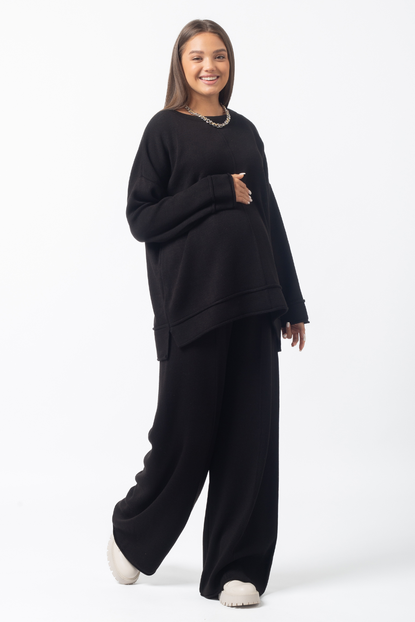 Теплый вязаный костюм для беременных. Модель выполнена из мягкого полотна мелкой вязки с добавлением акрила и шерсти. Костюм состоит из двух вещей. Джемпер прекрасно садится на фигуру будущей мамы, не обтягивая животик. Дополнен декоративными элементами в виде закрученного края и оригинальной вязки. Широкие штаны палаццо оснащены эластичной мягкой резинкой, которая не давит на животик. Брюки дополнены карманами спереди. Данная модель идеально садится на животик с первых месяцев и до последнего. За счет удобной резинки костюм можно будет носить и после рождения малыша. Такой костюм можно носить в офис, на прогулку, на мероприятия. Свободный крой оверсайз обеспечивает комфорт и удобство на протяжении всего срока беременности. Идеальная модель на весну или прохладное лето.