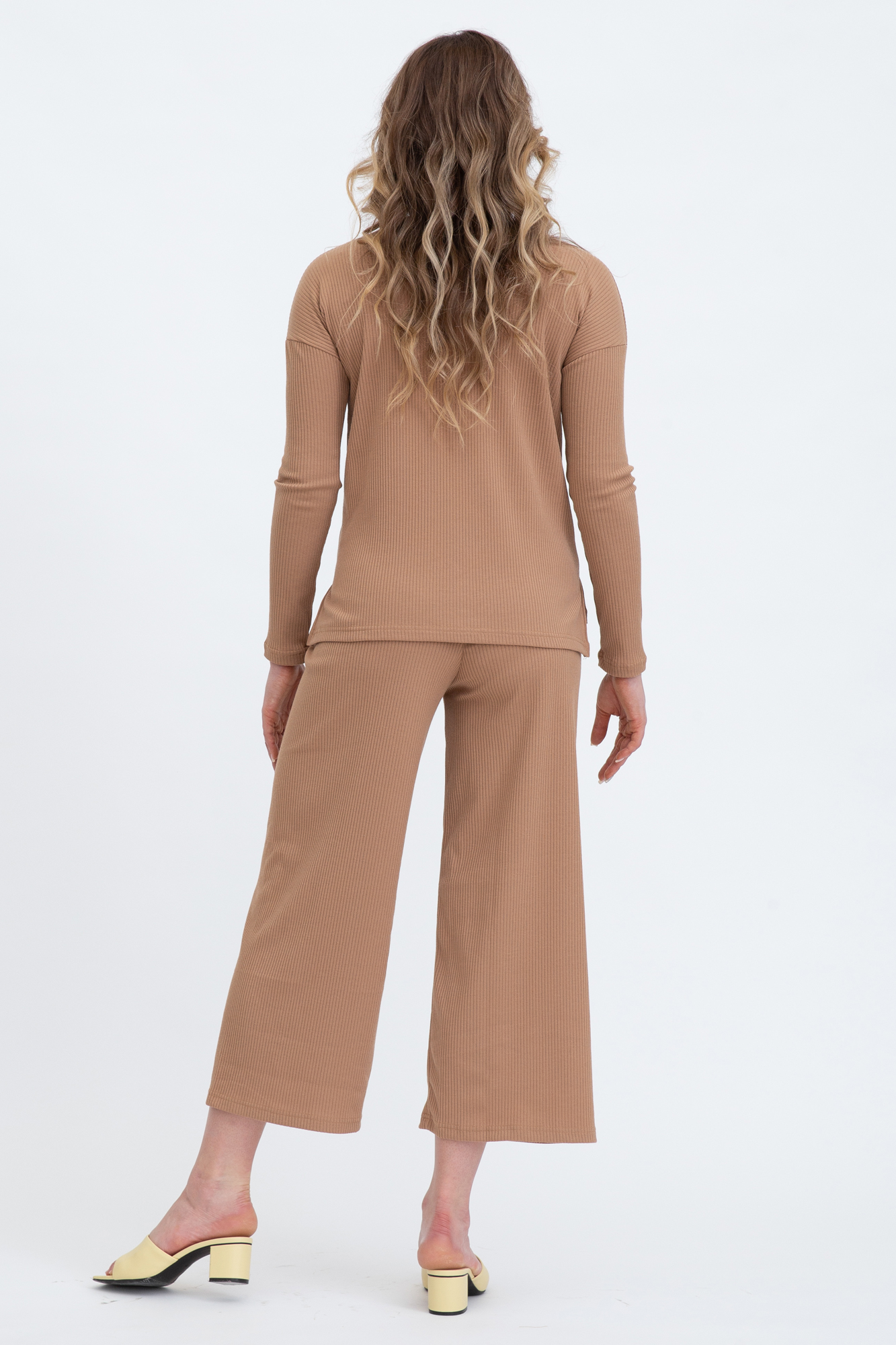 Оригинальный костюм в рубчик для беременных. Костюм состоит из джемпера и брюк. Джемпер с округлым вырезом горловины, длинным рукавом, заниженной линией плеча, разрезами по бокам изделия. Брюки-кюлоты с эластичной высокой вставкой-бандажом рассчитаны на весь период беременности. Идеальное сочетание стиля и комфорта!