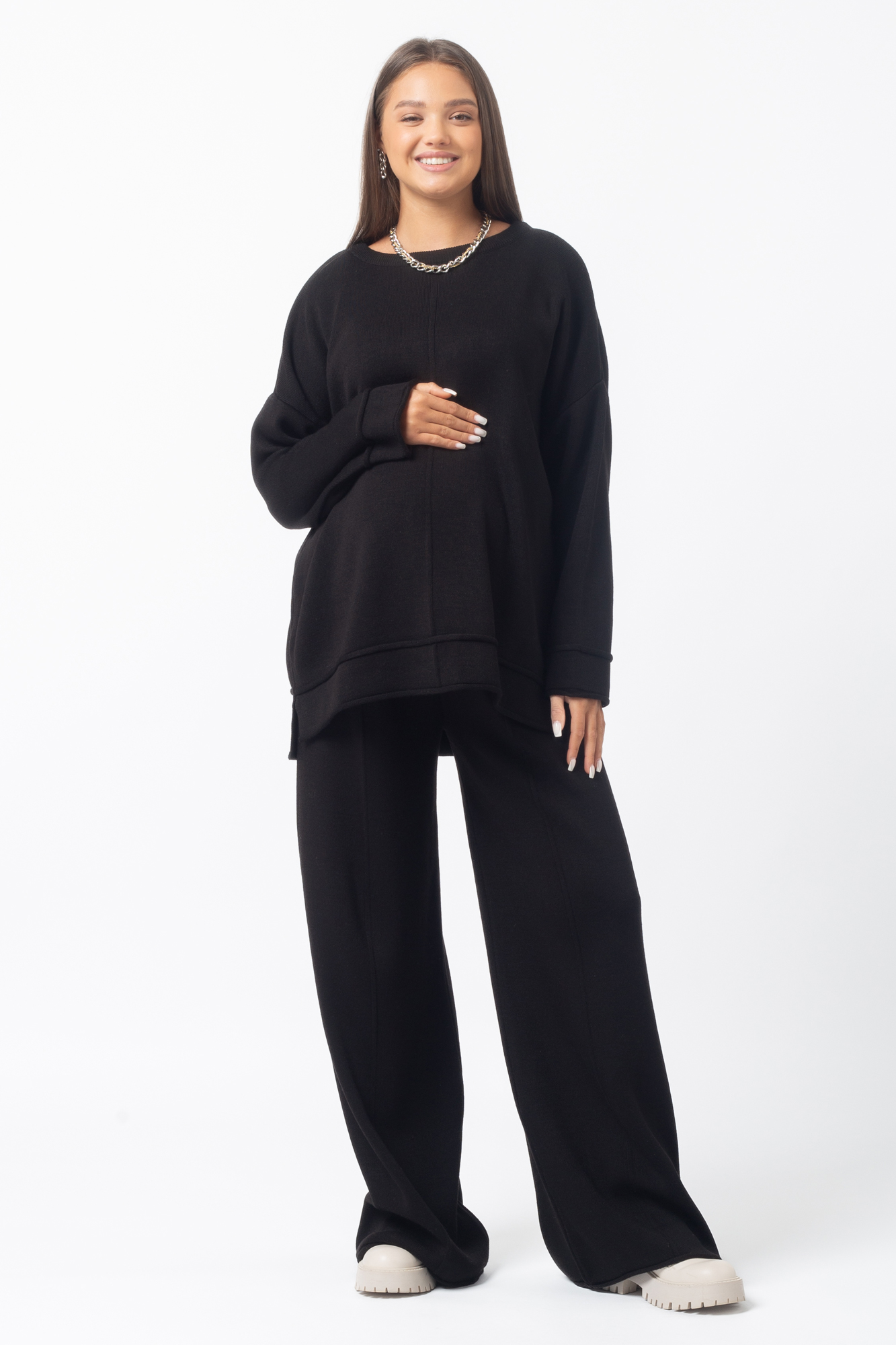 Теплый вязаный костюм для беременных. Модель выполнена из мягкого полотна мелкой вязки с добавлением акрила и шерсти. Костюм состоит из двух вещей. Джемпер прекрасно садится на фигуру будущей мамы, не обтягивая животик. Дополнен декоративными элементами в виде закрученного края и оригинальной вязки. Широкие штаны палаццо оснащены эластичной мягкой резинкой, которая не давит на животик. Брюки дополнены карманами спереди. Данная модель идеально садится на животик с первых месяцев и до последнего. За счет удобной резинки костюм можно будет носить и после рождения малыша. Такой костюм можно носить в офис, на прогулку, на мероприятия. Свободный крой оверсайз обеспечивает комфорт и удобство на протяжении всего срока беременности. Идеальная модель на весну или прохладное лето.