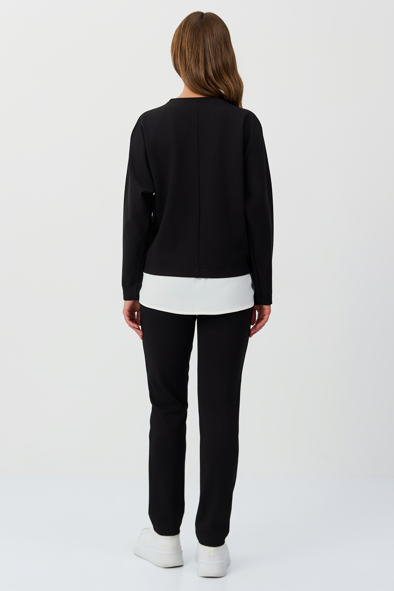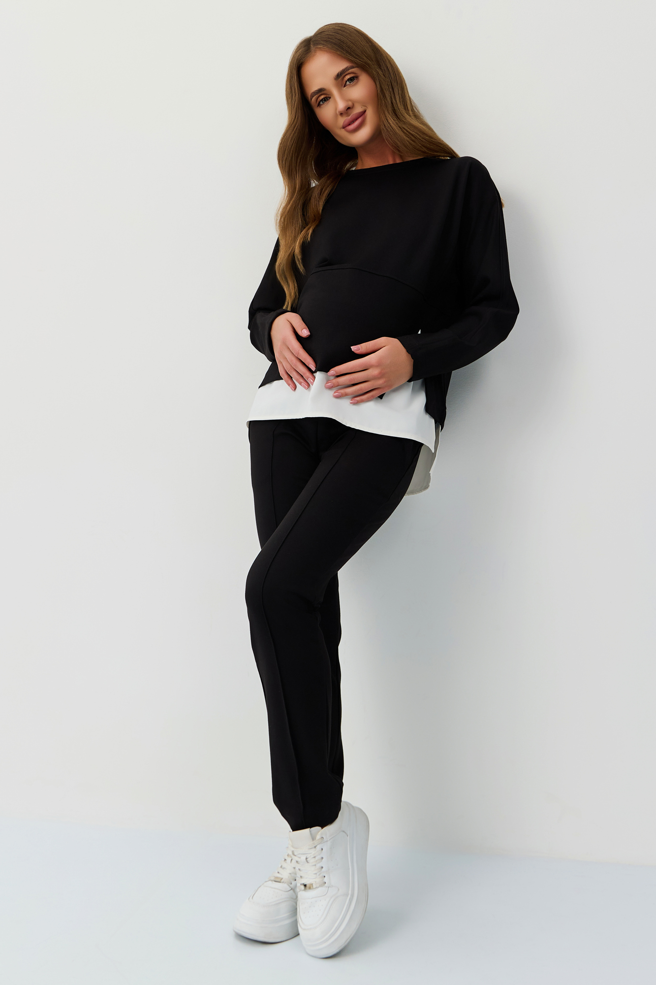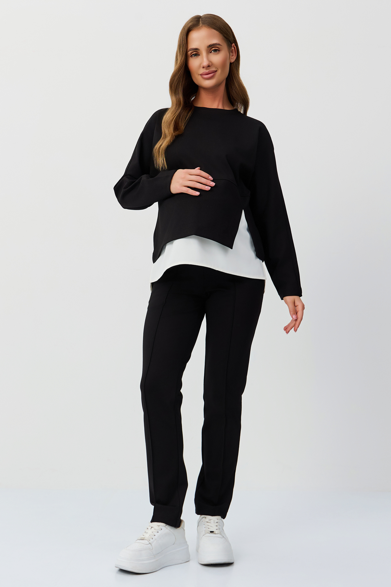 Костюм для беременных выполнен из трикотажа джерси премиум качества. Оригинальный брючный костюм для беременных придётся по вкусу будущим мамам, предпочитающим деловой стиль. Материал на основе вискозы обладает отменной износостойкостью, не покрывается катышками и не мнется. Джемпер трикотажный двухслойный, свободного кроя, с асимметричным боковым разрезом. Рукава изделия длинные, вырез горловины круглый. Брюки зауженные, стандартной длины, с высокой посадкой. Широкий эластичный пояс мягко поддерживает животик, а регулировка объёма позволяет носить костюм в течение всей беременности и после рождения ребёнка. Костюм идеален для носки в осенний период.