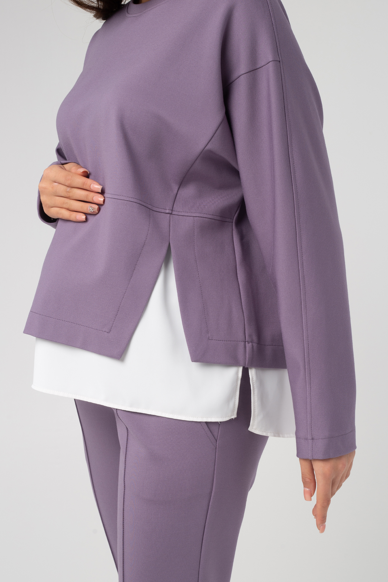 Костюм для беременных выполнен из трикотажа джерси премиум качества. Оригинальный брючный костюм для беременных придётся по вкусу будущим мамам, предпочитающим деловой стиль. Материал на основе вискозы обладает отменной износостойкостью, не покрывается катышками и не мнется. Джемпер трикотажный двухслойный, свободного кроя, с асимметричным боковым разрезом. Рукава изделия длинные, вырез горловины круглый. Брюки зауженные, стандартной длины, с высокой посадкой. Широкий эластичный пояс мягко поддерживает животик, а регулировка объёма позволяет носить костюм в течение всей беременности и после рождения ребёнка. Костюм идеален для носки в осенний период.