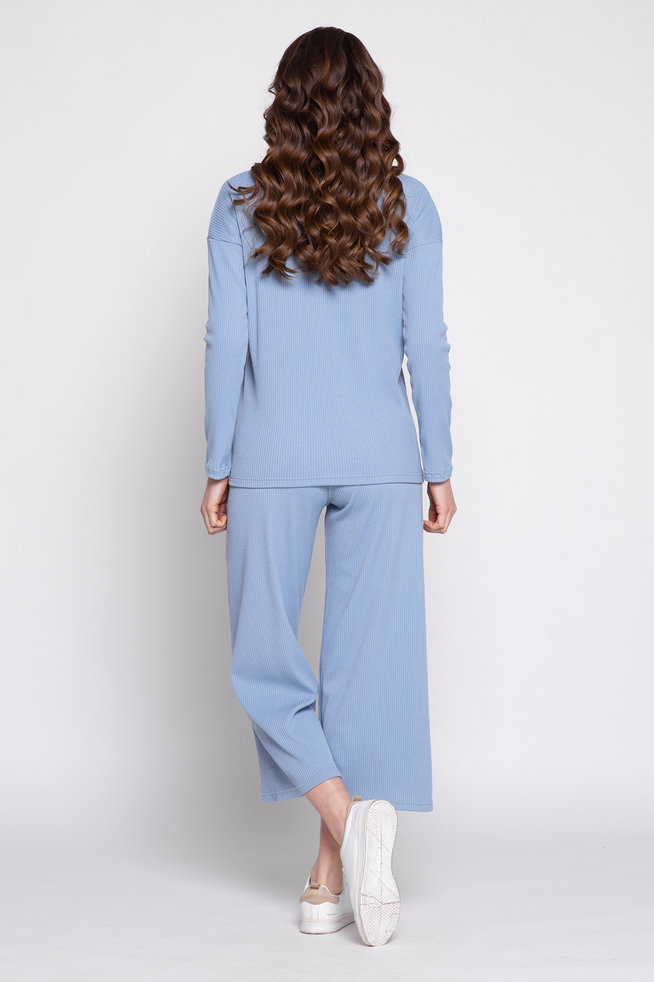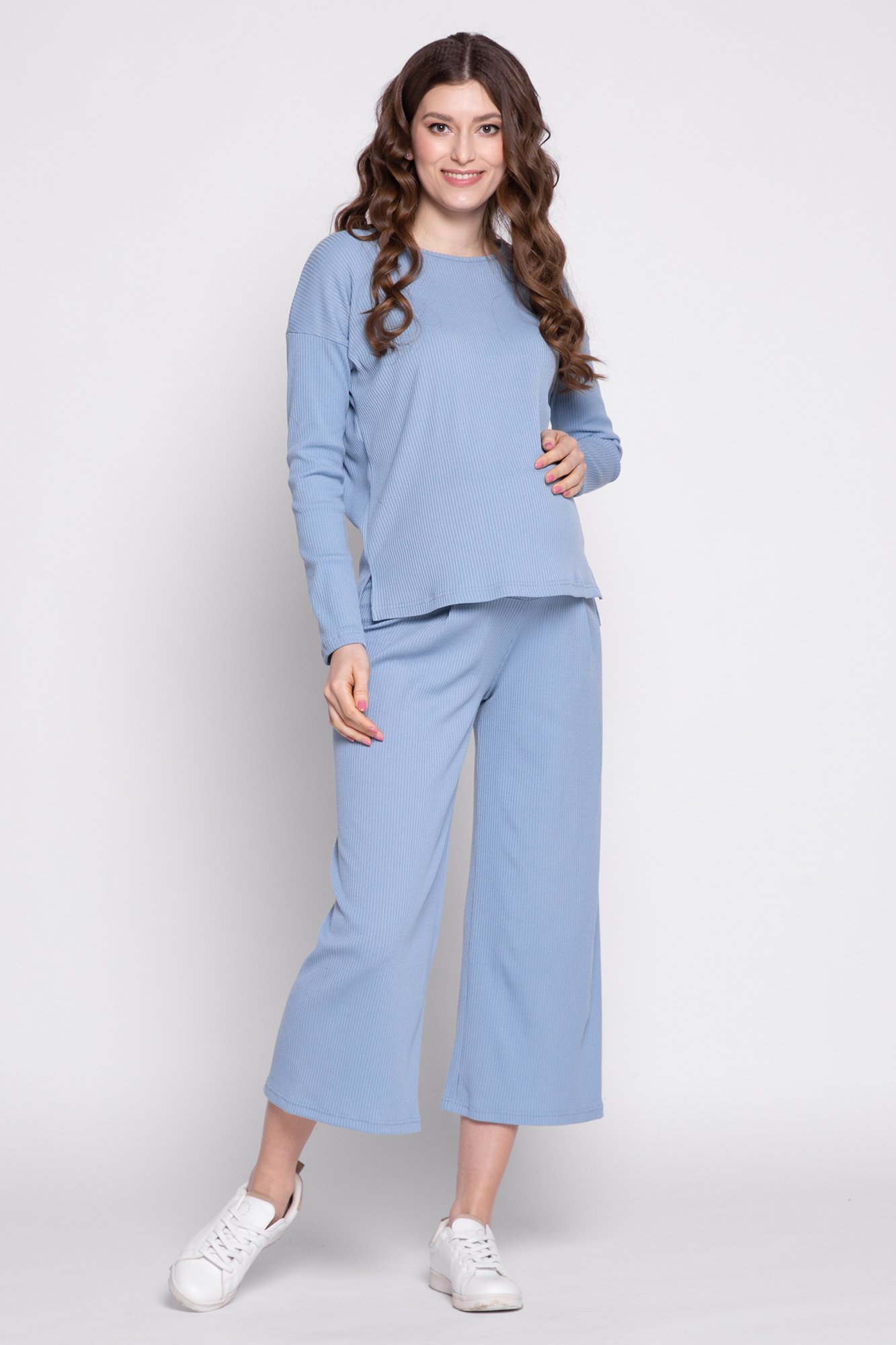 Оригинальный костюм в рубчик для беременных. Костюм состоит из джемпера и брюк. Джемпер с округлым вырезом горловины, длинным рукавом, заниженной линией плеча, разрезами по бокам изделия. Брюки-кюлоты с эластичной высокой вставкой-бандажом рассчитаны на весь период беременности. Идеальное сочетание стиля и комфорта!