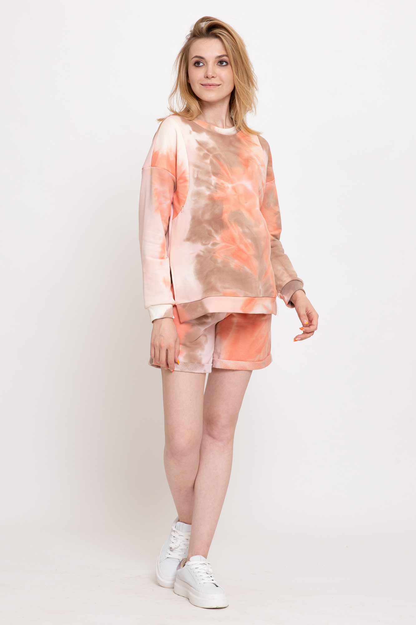 Спортивный костюм из высококачественного трехниточного футера (петля) для беременных и кормящих. Свитшот имеет «секрет» кормления – вертикальные потайные молнии – позволит покормить малыша с повышенным комфортом в любой ситуации. Шорты с высокой трикотажной вставкой предназначены для ношения в период беременности и после родов. Объем регулируется при помощи перфорированной резинки, перестегивающейся на пуговицу, продетой в пояс изделия. Костюм подойдет для прогулок, занятий спортом и в качестве домашней одежды.